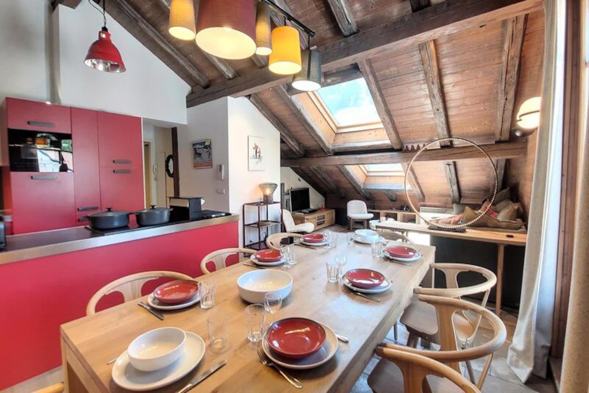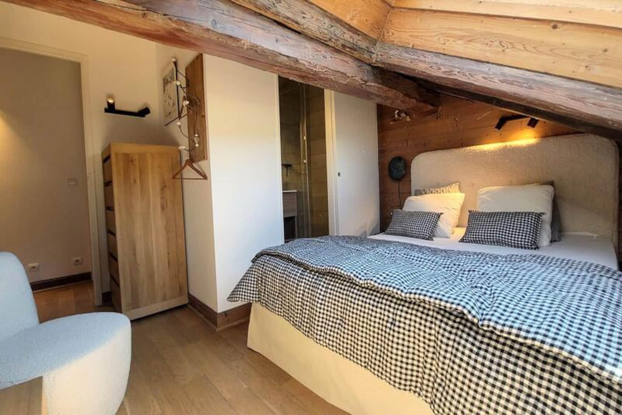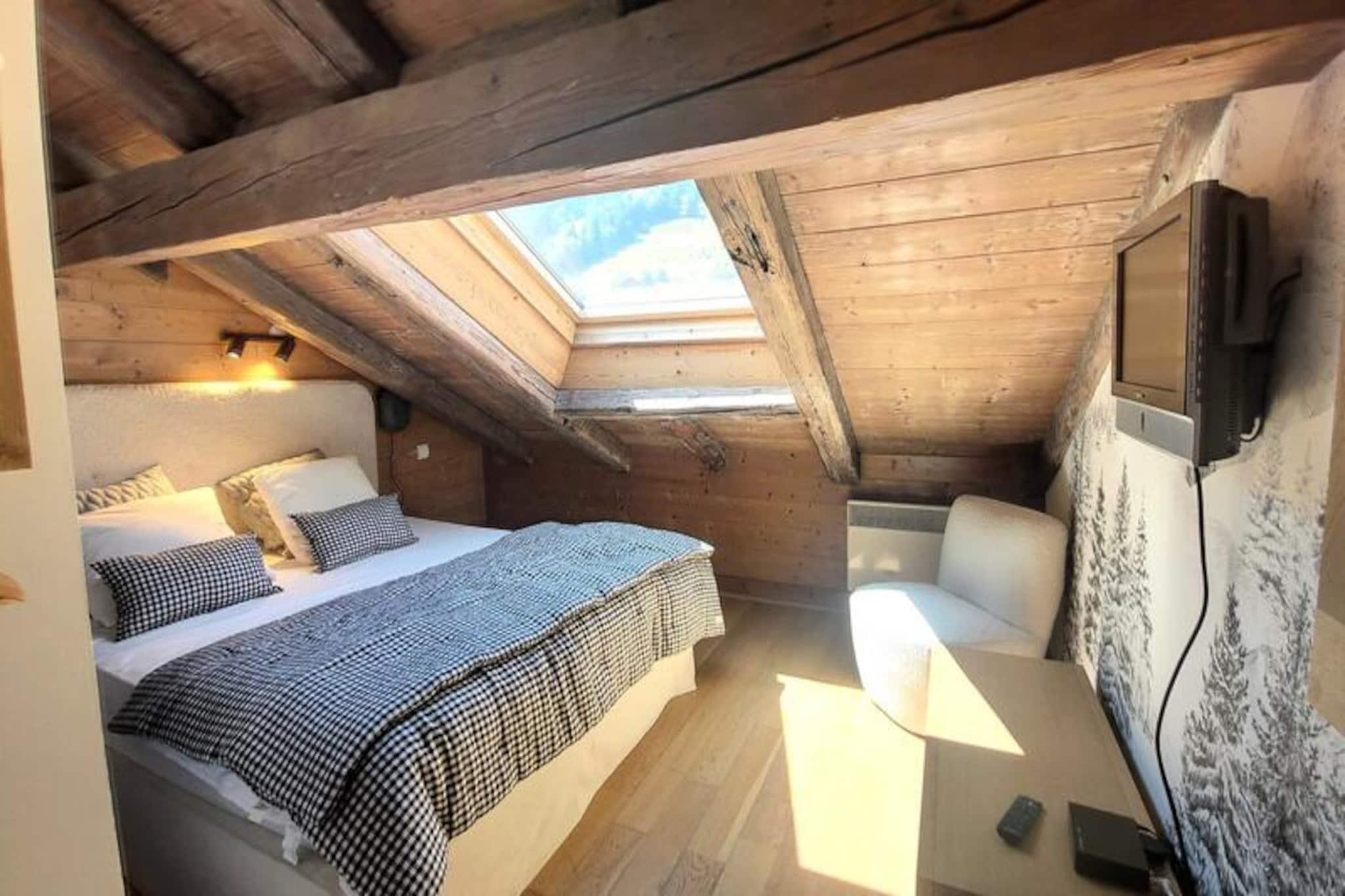 In the heart of the charming old village of Les Gets, this penthouse apartment offers a serene retreat just steps away from the vibrant local life and the Mont Chery ski slopes. Imagine waking up to the picturesque views of the village from your living room, with the gentle hum of alpine life surrounding you. Whether you're here for winter sports or summer adventures, this residence blends authentic Savoyard charm with modern comforts to create an unforgettable holiday experience. \n\nSpanning 70m² of living space and 95m² in total, this 5-room apartment is thoughtfully designed for up to eight guests. The third-floor location, accessible by elevator, ensures privacy and tranquility. The spacious living room features a fully equipped kitchen, a cozy dining area, and a sloping lounge illuminated by a skylight. Four en-suite bedrooms provide ample comfort, including a master suite with a west-facing view, perfect for unwinding after a day of exploration. Modern amenities such as individual heating, televisions in all rooms, and a wood-burning stove add to the warm and inviting atmosphere. \n\nStep outside and find yourself just 100 meters from the village center and 150 meters from the nearest ski slopes. Shops, restaurants, and the French Ski School are all within walking distance, making this location ideal for convenience and adventure. In summer, the area transforms into a haven for hikers and cyclists, with trails weaving through breathtaking alpine landscapes. \n\nWhether you're seeking thrilling ski days, tranquil mountain walks, or simply a cozy space to reconnect with loved ones, this penthouse apartment in Les Gets promises a holiday filled with comfort, charm, and unforgettable memories.