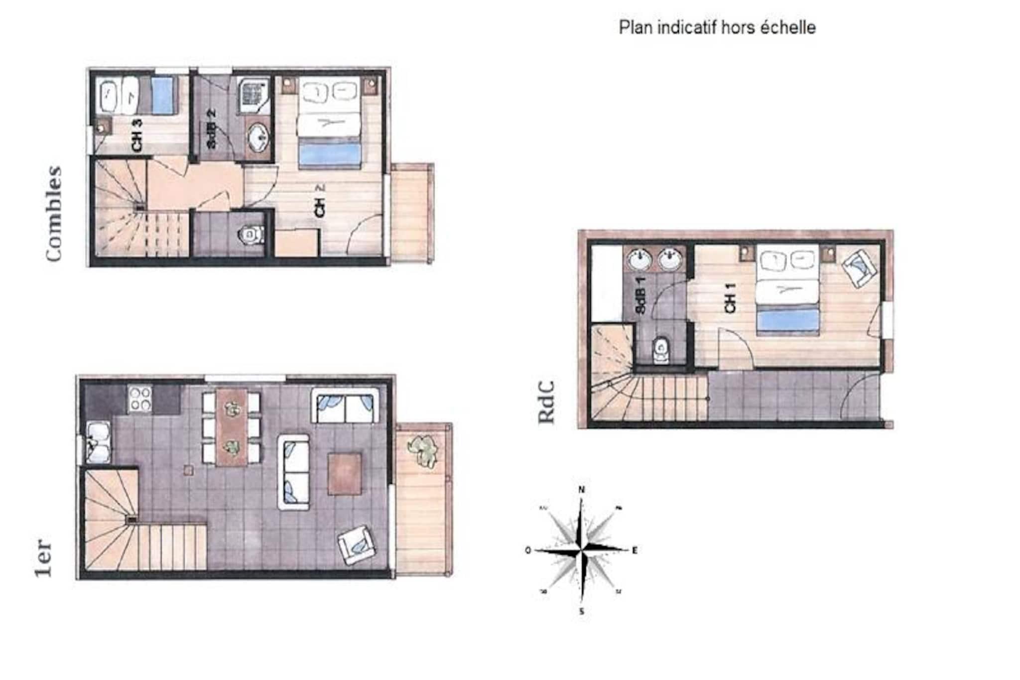 High above the charming village, this exquisite triplex apartment offers a luxurious alpine retreat with breathtaking views of the entire ski area. Bathed in natural light and designed with a harmonious blend of modern comfort and traditional wood-clad charm, this property is a haven for ski enthusiasts and mountain lovers alike. Its southeast-facing orientation ensures you wake up to the golden hues of sunrise over the slopes, setting the perfect tone for your day. Spanning 63.60 m², this 3-star apartment comfortably accommodates up to six guests. The ground floor features a welcoming entrance hall and a master bedroom with a plush double bed that can be converted into two singles, complete with an en-suite shower room and modern amenities like a TV and washer-dryer. The first floor boasts a fully equipped kitchen that opens into a cozy living and dining area, leading to a semi-sheltered balcony with panoramic views. The attic offers a sleeping alcove with bunk beds, an additional double bedroom with balcony access, and a stylish shower room. Modern conveniences such as electric underfloor heating, Wi-Fi, Apple TV, and Bose speakers ensure a comfortable and connected stay. Located just 400 meters from the village center and shops, and 650 meters from the nearest ski slopes, this apartment is perfectly positioned for both convenience and adventure. The French Ski School is a short 850-meter stroll, and a shuttle stop is just 230 meters away, making it easy to explore the area. After a day on the slopes, unwind in the comfort of your private ski locker, or enjoy a warm drink on the balcony as you take in the stunning alpine vistas. With its combination of prime location, exceptional amenities, and cozy ambiance, this triplex apartment is the ideal choice for families or groups seeking an unforgettable mountain getaway. Let Kilimandjaro be your gateway to the ultimate alpine experience.