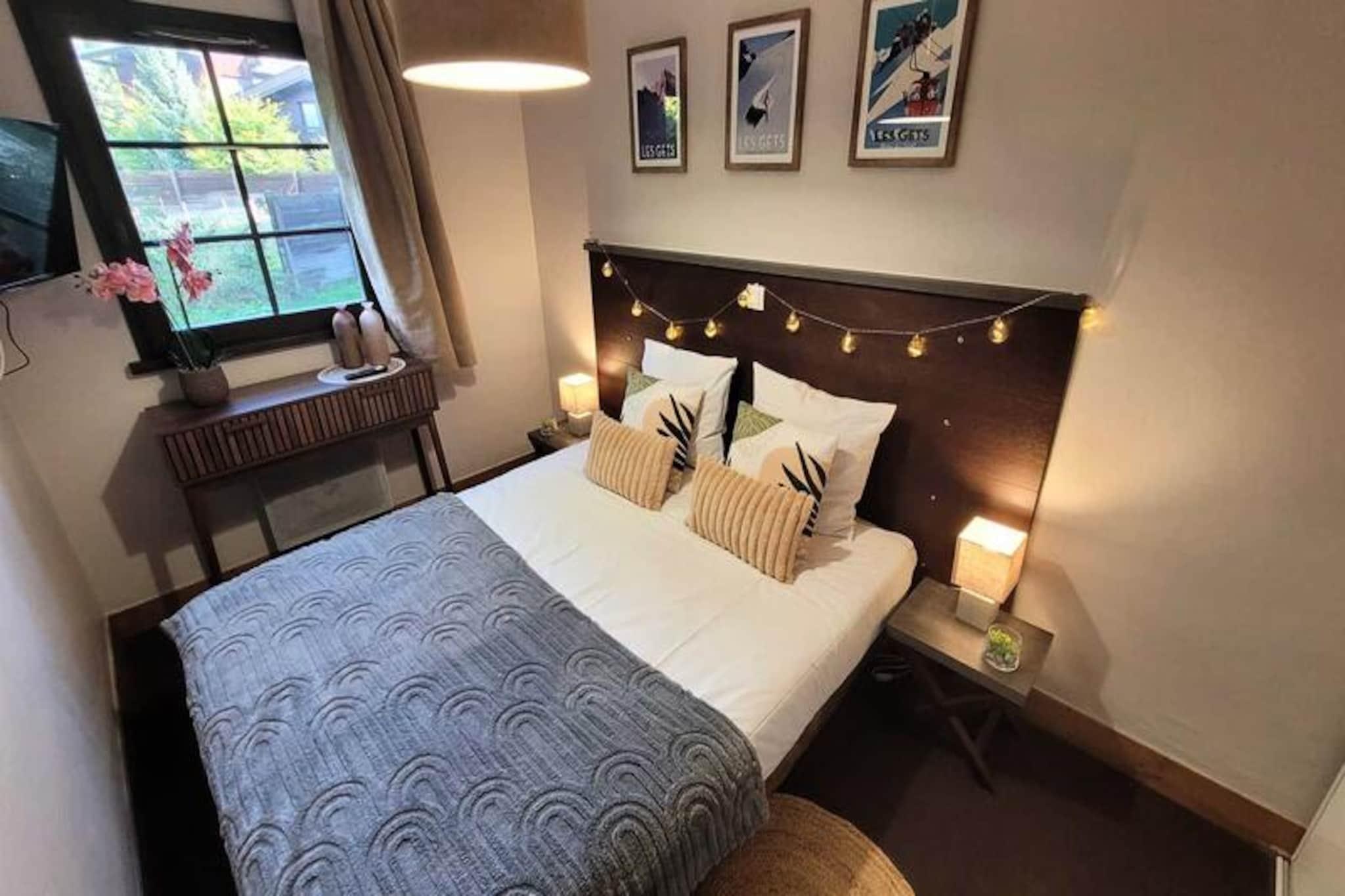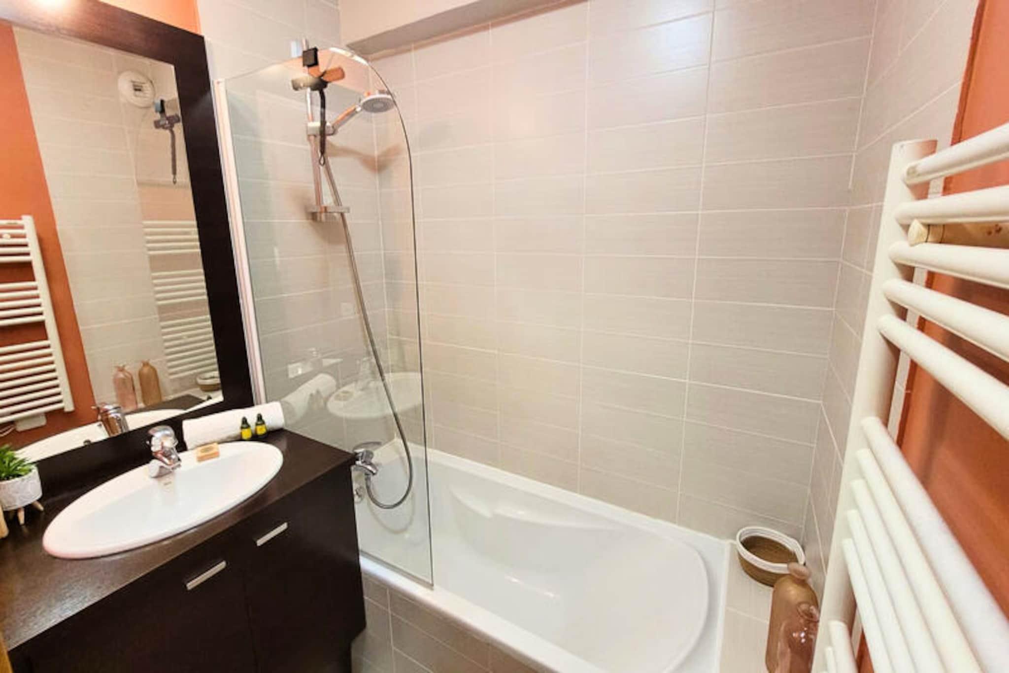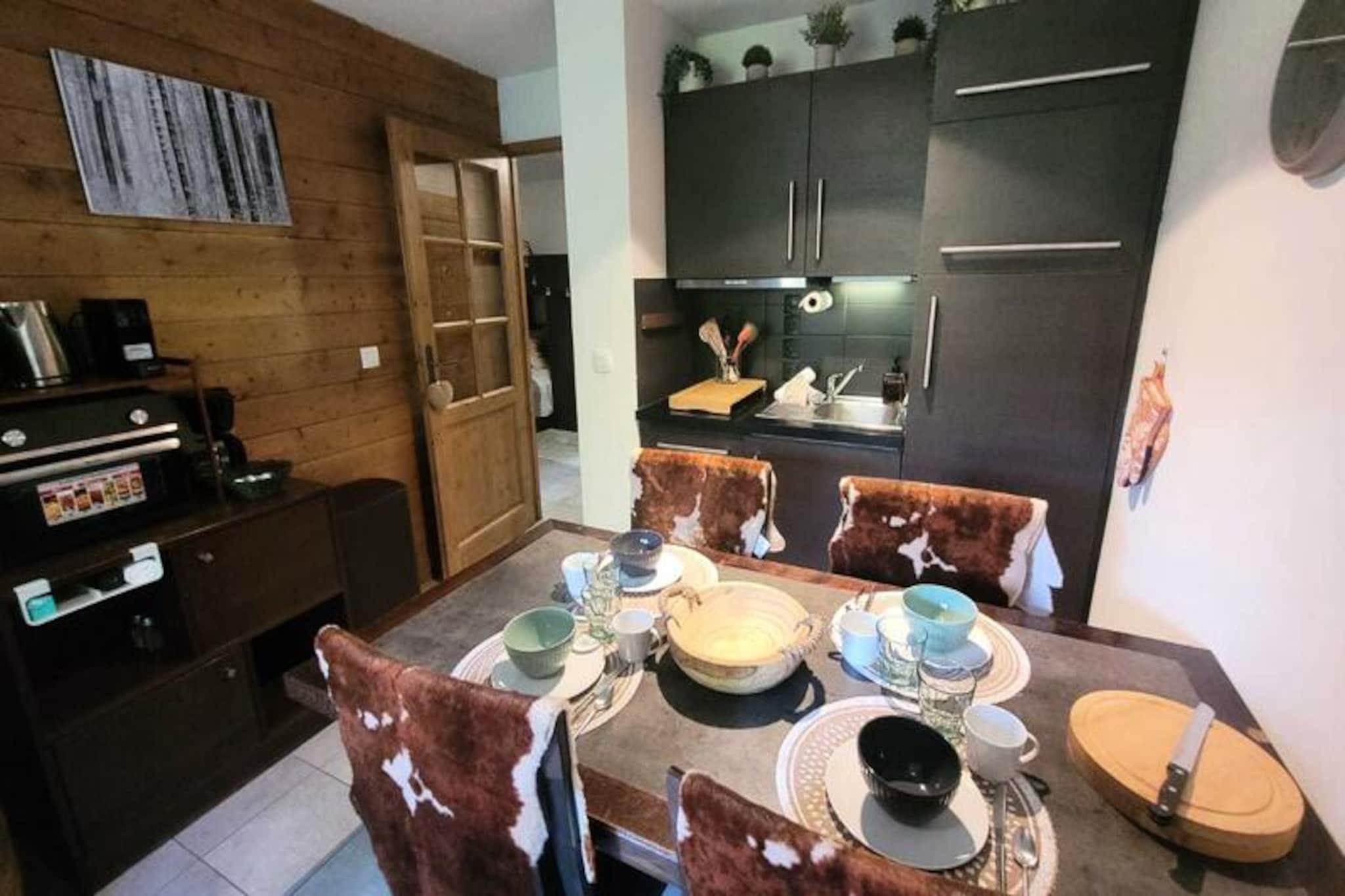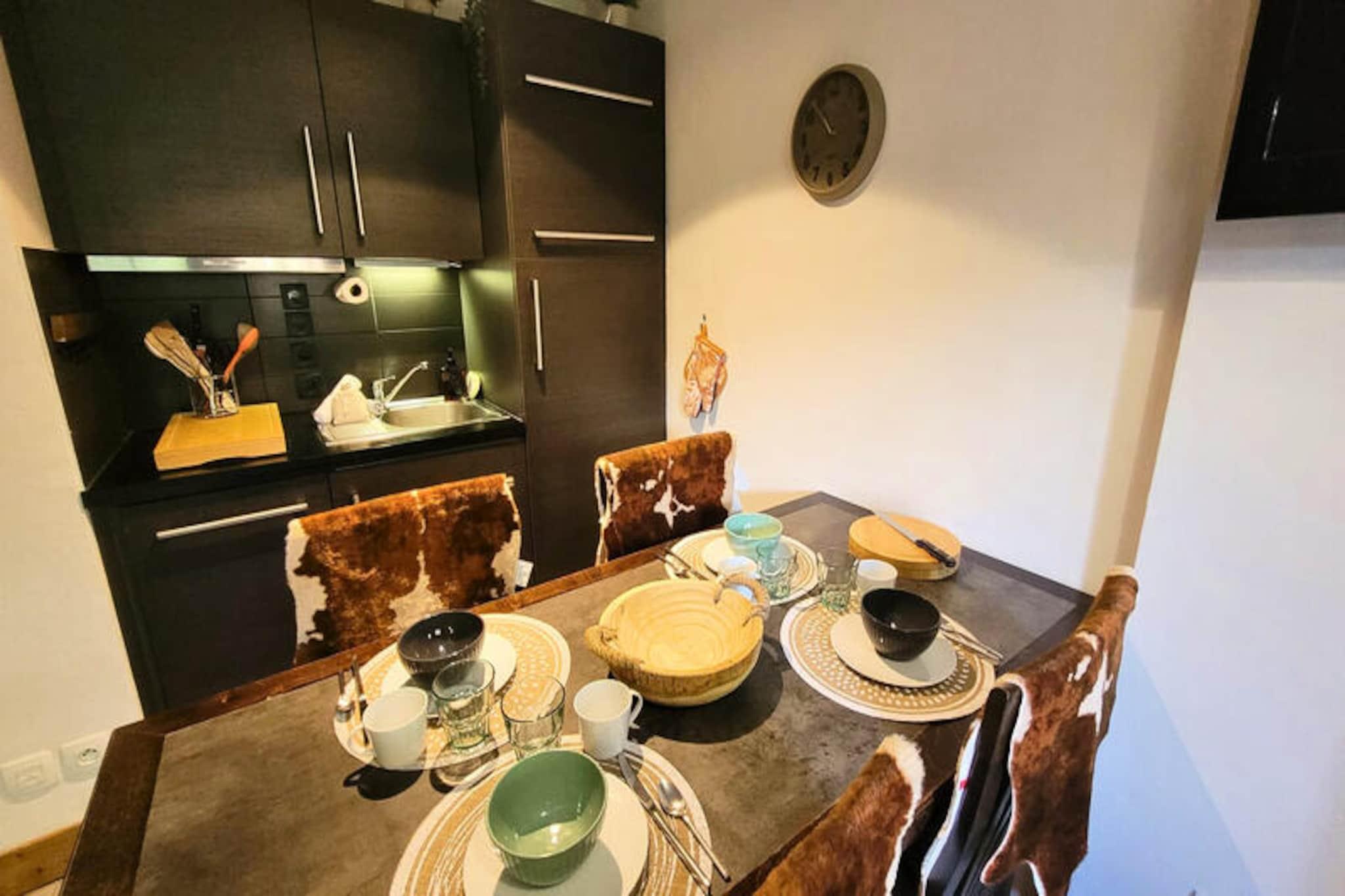 Amid the serene beauty of the French Alps, this elegant apartment offers a harmonious blend of comfort and convenience. Situated within a luxury residence featuring heated indoor and outdoor pools and a spa area, it’s the perfect retreat for those seeking relaxation after a day of alpine adventures. Just 400 meters from the village center and 450 meters from the nearest ski slopes, this property ensures easy access to both vibrant local life and thrilling outdoor activities. The nearby shuttle stop, only 150 meters away, makes exploring the area effortless. \n\nDesigned to accommodate up to four guests, the apartment boasts a thoughtfully arranged layout with an inviting living room that opens onto a fully equipped kitchen. The space includes a cozy sofa, television, dining area, and balcony access, ideal for unwinding with breathtaking mountain views. The en-suite double bedroom features a plush 160 x 200 cm bed, storage, and a private shower room, while the children’s sleeping area offers two single beds, one of which is elevated. Two bathrooms, a separate toilet, and modern amenities such as a refrigerator, dishwasher, stovetop, and coffee machine ensure a comfortable and stress-free stay. \n\nThe residence’s prime location places you close to essential facilities like shops (300 meters), the ESF ski school (700 meters), and even a doctor’s office (650 meters). Whether you’re here to ski, explore the picturesque surroundings, or simply relax in the spa, this property caters to every need. In summer, the region transforms into a haven for hiking, biking, and discovering the natural wonders of the Alps. \n\nWith included services like end-of-stay cleaning, linens, and optional extras such as breakfast baskets and intermediate cleaning, this apartment is a gateway to unforgettable alpine experiences. Whether you’re visiting in winter or summer, it’s a place where memories are made.
