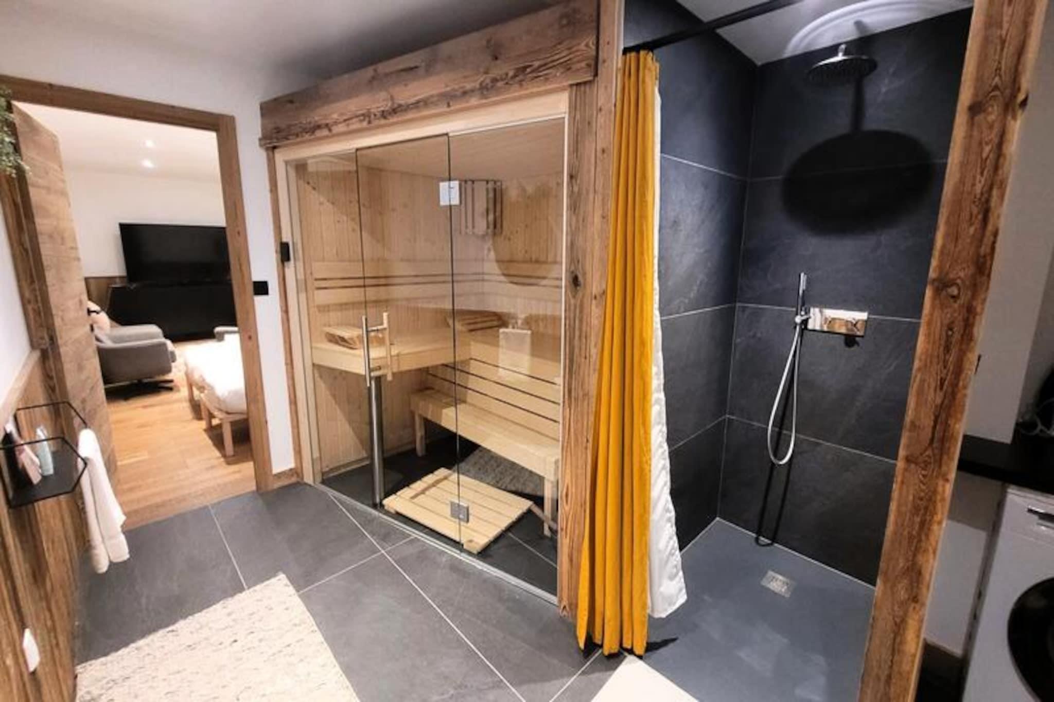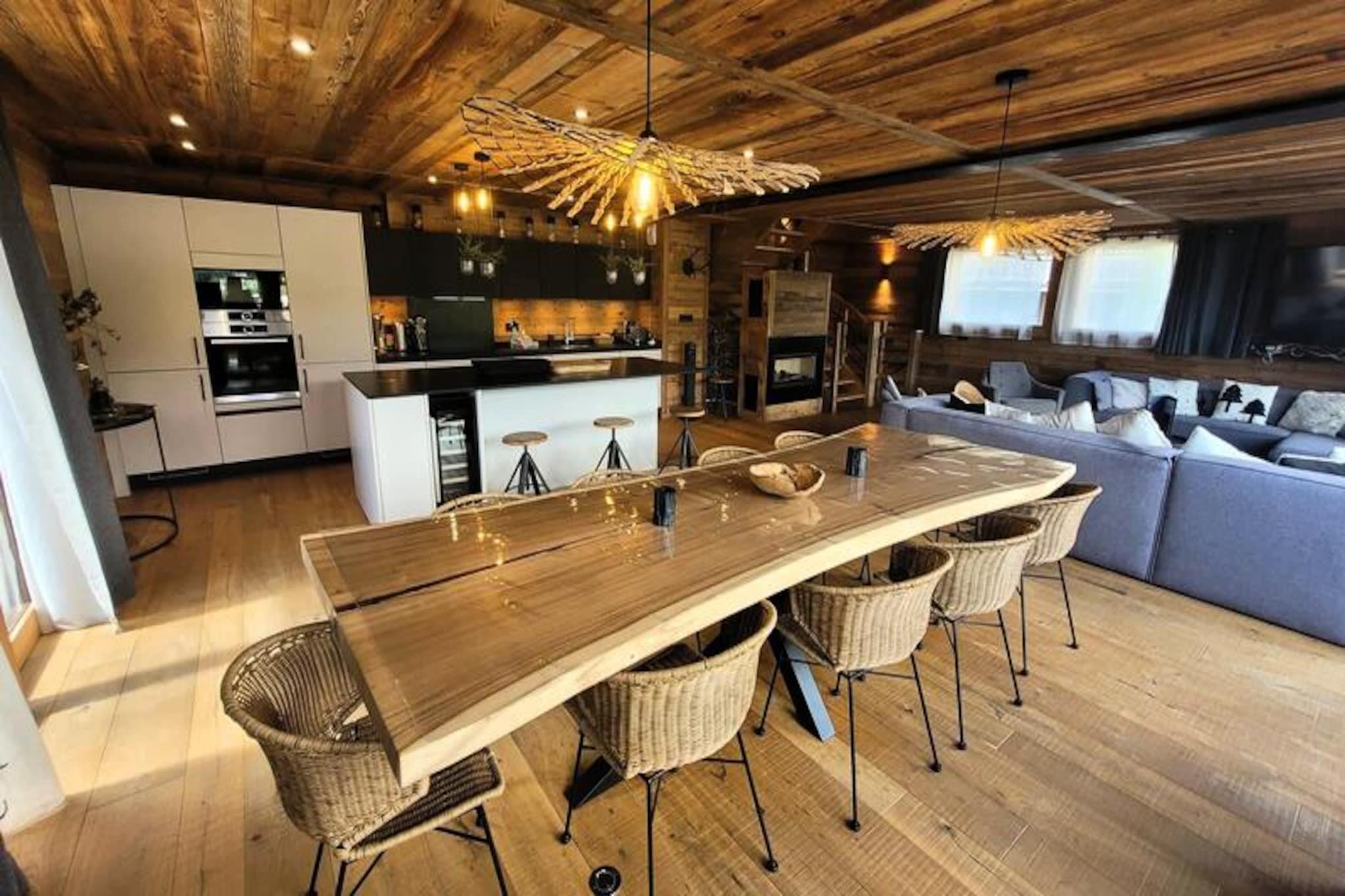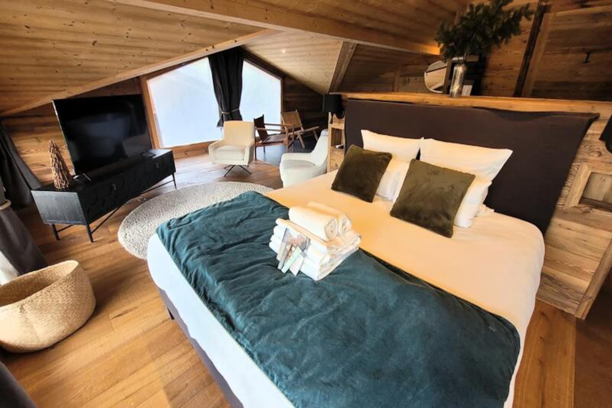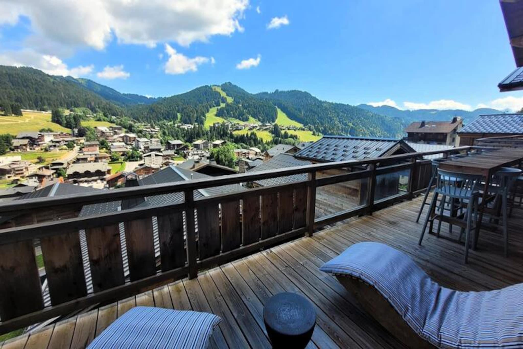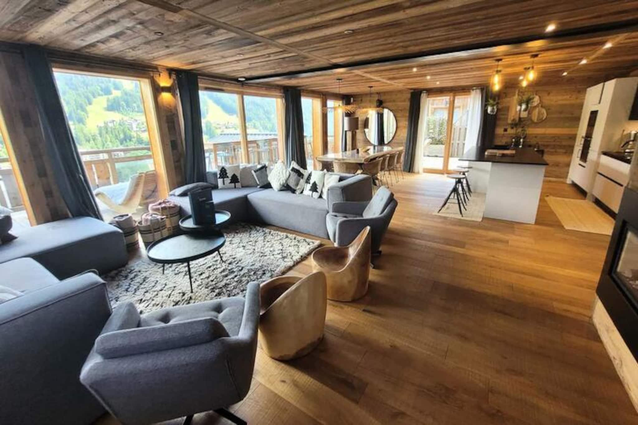 Perched on the serene hills of Les Gets, this luxurious 5-star chalet offers an unparalleled alpine retreat. With breathtaking panoramic views of the surrounding slopes and the charming village below, this property combines the best of traditional Savoyard architecture and contemporary elegance. Bathed in natural light, every corner of this chalet exudes sophistication and warmth, making it the perfect haven for families or groups of friends seeking a memorable mountain escape. The peaceful setting ensures tranquility, while the proximity to the village center and ski slopes keeps you connected to all the action. Spanning four levels, the chalet accommodates 12 to 14 guests in utmost comfort. The first level features three beautifully designed bedrooms, including a bunk room perfect for children, all with en-suite facilities and access to a sun-drenched terrace. The second level boasts a grand living area with a fully equipped kitchen, opening onto two south-facing terraces. Here, you’ll find an outdoor dining space and a private jacuzzi to unwind after a day on the slopes. The top floor houses a stunning master suite with cathedral windows offering sweeping views, while the lower level includes a cozy cabin bedroom, a sauna with a shower, and a laundry area. Equipped with high-end amenities such as a gas fireplace, underfloor heating, smart TVs, and a wine cellar, this chalet ensures a seamless blend of luxury and practicality. Guests can also enjoy the convenience of two indoor garages, a ski room, and an elevator. Additional services like end-of-stay cleaning, linens, and bathrobes are included, making your stay effortless and indulgent. Located just 450 meters from the village center and 650 meters from the ski slopes, this chalet offers the perfect balance of seclusion and accessibility. Whether you’re skiing in winter, hiking in summer, or simply soaking in the jacuzzi with a view, this property promises an unforgettable alpine experience.