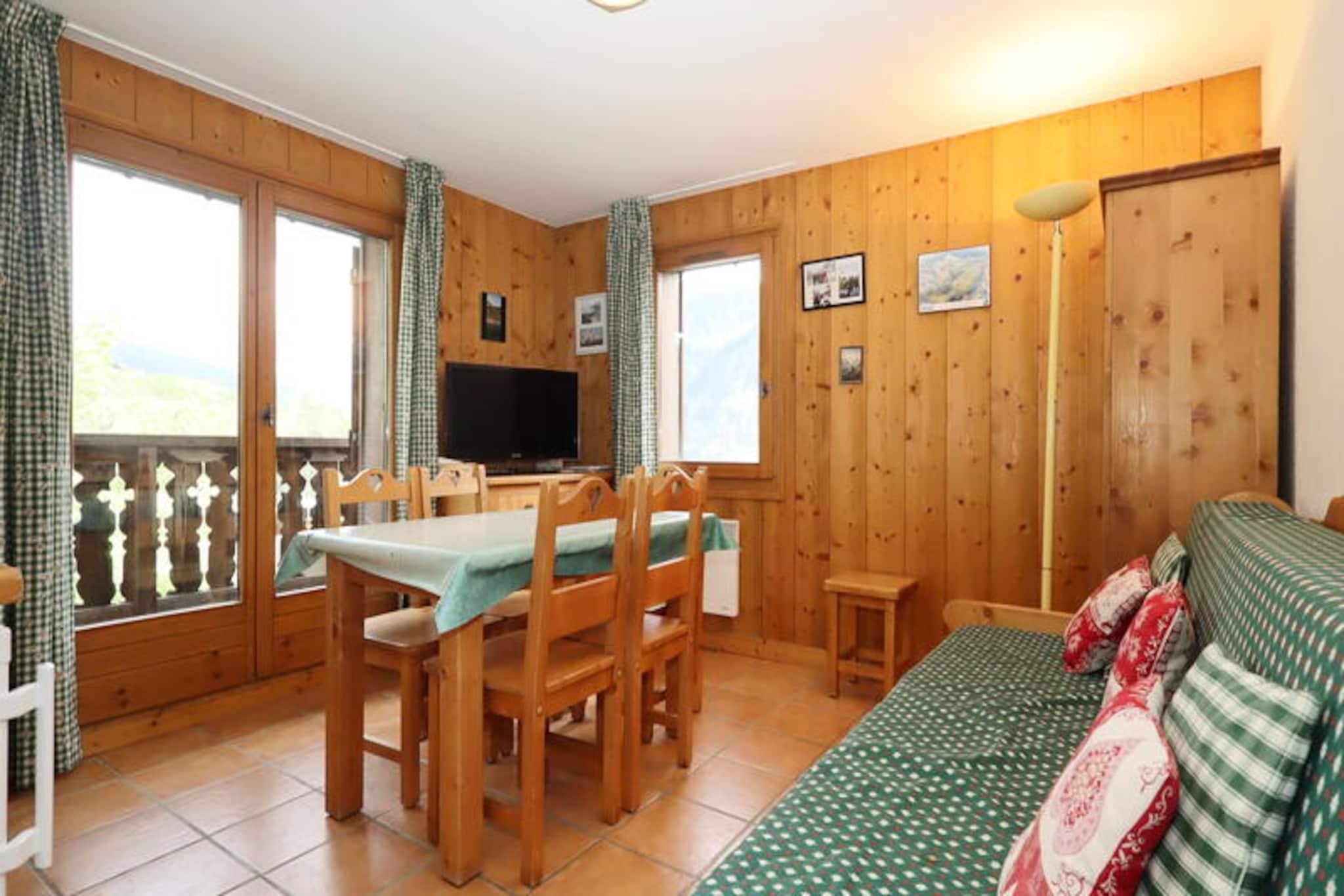 In the charming village of Les Houches, surrounded by the majestic peaks of the Chamonix Valley, this cozy 2-bedroom apartment offers a delightful alpine retreat. Just 70 meters from the Bellevue cable car and 800 meters from the village center, it’s perfectly positioned for both adventure and relaxation. Whether you’re here to carve through fresh powder in winter or explore scenic trails in summer, this location promises unforgettable mountain moments. The nearby bus stop and cable cars ensure seamless access to the region’s attractions, while the peaceful surroundings invite you to unwind. \n\nThe apartment, situated on the second floor, is thoughtfully designed to accommodate up to six guests. The living room features a comfortable pull-out sofa bed, a television, and a dining area, creating a welcoming space to gather after a day outdoors. The kitchenette is fully equipped with an oven, electric burners, a refrigerator, a dishwasher, and a coffee maker, making it easy to prepare meals at home. The sleeping arrangements include a cozy double bedroom and a second bedroom with bunk beds, perfect for families or groups of friends. A modern bathroom with a shower, sink, and toilet completes the layout. \n\nAdditional amenities such as underground parking, a ski locker, and optional services like Wi-Fi and linen rentals add to the convenience of your stay. The apartment also boasts a private balcony where you can sip your morning coffee while soaking in the crisp mountain air. \n\nWith its proximity to the Bellevue cable car, local restaurants, bakeries, and ski shops, this residence is an ideal base for exploring the wonders of the Mont Blanc region. Whether you’re seeking thrilling slopes, tranquil hikes, or simply a serene escape in the Alps, this apartment offers the perfect blend of comfort and location for your next getaway.