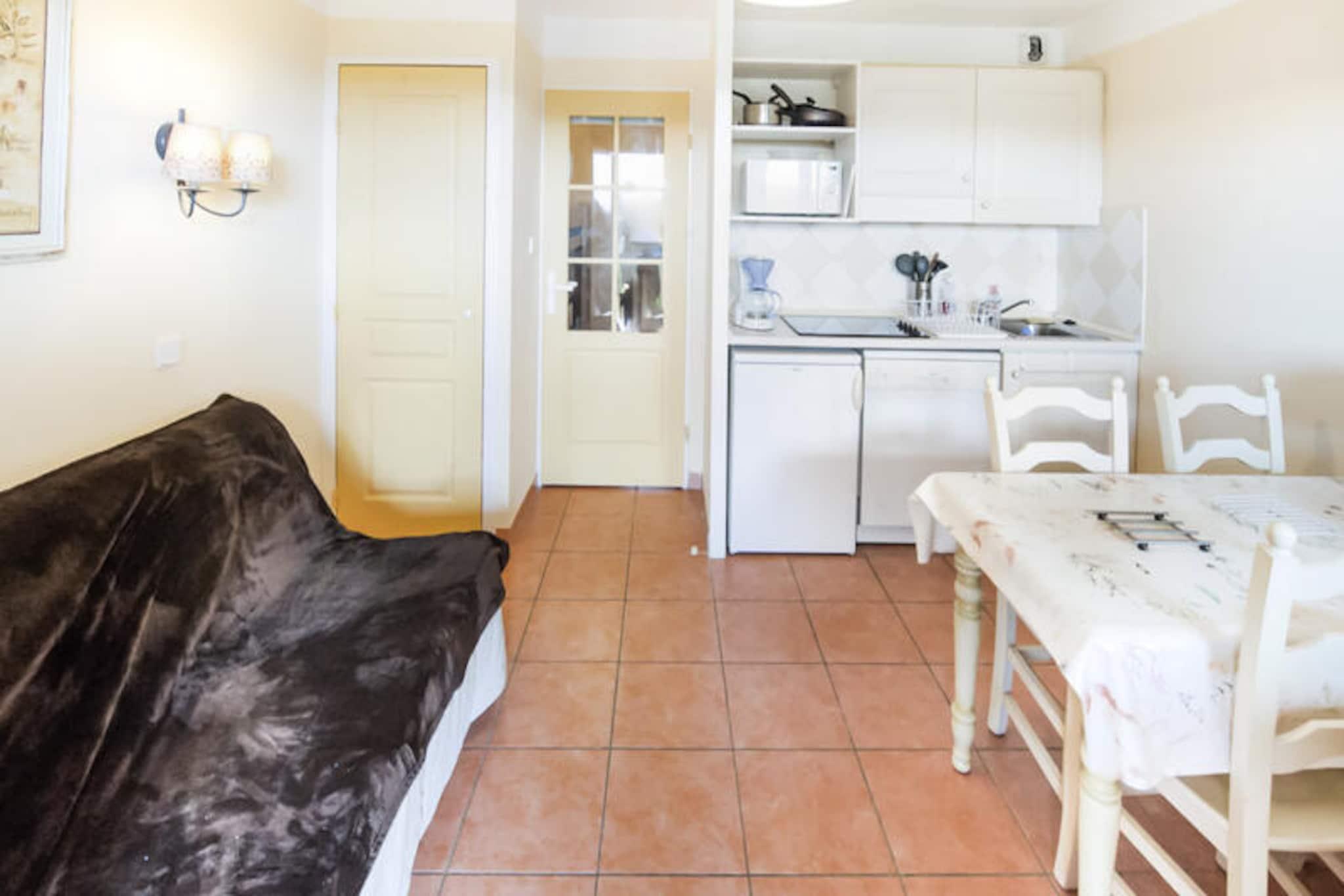 This cozy studio apartment offers a comfortable stay for up to 4 people, featuring a living room with a convertible sofa bed, and a cabin area with a bunk bed. The apartment also includes a bathroom with a bathtub and a separate toilet. It comes equipped with essential amenities, including a TV, iron, safe, and storage space. The apartment offers a quiet environment with a view of the surrounding vegetation. Pets are allowed upon request, and bed linen and towels are available for an additional charge. End-of-stay cleaning is mandatory and to be paid on arrival. Located in the Domaine des Issambres district, this apartment provides easy access to the first beaches, just 5 km away. The residence offers a free 330 m² swimming pool, open from June 1 to September 30, 2024, perfect for relaxing under the sun. You can also explore nearby attractions, with Sainte-Maxime only 10 km away, and many renowned seaside resorts of the C?te d'Azur just a short distance away. The apartment features a well-equipped kitchen area open to the living room, allowing for convenient dining. It also has a furnished covered terrace with a table, 4 chairs, and a parasol, perfect for outdoor meals. Parking is free and available on-site, providing easy access to the apartment.