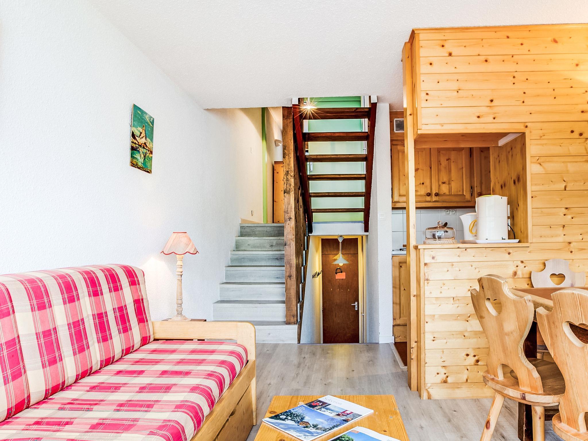 "Brelin La Challe 635", 3-room apartment 55 m2 on 3 levels on 6th floor. Spacious, beautiful furnishings: entrance hall with separate WC. Living/dining room with 1 pull-out bed (2 pers. 2 x 80 cm), TV (flat screen), DVD. Exit to the balcony. Kitchenette (oven, dishwasher, 2 ceramic glass hob hotplates, kettle, electric coffee machine). Upper floor: 1 room with 2 beds (80 cm). Bathroom. Heating. 2nd upper floor: 1 room with 3 beds (80 cm). Exit to the balcony. 2 large balconies, south facing position. Very beautiful view of the mountains and the ski run. Facilities: iron. Internet (WiFi, extra). Please note: maximum 1 pet/ dog allowed. Smoke alarm. The accommodation is located at the entrance of the residence and on the 6th floor side tracks. 73257005021WF