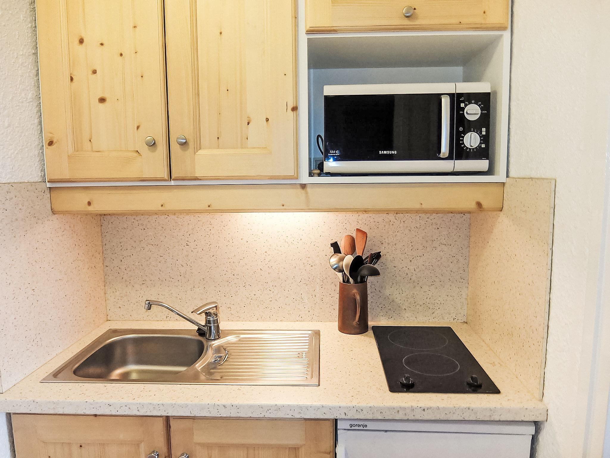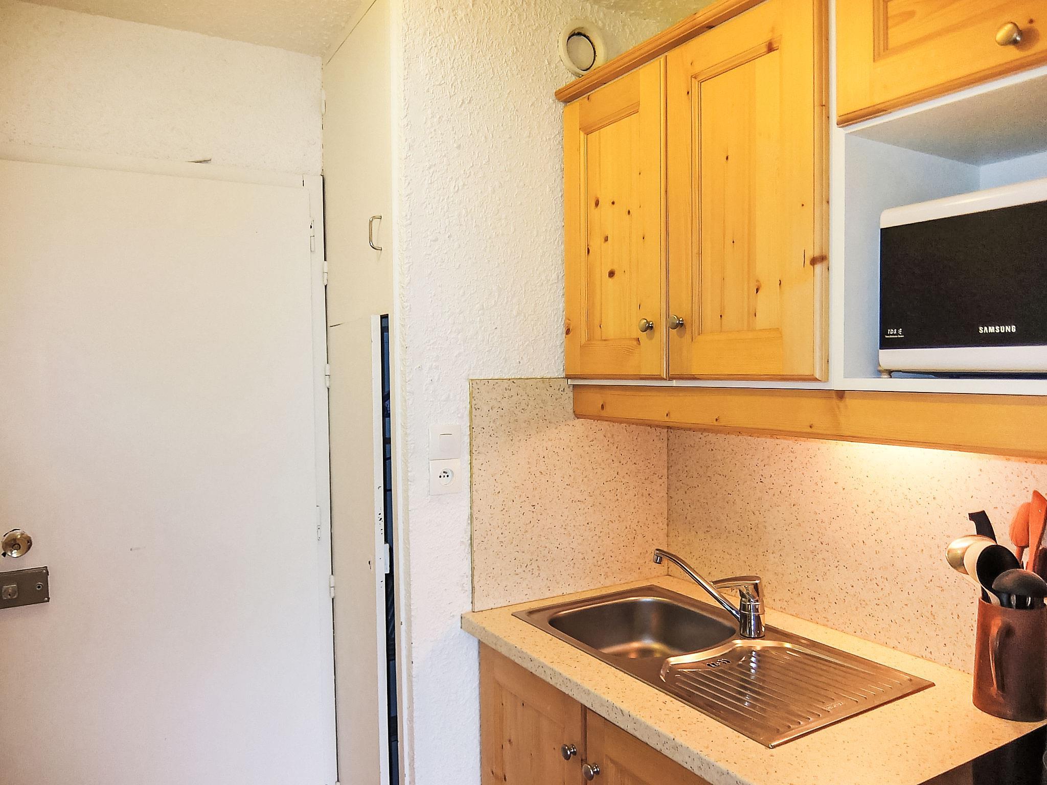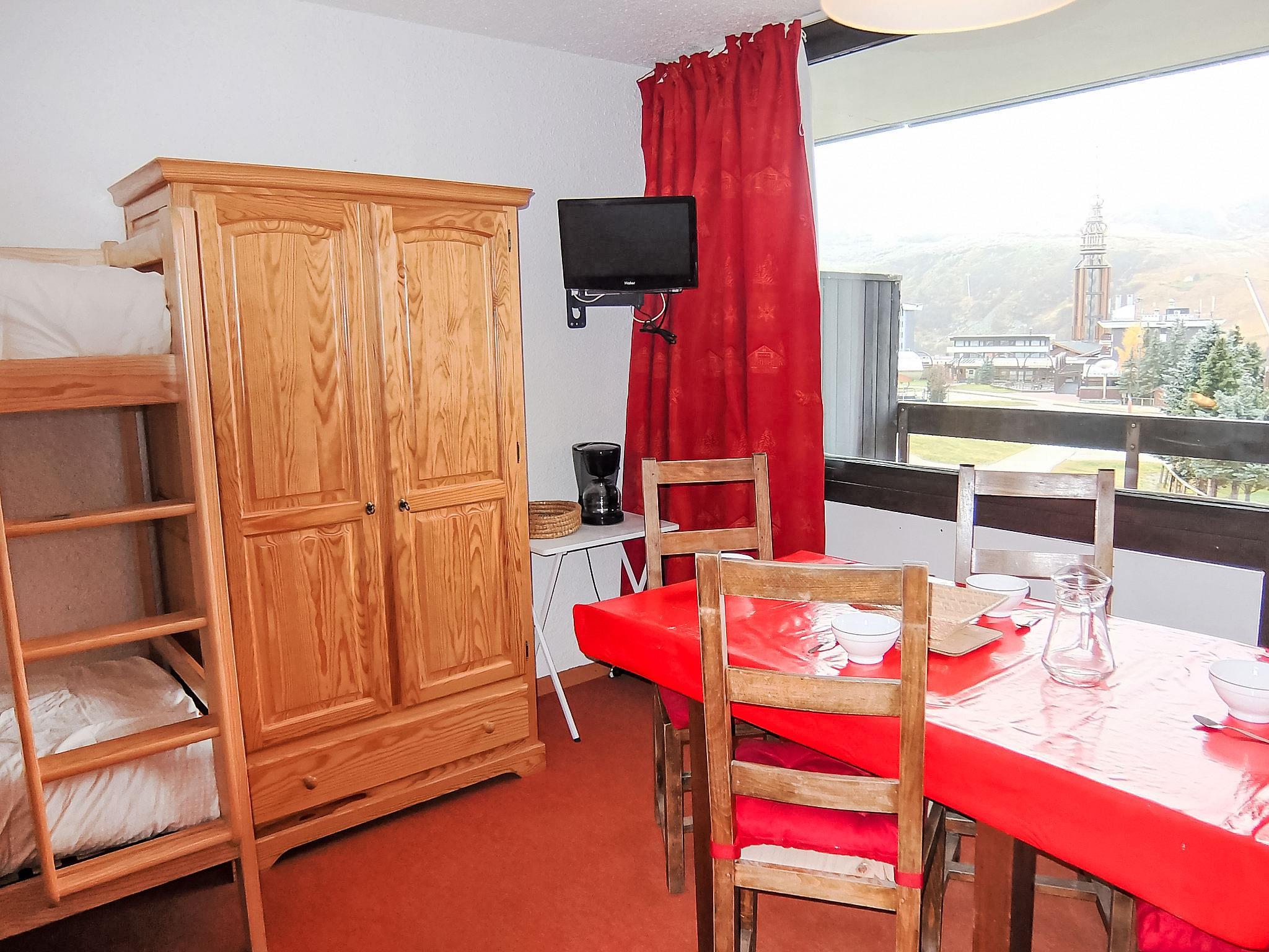 "Aravis 101", 1-room apartment 20 m2 on 1st floor. Living/dining room with 1 double sofabed (140 cm, length 190 cm), 1 x 2 bunk beds (80 cm, length 190 cm), TV (flat screen). Exit to the balcony. Kitchenette (2 ceramic glass hob hotplates, microwave, electric coffee machine). Shower/WC. Balcony, south-west facing position. View of the mountains and the ski run. Facilities: Internet (WiFi, extra). Garage space n 24, height 180 cm. Please note: maximum 1 pet/ dog allowed. Smoke alarm. Ski storage: 1st floor, after the mailboxes. 73257002960HT