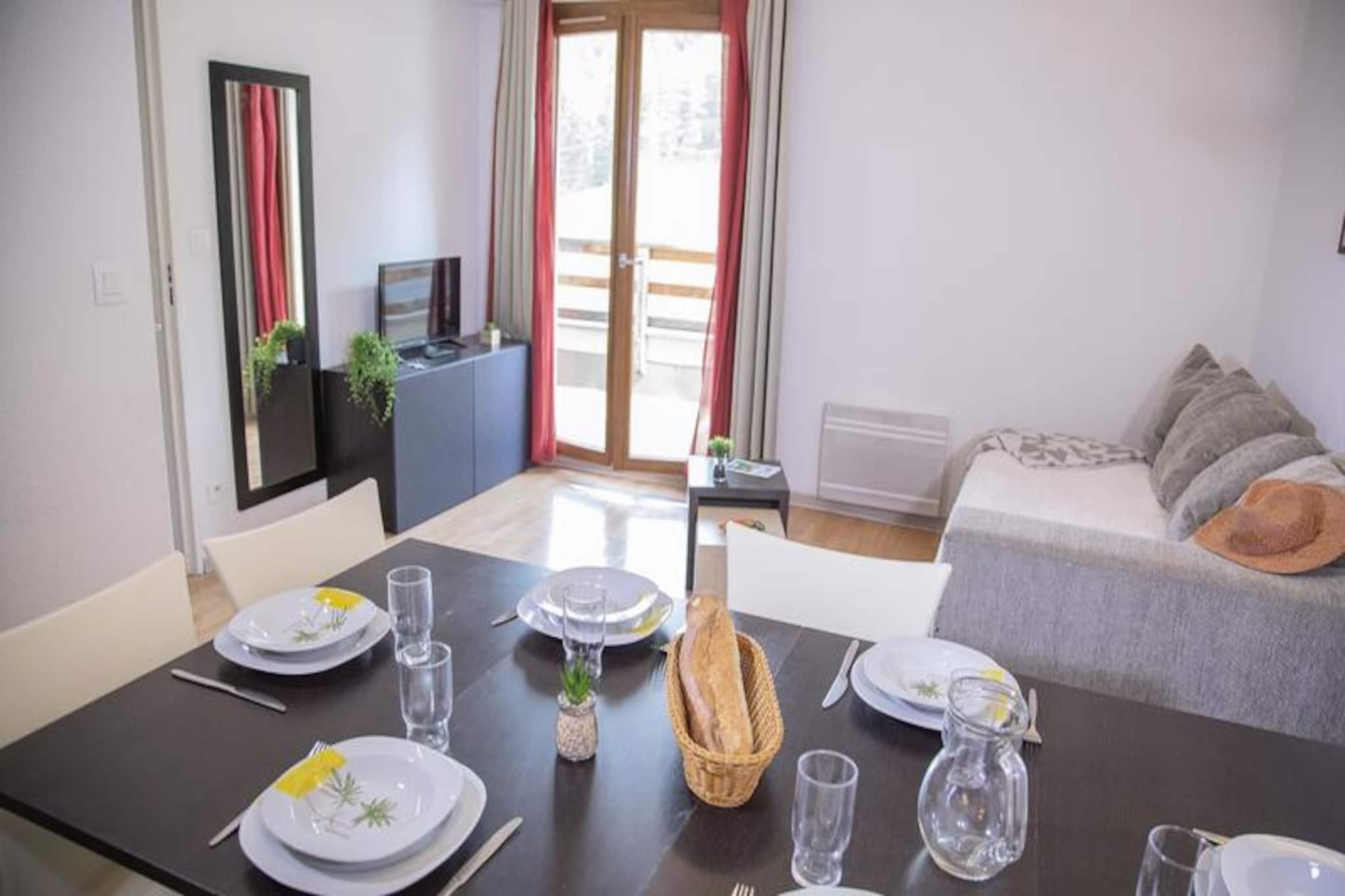 High above the serene slopes of Les Orres, the Residence Les Terrasses du Soleil d'Or offers a perfect blend of mountain charm and modern comfort. Imagine waking up to the crisp alpine air, stepping onto your balcony to admire the snow-dusted peaks, and starting your day with the Préclaux chairlift just 50 meters away. Whether you're here for thrilling ski adventures or tranquil summer hikes, this residence is designed to make every moment unforgettable. Families will love the proximity to the daycare center and Snow Garden, ensuring even the youngest guests can enjoy their mountain escape. \n\nInside, the apartment is thoughtfully arranged to accommodate up to six guests. The living room features a cozy double sofa bed, while the bedroom offers a restful double bed. A separate sleeping alcove with bunk beds ensures privacy and comfort for all. The kitchen is fully equipped for preparing hearty meals after a day of exploring, and the balcony provides a picturesque view of the slopes. The residence also boasts a heated indoor pool with integrated whirlpools and an outdoor terrace, perfect for unwinding in both winter and summer. \n\nStep outside and discover a vibrant village atmosphere with restaurants, bars, and shops just a stone's throw away. From local produce stores to ski schools and equipment rentals, everything you need is within easy reach. For those seeking adventure, the area offers marked trails for hiking and snowshoeing, dog sledding, paragliding, and guided nature outings. Families can enjoy sledding, a bungee trampoline, and even a cinema for cozy evenings. \n\nWhether you're chasing powder in winter or exploring lush trails in summer, Residence Les Terrasses du Soleil d'Or is your gateway to the beauty and excitement of Les Orres. Make your mountain dreams come true in this idyllic alpine retreat.