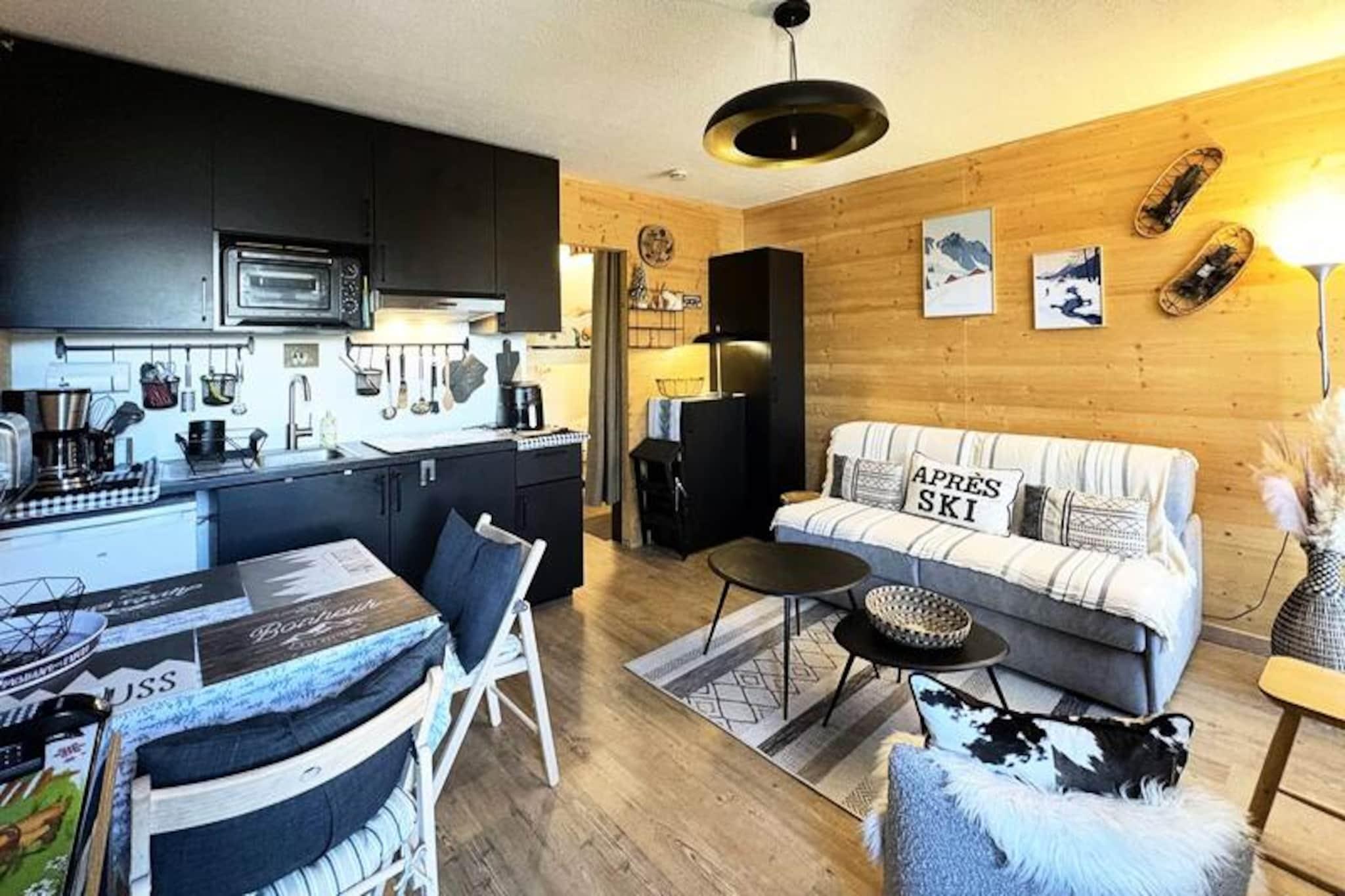 In the serene village of Le Mélezet, this beautifully renovated ground-floor studio apartment invites you to experience the charm of the French Alps. Imagine waking up to stunning mountain views from your northwest-facing balcony, with the crisp alpine air rejuvenating your senses. Whether you're here for a winter escape or a summer retreat, this cozy haven offers the perfect base for your adventures. A private outdoor parking spot ensures convenience, while the free local shuttle bus makes it easy to explore the nearby resort center, just a 5-minute drive away. \n\nStep inside to discover a thoughtfully designed living space with a large bay window that floods the room with natural light. The studio comfortably accommodates up to four guests, featuring a sofa bed (140 cm) in the living area and a sleeping alcove with two bunk beds. The open-plan kitchenette is fully equipped, allowing you to prepare delicious meals after a day of exploring. Modern amenities such as Wi-Fi and a washing machine add to the comfort and practicality of your stay. For winter sports enthusiasts, a dedicated ski locker in the residence ensures your gear is always ready for the slopes. \n\nLe Mélezet offers a tranquil escape while keeping you close to the action. The surrounding area is a paradise for outdoor enthusiasts, with ski slopes, hiking trails, and breathtaking alpine landscapes just moments away. After a day of adventure, unwind on your balcony, taking in the picturesque views as the sun sets over the mountains. This charming studio is more than just a place to stay—it's a gateway to unforgettable memories in the heart of the Alps.