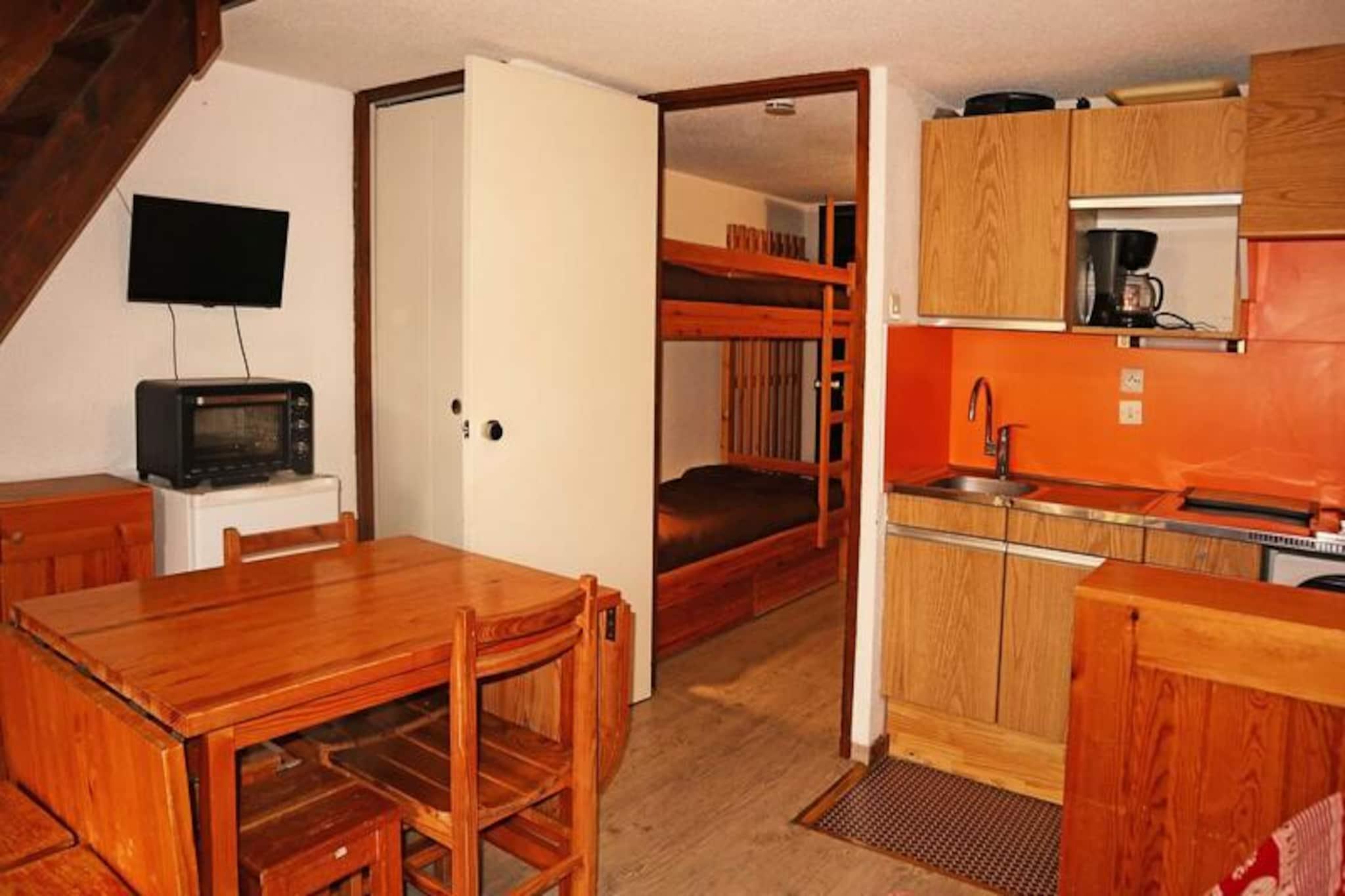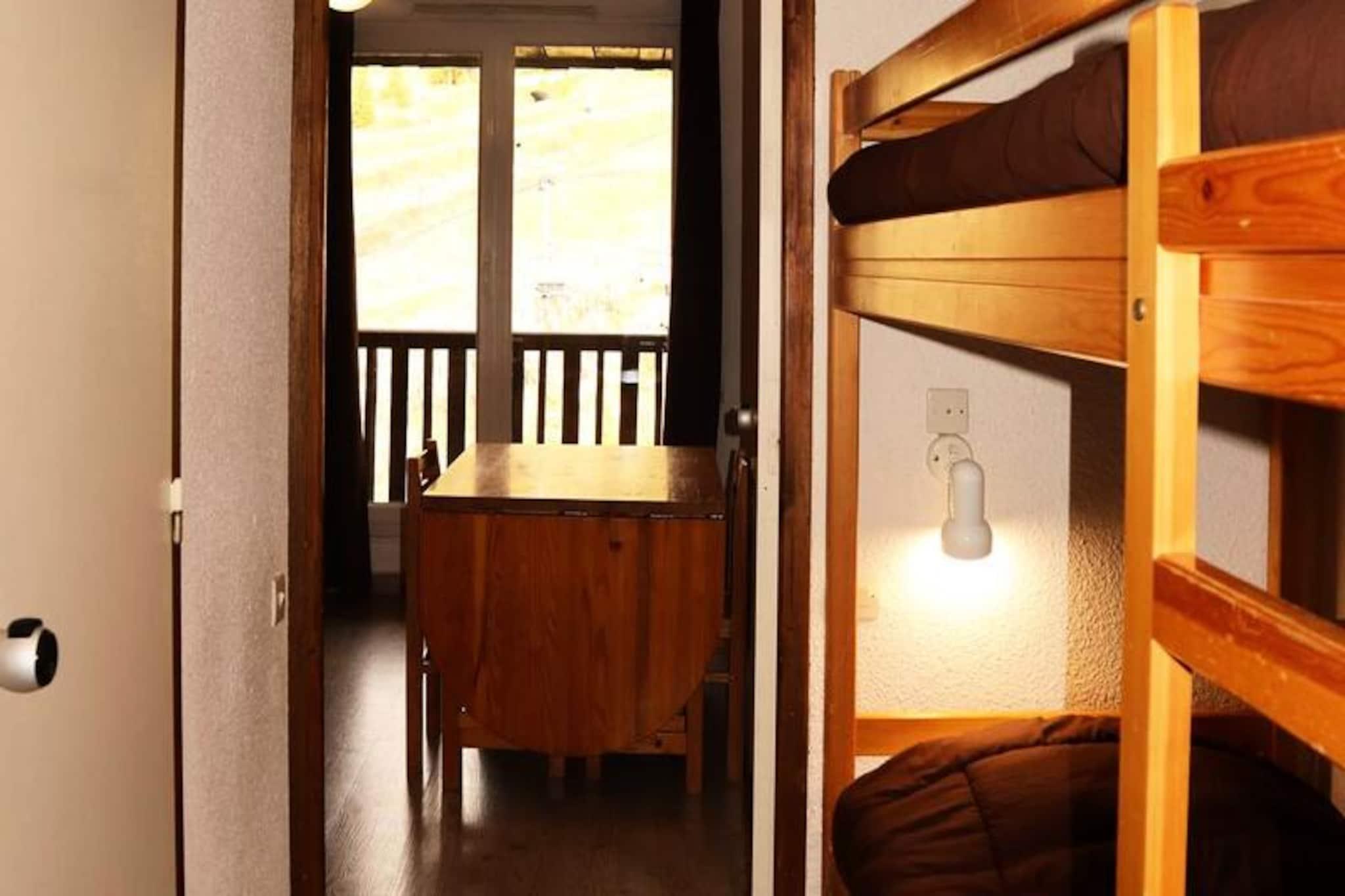 High above the serene valleys of the French Alps, Residence Le Pouzenc offers a charming retreat for travelers seeking both adventure and tranquility. With its prime location just five minutes from the nearest chairlift and local shops, this studio apartment is the perfect base for exploring the breathtaking alpine landscapes. Whether you're here to carve through pristine slopes or to bask in the summer sun, the residence provides a seamless blend of comfort and convenience. From the east-facing balcony, soak in the crisp mountain air and let the panoramic views inspire your next adventure. \n\nThe apartment, located on the fourth floor, is thoughtfully designed to accommodate up to six guests. The entrance features two cozy single bunk beds, while the living room invites relaxation with a double sofa bed and an open-plan kitchenette equipped for preparing hearty meals after a day in the great outdoors. A wooden staircase leads to a mezzanine with two additional single beds, creating a warm and inviting space for families or groups of friends. The bathroom and separate WC add to the practicality of the layout, ensuring a comfortable stay for all. \n\nJust moments away, you'll find the vibrant heart of the village with its array of shops, restaurants, and après-ski options. In winter, the nearby slopes promise unforgettable skiing experiences, while summer unveils a paradise of hiking trails, mountain biking routes, and scenic picnic spots. The paid outdoor municipal parking ensures hassle-free access to your alpine escape. \n\nWhether you're chasing powdery peaks or tranquil mountain vistas, Residence Le Pouzenc invites you to create lasting memories in the enchanting embrace of the French Alps.