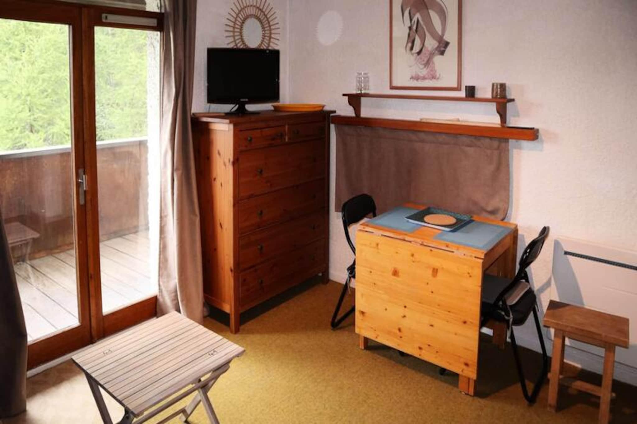 High above the serene valley, this charming studio apartment offers a cozy retreat for adventurers and families alike. Situated on the 4th floor of a well-maintained residence, it boasts ski-in/ski-out convenience, making it the perfect base for exploring the pristine slopes of the French Alps. Whether you're here for winter sports or summer hikes, the breathtaking views from the east-facing balcony will inspire every moment of your stay. Imagine sipping your morning coffee as the sun rises over the valley, casting golden hues across the snowy peaks or lush green trails below. \n\nInside, the studio is thoughtfully designed to maximize comfort and functionality. The entrance hall features two single bunk beds, ideal for children or additional guests. The living room is equipped with a double sofa bed, providing a relaxing space to unwind after a day of adventure. The open-plan kitchenette invites you to prepare hearty meals, while the modern shower room with WC ensures convenience throughout your stay. Warm heating adds to the cozy atmosphere, making this apartment a welcoming haven after a day on the slopes or trails. \n\nFamilies will especially appreciate the proximity to the children's snow garden and daycare, ensuring little ones are entertained and cared for while parents enjoy the nearby ski runs. The residence’s location also offers easy access to local amenities, including shops, restaurants, and ski schools, ensuring everything you need is just steps away. \n\nWhether you're chasing powder in winter or exploring alpine meadows in summer, this studio apartment is your gateway to unforgettable memories in the heart of the French Alps. Let the beauty of the valley and the convenience of this property make your holiday truly special.