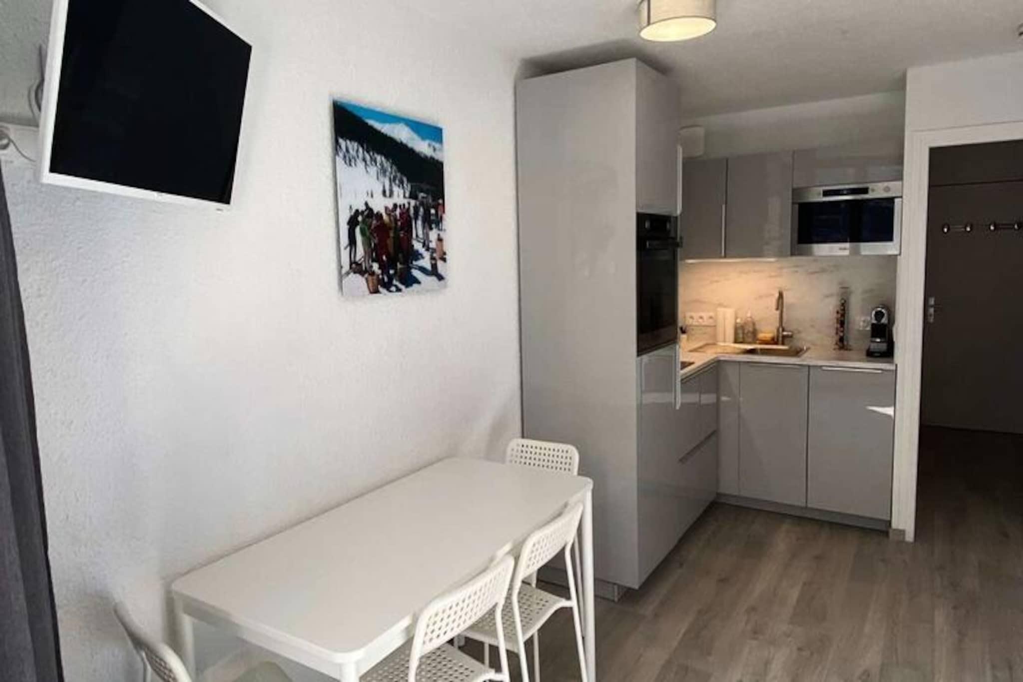 In the heart of the vibrant resort, this charming studio apartment on the 3rd floor offers a perfect retreat for your alpine getaway. Overlooking the lively central square and the surrounding slopes, the south-facing balcony invites you to soak in the sunshine and the picturesque mountain atmosphere. Whether you're here for a winter adventure or a summer escape, this cozy haven ensures you're always at the center of the action. Inside, the apartment is thoughtfully designed to maximize comfort and functionality. The entrance hall features two single bunk beds, perfect for children or additional guests, while the living room boasts a comfortable double sofa bed. The fully equipped kitchenette, seamlessly integrated into the living area, allows you to prepare meals with ease after a day of exploration. A separate bathroom and toilet provide added convenience, ensuring a hassle-free stay for couples or small families. Step outside, and you'll find yourself surrounded by the resort's best amenities. From shops and restaurants to ski lifts and activity centers, everything is just a stone's throw away. In winter, enjoy direct access to the slopes for an unforgettable ski experience, while summer brings opportunities for hiking, cycling, and soaking in the natural beauty of the region. Whether you're seeking adventure or relaxation, this studio apartment offers the ideal base to create lasting memories in the heart of the French Alps.
