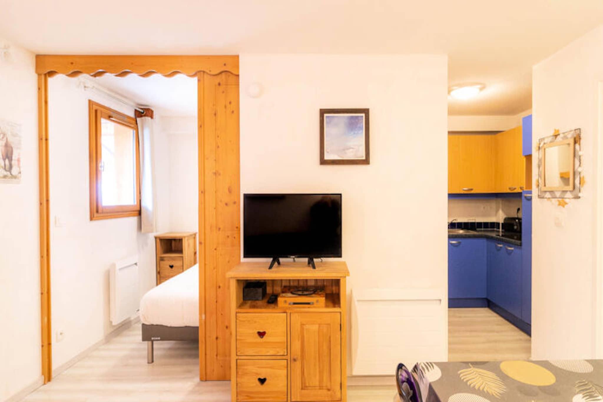 High above the serene valleys of the Hautes-Alpes, this charming apartment in the Résidence du Parc des Airelles offers a front-row seat to the breathtaking beauty of Les Orres 1800. Imagine stepping out onto your private balcony, coffee in hand, as the first rays of sunlight illuminate the snow-dusted slopes just beyond your door. Whether you're here to carve through pristine powder or explore lush alpine trails, this retreat places you at the heart of it all. \n\nDesigned for comfort and convenience, the apartment boasts a cozy living room with a flat-screen TV, a fully equipped kitchen featuring a Senseo coffee machine, raclette grill, and dishwasher, as well as a separate bedroom and a sleeping alcove with bunk beds. Perfect for families or small groups, the space comfortably accommodates up to four guests. After a day of adventure, unwind in the heated indoor pool at the nearby Le Balcon des Airelles residence, open throughout the winter and summer seasons. \n\nThe location is unbeatable—just 50 meters from the vibrant central square of Les Orres 1800, where you'll find a variety of restaurants, bars, shops, and even a mini-market. Ski lifts, hiking trails, and mountain biking paths are all within walking distance, making it easy to immerse yourself in the natural wonders of the region. \n\nWith a private ski locker and underground parking, this apartment ensures a hassle-free getaway. Whether you're seeking thrilling outdoor activities or tranquil moments surrounded by alpine beauty, this is the perfect base for your mountain escape.