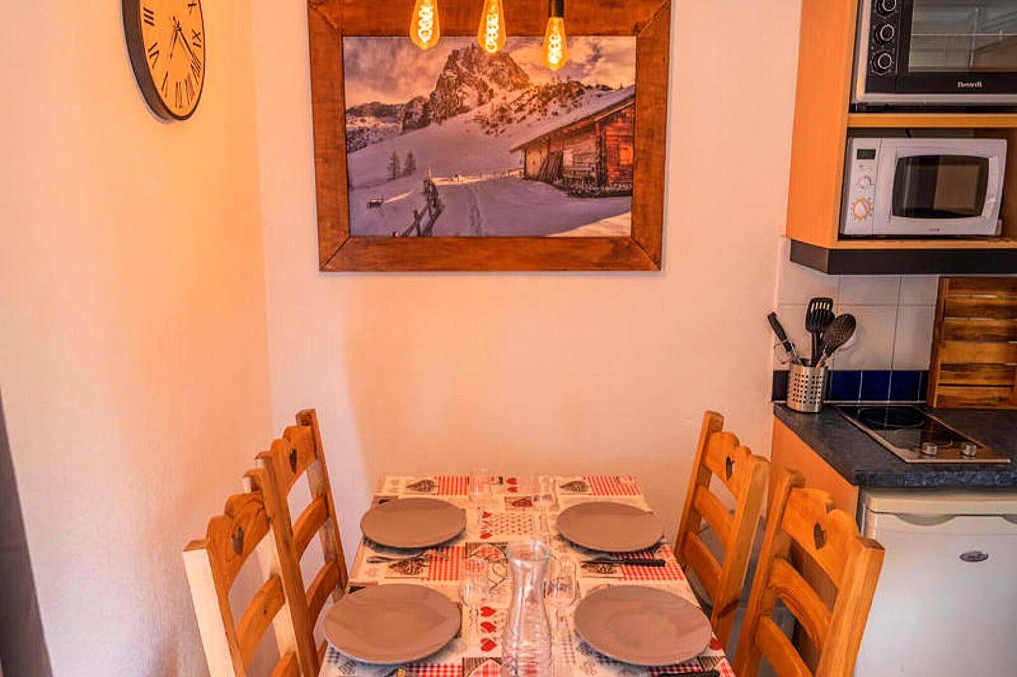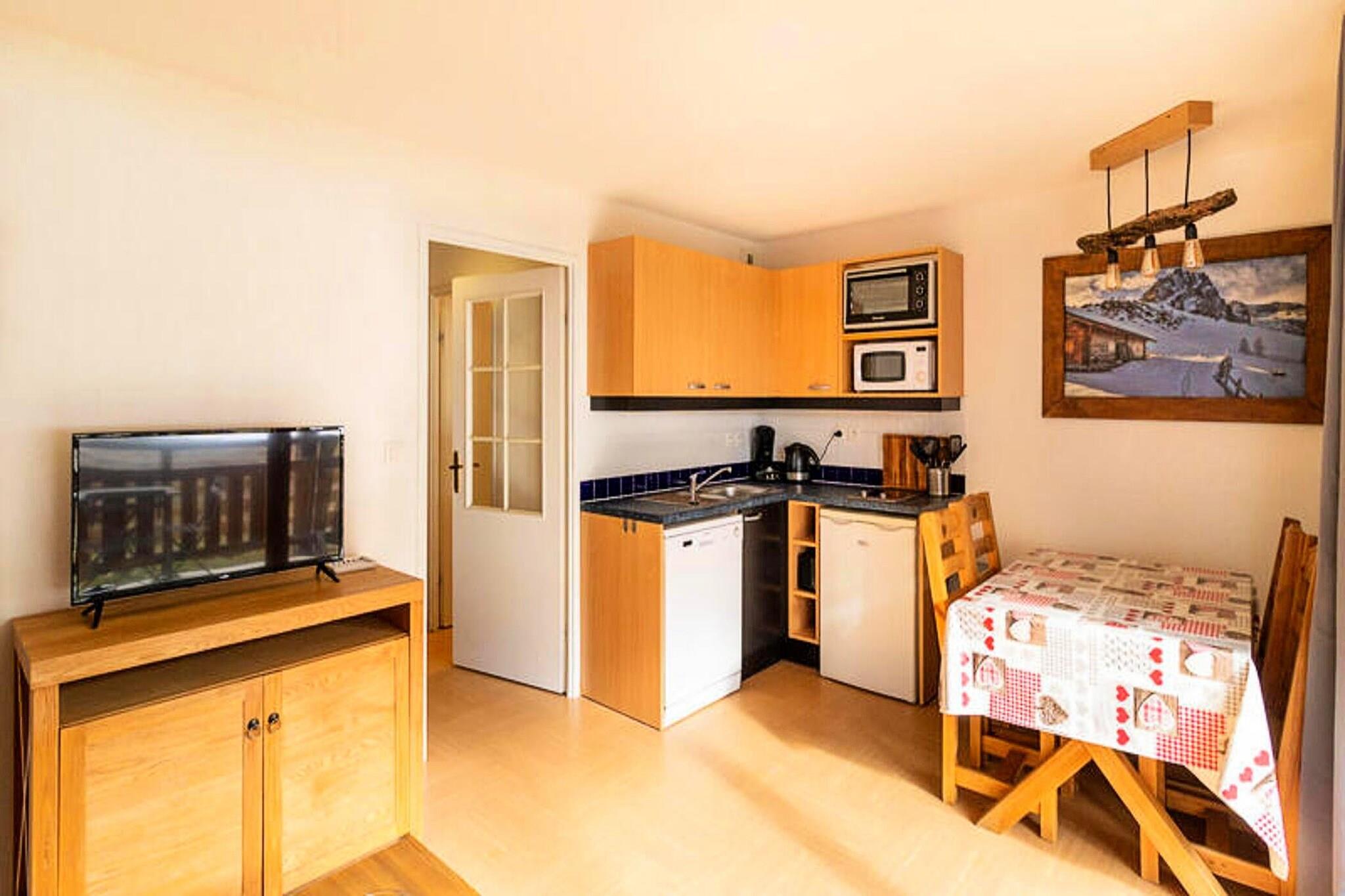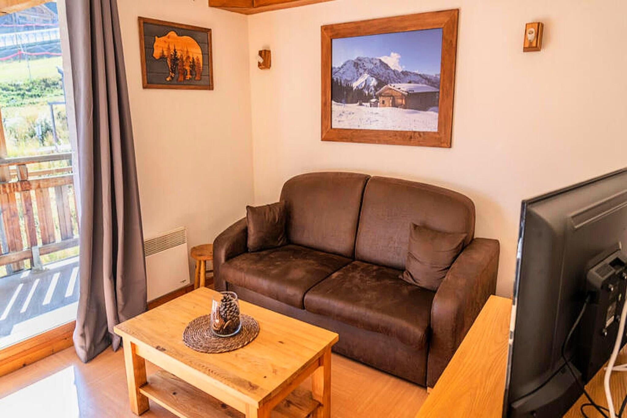 This charming 2-star studio apartment is located in the village center and can accommodate up to 4 people. It features a living area with a double foldaway bed, a mountain corner with bunk beds, and a fully equipped kitchen with a dishwasher, refrigerator, oven, and microwave. The apartment offers a bathroom with a bathtub, WC, and sink, as well as a washing machine. A 6m² balcony with garden furniture provides a lovely view of the slopes. Wi-Fi, television, and private ski storage are included, and there is a collective garage for one car. Pets are allowed with an additional fee, and the accommodation is non-smoking. The apartment is ideally situated, just 70 meters from the Chavannes gondola and 550 meters from the Mont Chéry gondola. The French Ski School, tourist office, and bus station are all within walking distance, while the swimming lake is 1.6 km away. Guests can easily access the slopes, making this a perfect location for ski enthusiasts. Additional amenities include heating, linen included for February stays (French school holidays), and a cleaning kit. Sheets and towels are available for rent, and end-of-stay cleaning can be arranged for an extra fee. A deposit of EURO250 is required, and a maximum height of 1.90m is allowed for the collective garage.