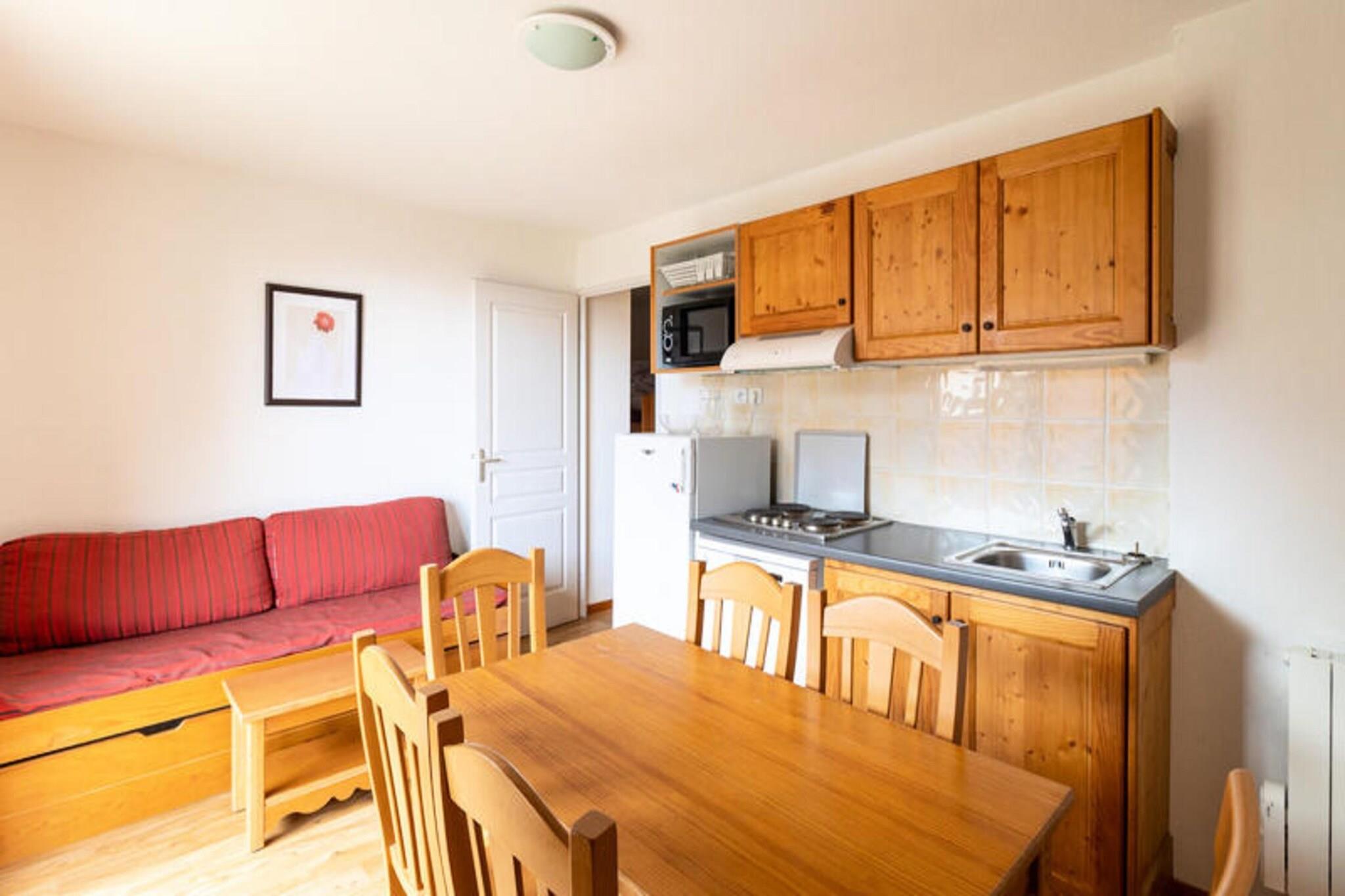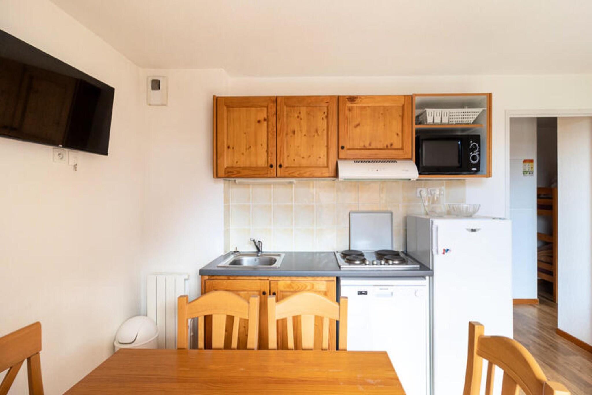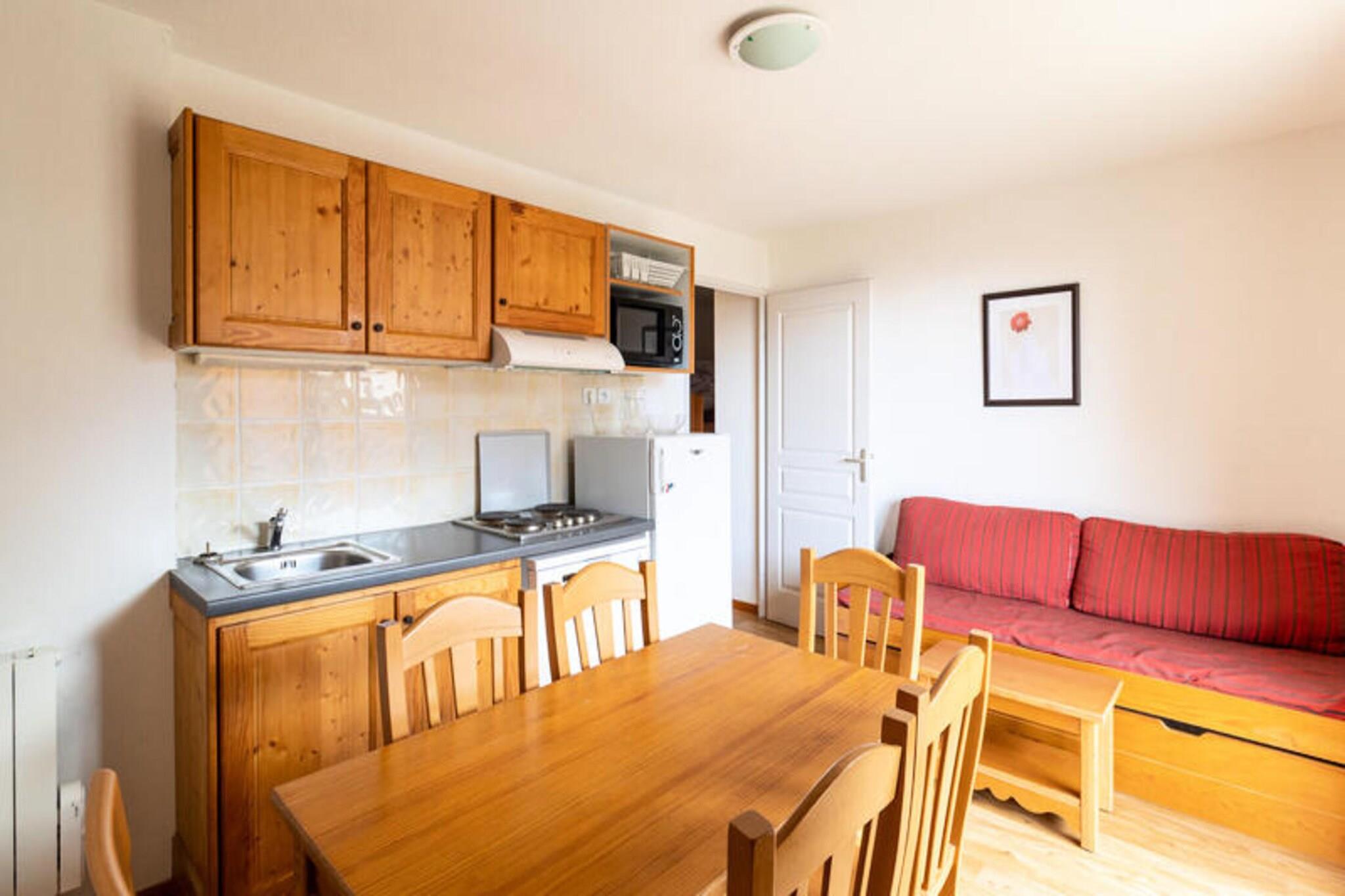 This cozy 34m² 2-room apartment accommodates up to 6 people, with a convertible sofa, a double bed, and two bunk beds. The apartment includes a fully equipped kitchen, a bathroom with a bathtub, and a large balcony with panoramic views of the resort and mountains. Guests can enjoy seasonal access to a heated indoor swimming pool and jacuzzi, located in a nearby building. A ski locker is also available for convenience. The apartment is ideally located just 50 meters from the ski lift ticket offices and 200 meters from the slopes. The resort center, offering shops, restaurants, and equipment rentals, is only 250 meters away. Hiking and snowshoeing trails are also nearby, providing plenty of outdoor activities throughout the year. Pets are allowed for an additional fee, and a EURO400 deposit is required. Heating is included, and all necessary amenities are provided for a comfortable stay.