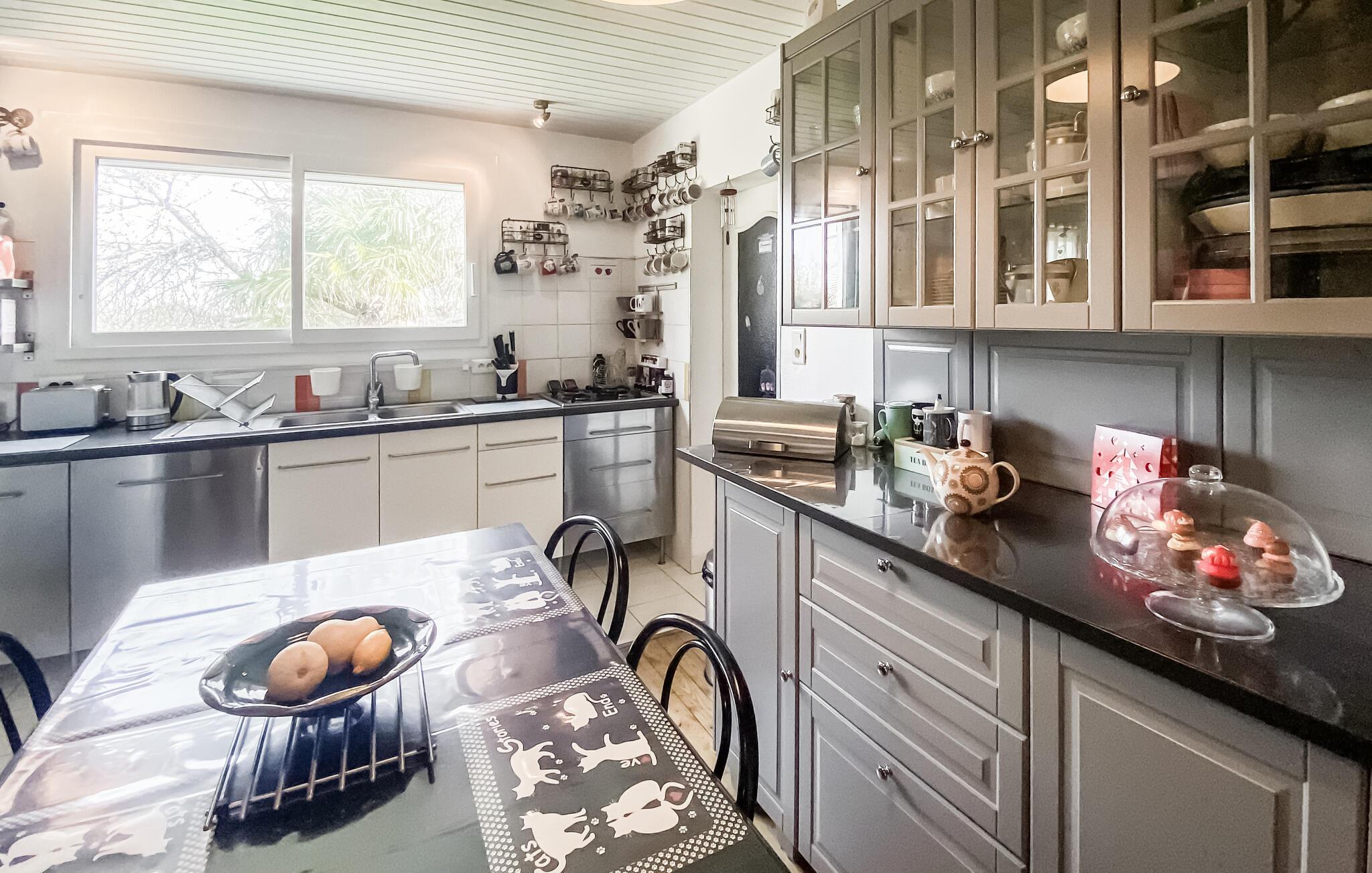 An der französischen Atlantikküste lädt Sie dieses Ferienhaus zu einem entspannten Urlaub mit vielen unvergesslichen Erlebnissen ein. Überall im Haus sorgen die vielen liebevollen Details für eine heimelige Atmosphäre und eine angenehme Stimmung. Nutzen Sie die schöne, offene Küche, um ein üppiges Frühstück und leckere Speisen zuzubereiten. Kommen Sie mit Ihrer Familie am Esstisch in der Küche oder auf der Terrasse vor dem Haus zu den gemeinsamen Mahlzeiten zusammen und schmieden Sie Pläne für Ihren Urlaubstag. Machen Sie es sich auf den kuscheligen Sofas im Wohnbereich gemütlich und kommen Sie zur Ruhe. Bei einem guten Film oder lustigen Brettspielen kommt hier keine Langeweile auf.