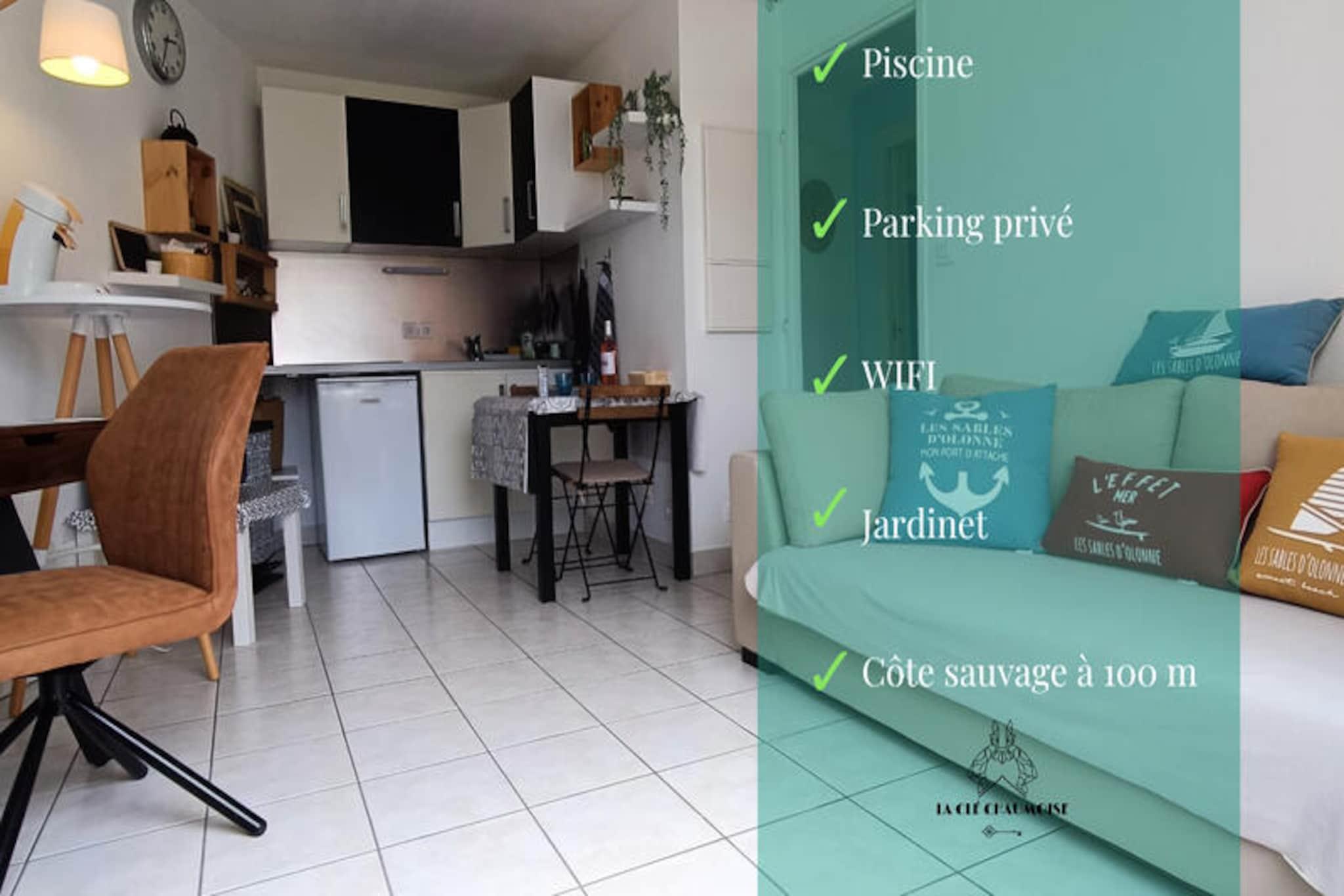 In the heart of the historic Chaume district of Les Sables-d'Olonne, this delightful cottage offers a serene retreat just steps from the iconic Armandèche lighthouse and the picturesque coastal paths. Surrounded by the charm of this maritime neighborhood, you'll feel the essence of the region's rich history while enjoying modern comforts. The private garden invites you to unwind under the sun, while the shared swimming pool promises refreshing moments during the warmer months. Whether you're here for a romantic getaway or a peaceful escape, this property is the perfect base to explore the beauty of the Vendée coastline. \n\nStep inside and discover a thoughtfully designed space that blends comfort with functionality. The living room is a cozy haven, complete with a sofa, television, dining area, and even a desk for those who need to stay connected. The fully equipped kitchen is ready for your culinary adventures, featuring everything from a coffee maker to condiments. The master suite boasts a comfortable 140x190 cm bed and a private bathroom with a modern shower, while a separate dressing room and toilet add convenience. A washing machine ensures longer stays are hassle-free. Outside, the private garden with seating is ideal for al fresco dining or simply soaking up the coastal ambiance. \n\nLocated just 900 meters from Quai de la Chaume, you'll find a vibrant selection of shops, restaurants, and a lively market. The charming passeur boat, only 1km away, provides a quick and scenic route to the main beach and the bustling town center. Seafood lovers will delight in the fresh platters available just 750 meters from your door, and a supermarket is conveniently located 2km away for all your essentials. With cycle paths, coastal trails, and the charm of Les Sables-d'Olonne at your fingertips, this cottage is your gateway to unforgettable memories by the sea. \n\nWhether you're exploring the nearby attractions or simply relaxing in the garden, this property offers the perfect blend of tranquility and adventure. Book your stay today and experience the magic of the Vendée coast.