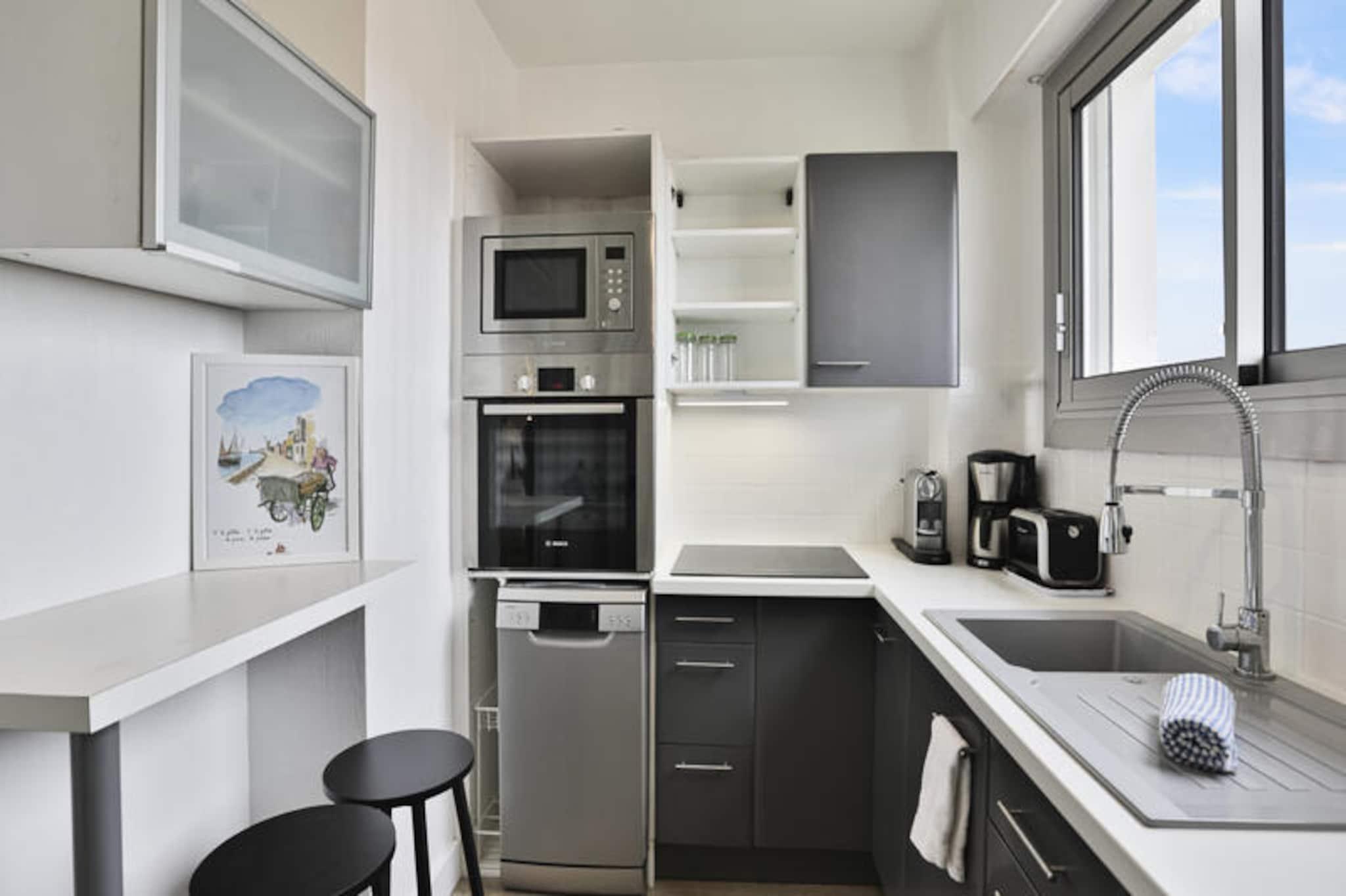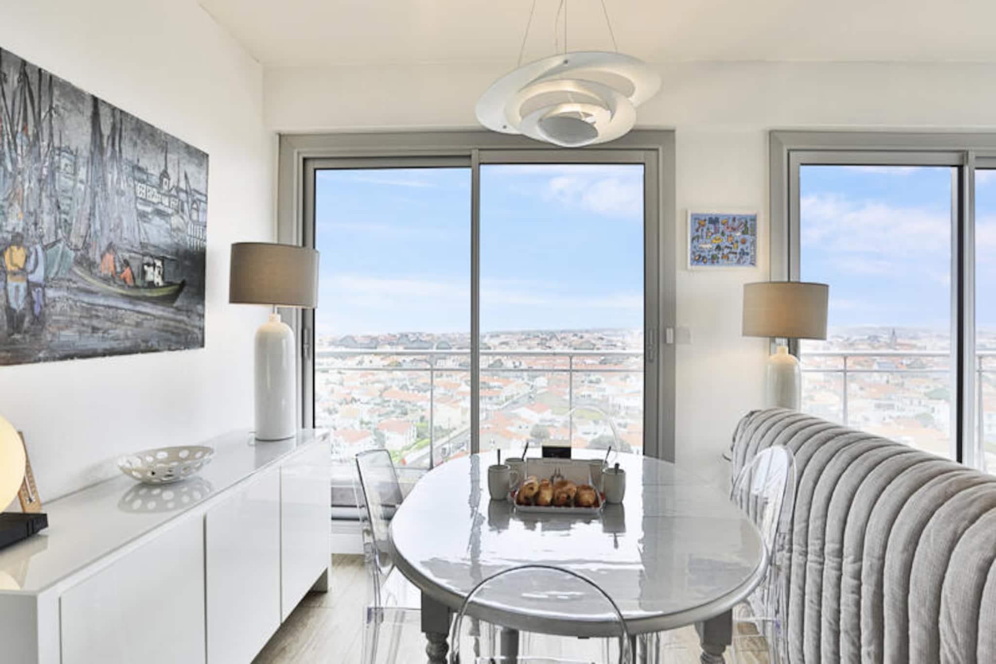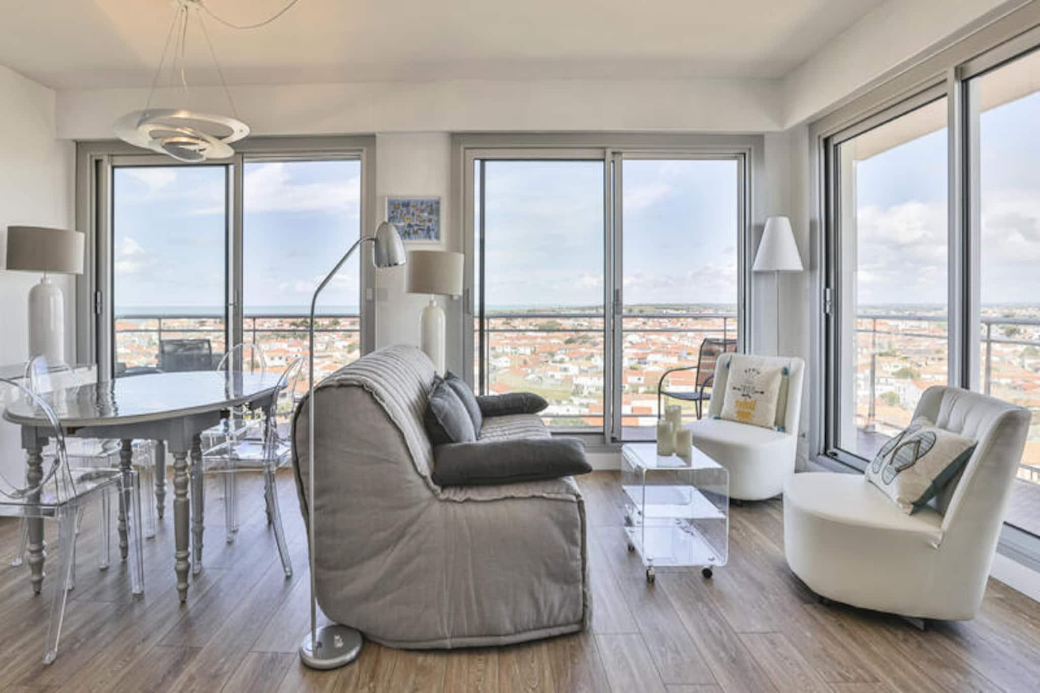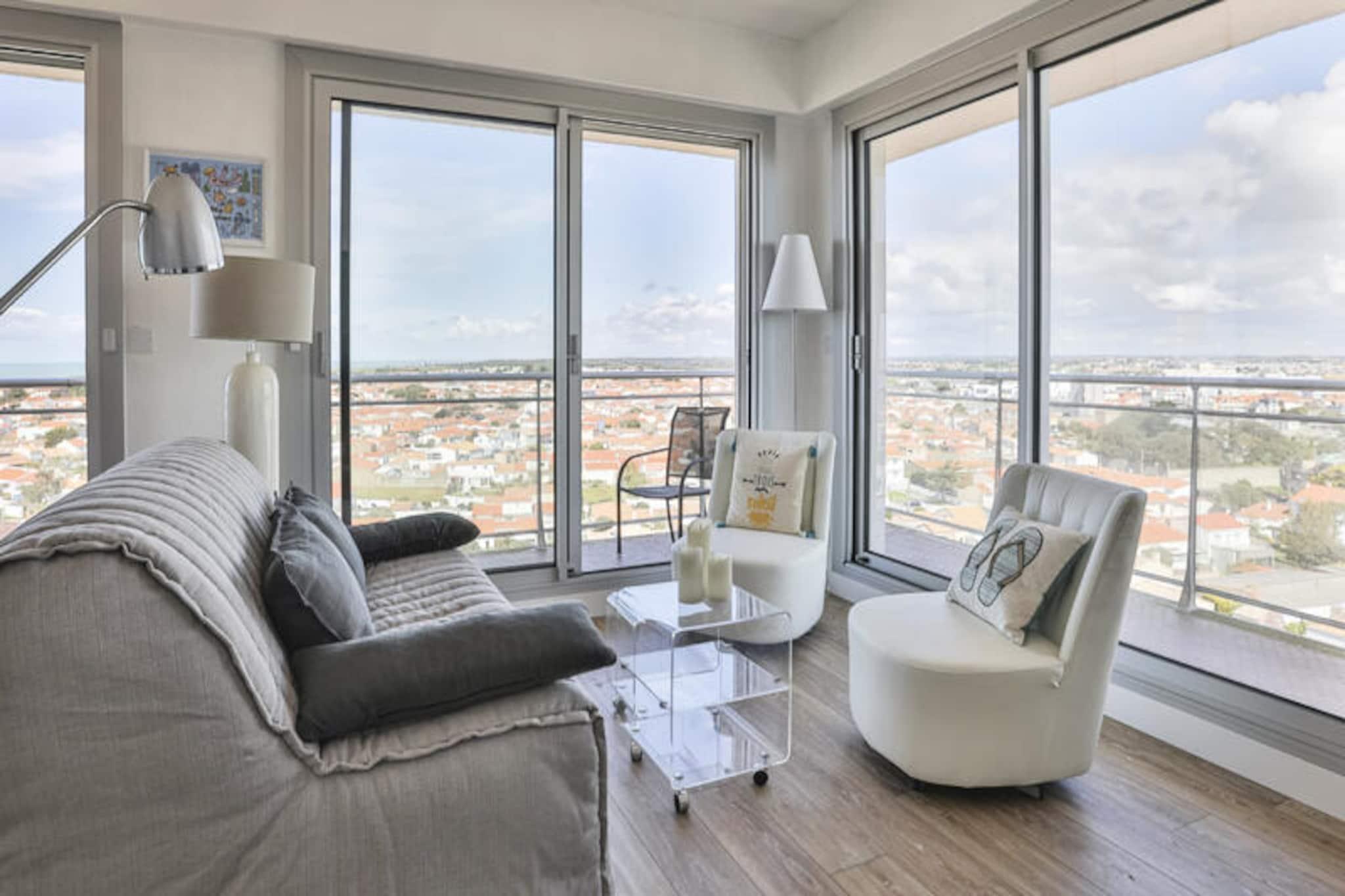 Awaken your senses with the mesmerizing sights and sounds of the Atlantic Ocean from this delightful one-bedroom apartment, perched on the 12th floor of the sought-after Saint-Nicolas residence in Les Sables-d'Olonne. Here, every morning begins with a breathtaking panorama of La Chaume, the bustling channel, and the iconic Armandèche lighthouse, setting the tone for an unforgettable coastal escape. Whether you're sipping your morning coffee or unwinding after a day of adventure, the view alone is worth the stay. \n\nInside, the apartment exudes comfort and practicality. The cozy bedroom features a plush queen-size bed, promising restful nights accompanied by the gentle ocean breeze. The bright living room, complete with a comfortable sofa bed, invites you to relax and recharge. A separate, fully equipped kitchen allows you to prepare meals with fresh local ingredients, while the bathroom and separate toilet ensure convenience for all guests. Modern amenities, including Wi-Fi, make it easy to stay connected, though the stunning surroundings might tempt you to disconnect entirely.\n\nThe location is simply unbeatable. Just steps away, the charming La Chaume quarter offers a vibrant mix of seafood restaurants, quaint shops, and sun-drenched beaches. For the adventurous, water sports and coastal trails await, while the lively town of Les Sables-d'Olonne provides endless entertainment. A private parking space ensures hassle-free access, a true luxury during the bustling summer months.\n\nWhether you're seeking a romantic getaway, a serene retreat, or an active seaside holiday, this apartment offers the perfect base to create lasting memories. Book your stay today and let the magic of Les Sables-d'Olonne captivate you.