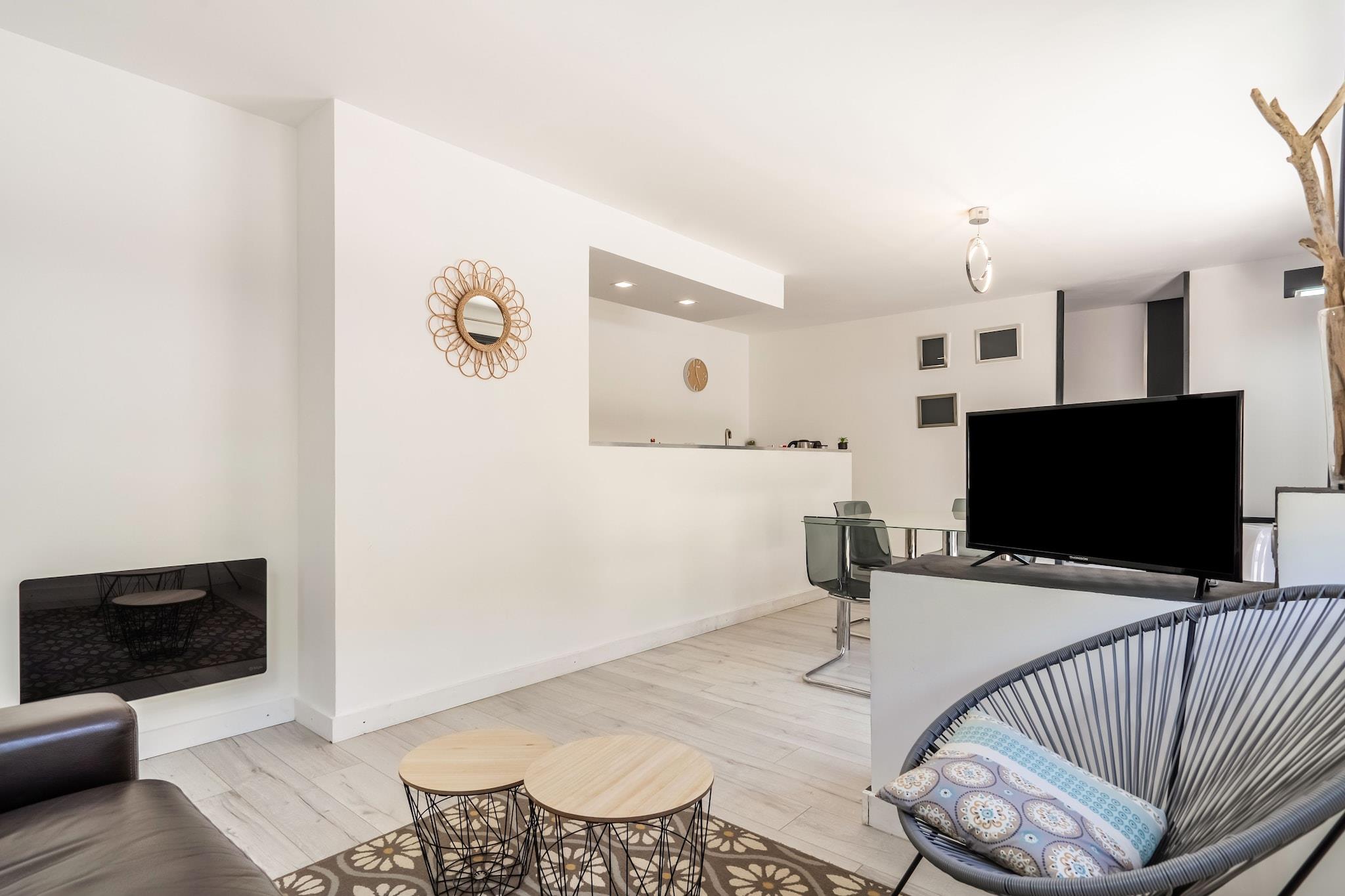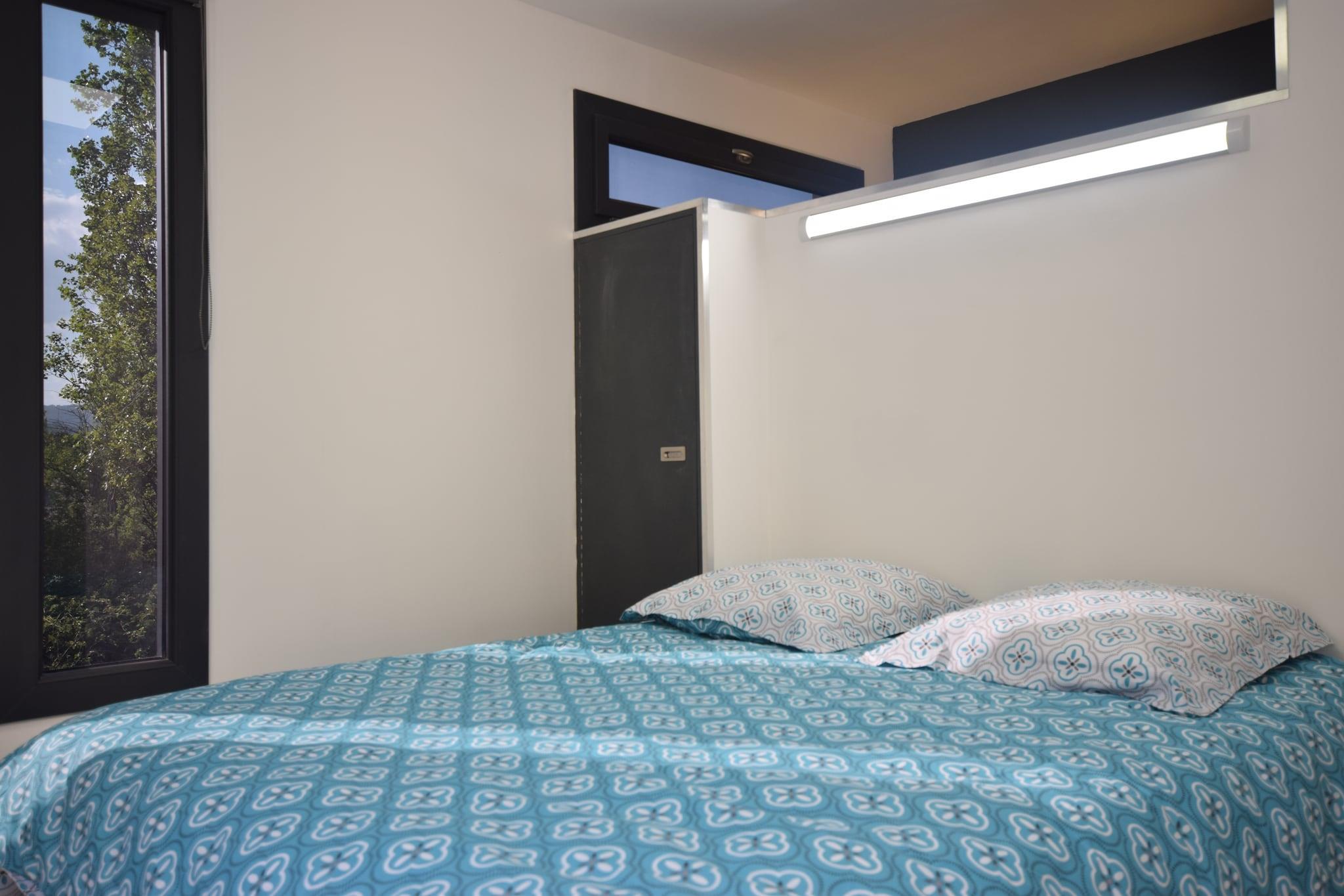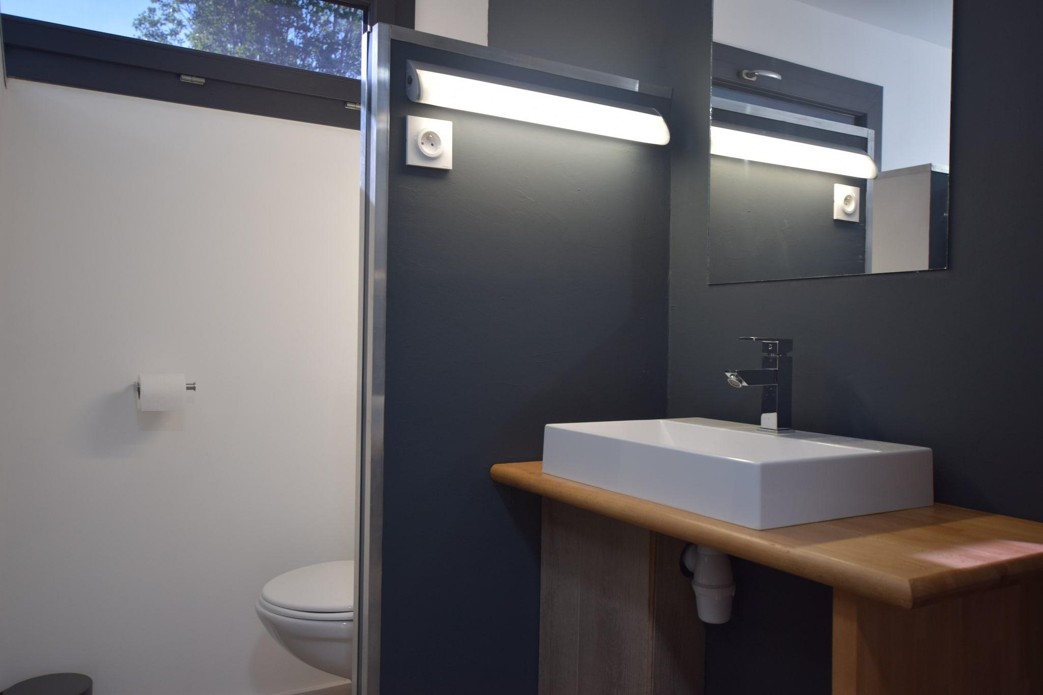 Ground floor: (Living room(TV, seating area, air conditioning), open kitchen(electric kettle, cooker(2 ring stoves, gas), coffee machine, oven, microwave, dishwasher, fridge, fridge-freezer), Bedroom with bathroom(double bed(two single duvets, 160 x 200 cm), shower, washbasin), Bedroom with bathroom(double bed(160 x 200 cm), shower, washbasin, toilet), toilet) washing machine, heating(electric), terrace, garden, garden furniture, BBQ, parking, deckchairs, swimming pool(private, opened from 1/2 Apr upto and including 1/2 Oct), boules court
