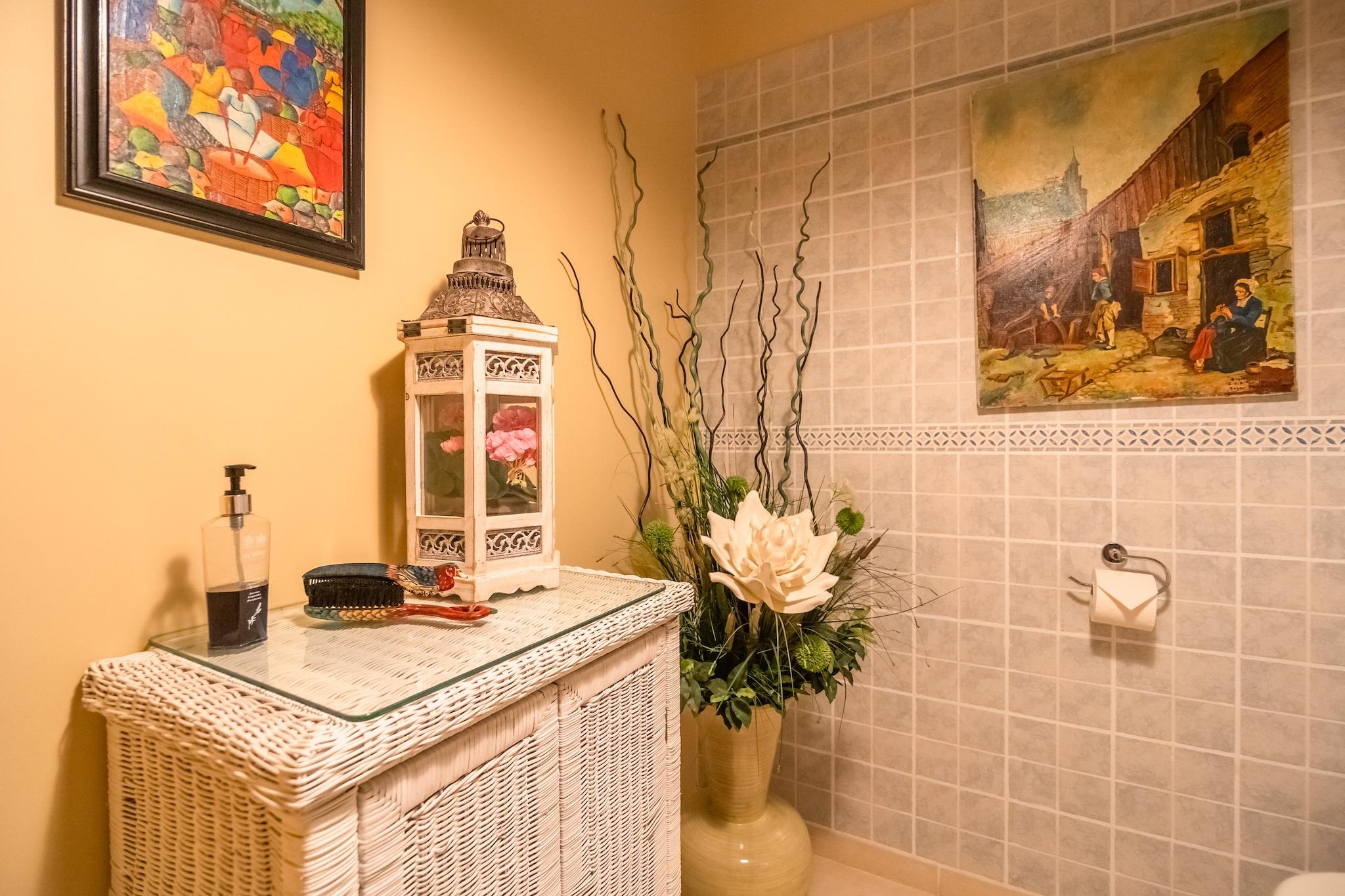 Ground floor: (hallway(toilet), Living room(TV(international television channels), seating area, DVD player, CD player, stereo unit), Large kitchen(dining table(6 persons), electric kettle, toaster, cooker(5 ring stoves, gas), hood, coffee machine(filter), oven, microwave, dishwasher, fridge(+ ice machine, + freezer, american), Blender), Bedroom with bathroom(double bed or 2 single beds, hip bath, shower, washbasin, toilet), pantry(tumble dryer, washing machine, ironing board, iron)) On the 1st floor: (Bedroom with bathroom(double bed(140 x 200 cm), shower, washbasin, washbasin, toilet), Bedroom with bathroom(double bed(150 x 190 cm), hip bath, shower, washbasin, toilet, balcony), Landing(seating area), air conditioning) garden doors, garden(private, landscaped garden, illuminated, 1500 m2), garden furniture, sun loungers, BBQ(charcoal), parking, swimming pool(private, cover, 7 x 4 m., opened from Apr upto and including 1/2 Nov)