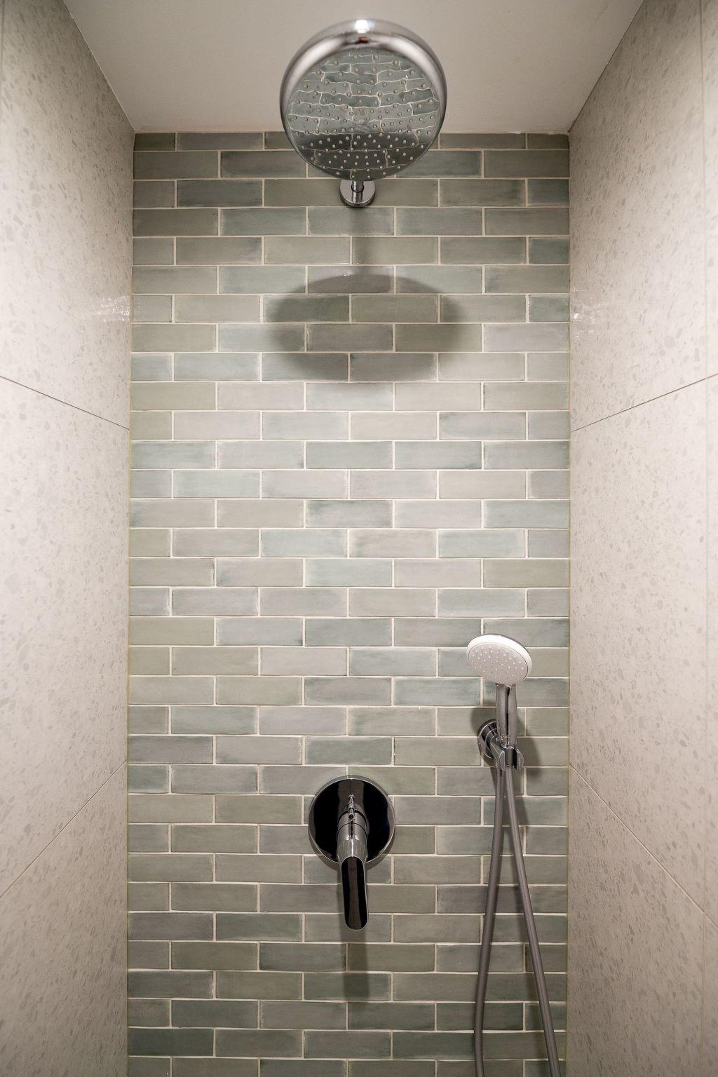 Modern Bathroom: Bathroom with walk-in shower and washing machine for your convenience.