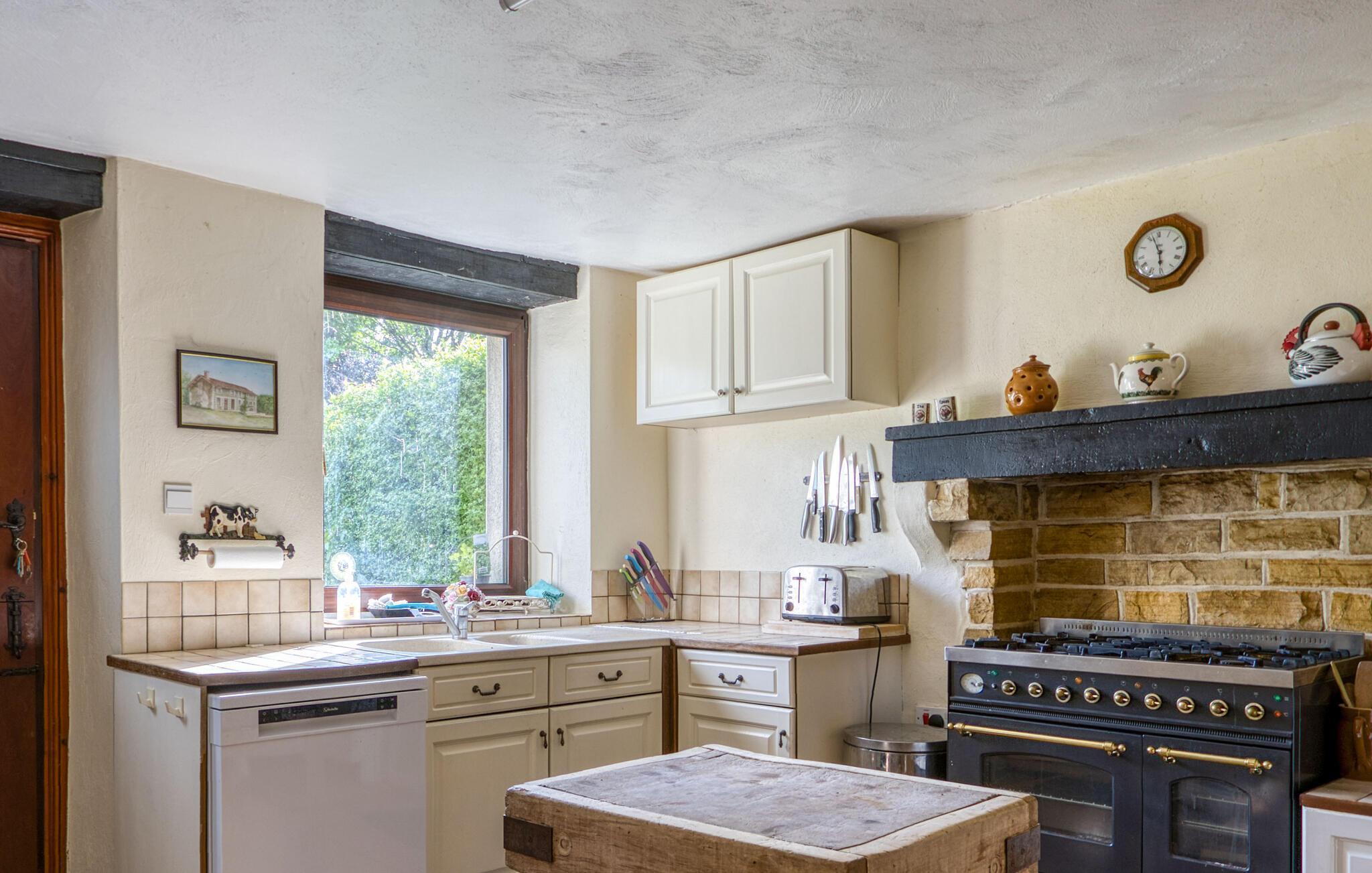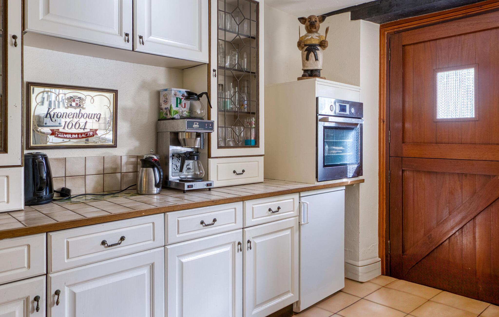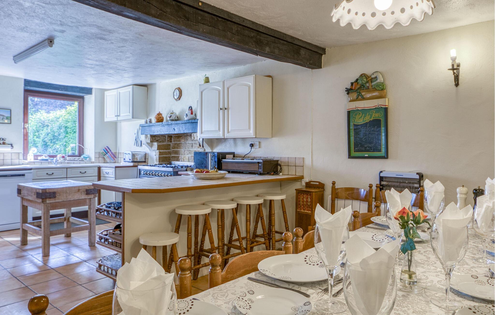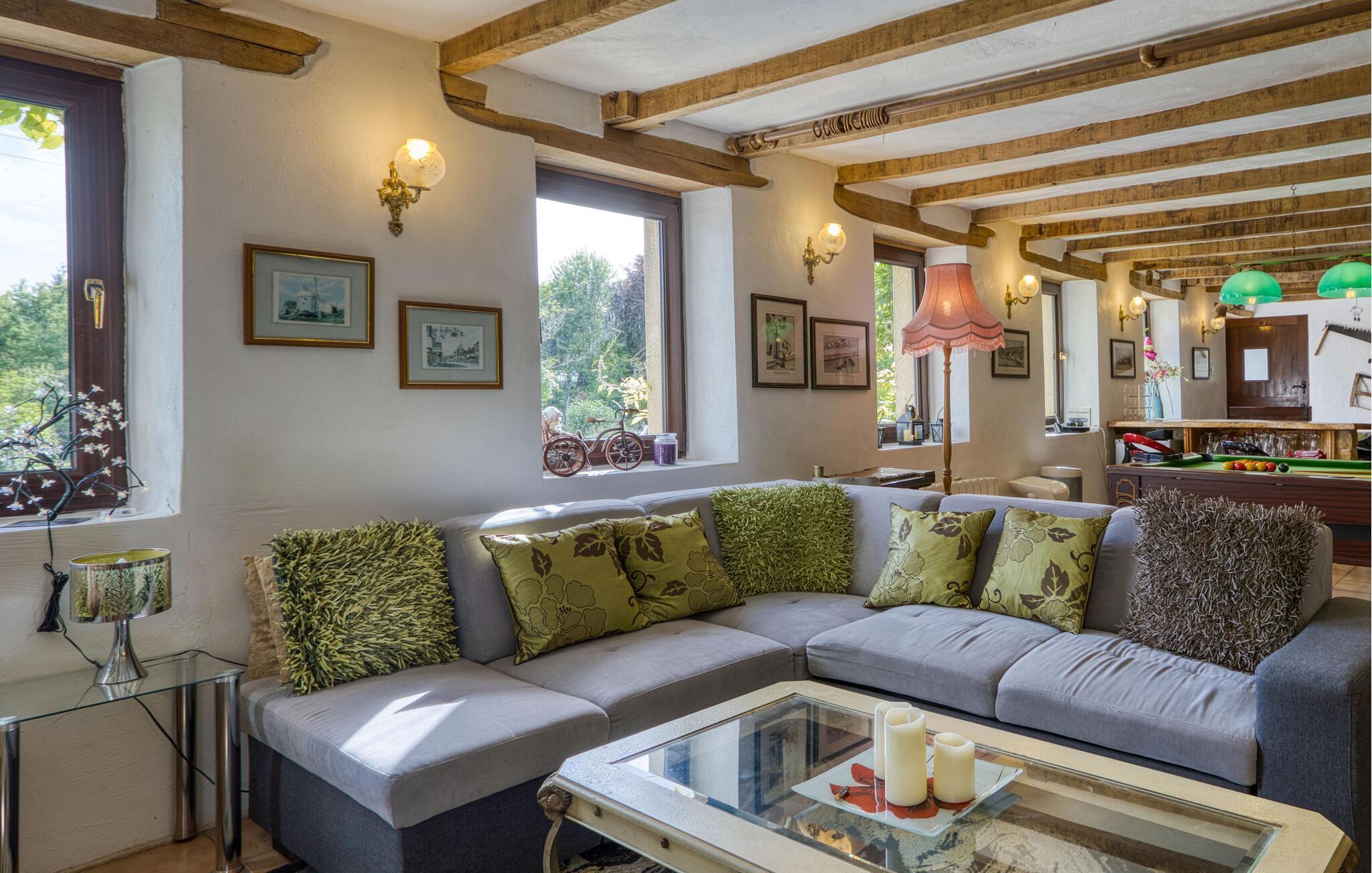 Ihr großzügiges Ferienhaus verbindet ländlichen Charme, Ruhe, Natur und zahlreiche Freizeitmöglichkeiten. Machen Sie es sich im weitläufigen Innenbereich gemütlich. Entspannen Sie in der Sofaecke vor dem rustikalen Kamin oder fordern Sie Ihre Mitreisenden zu einer Partie Billard heraus. Der große Wohnraum mit sichtbaren Holzbalken, gemütlichem Lichteinfall und Barbereich schafft eine einladende Atmosphäre. Genießen Sie hier oder am stilvollen Esstisch gesellige Abende mit anregenden Gesprächen und leckeren Mahlzeiten.