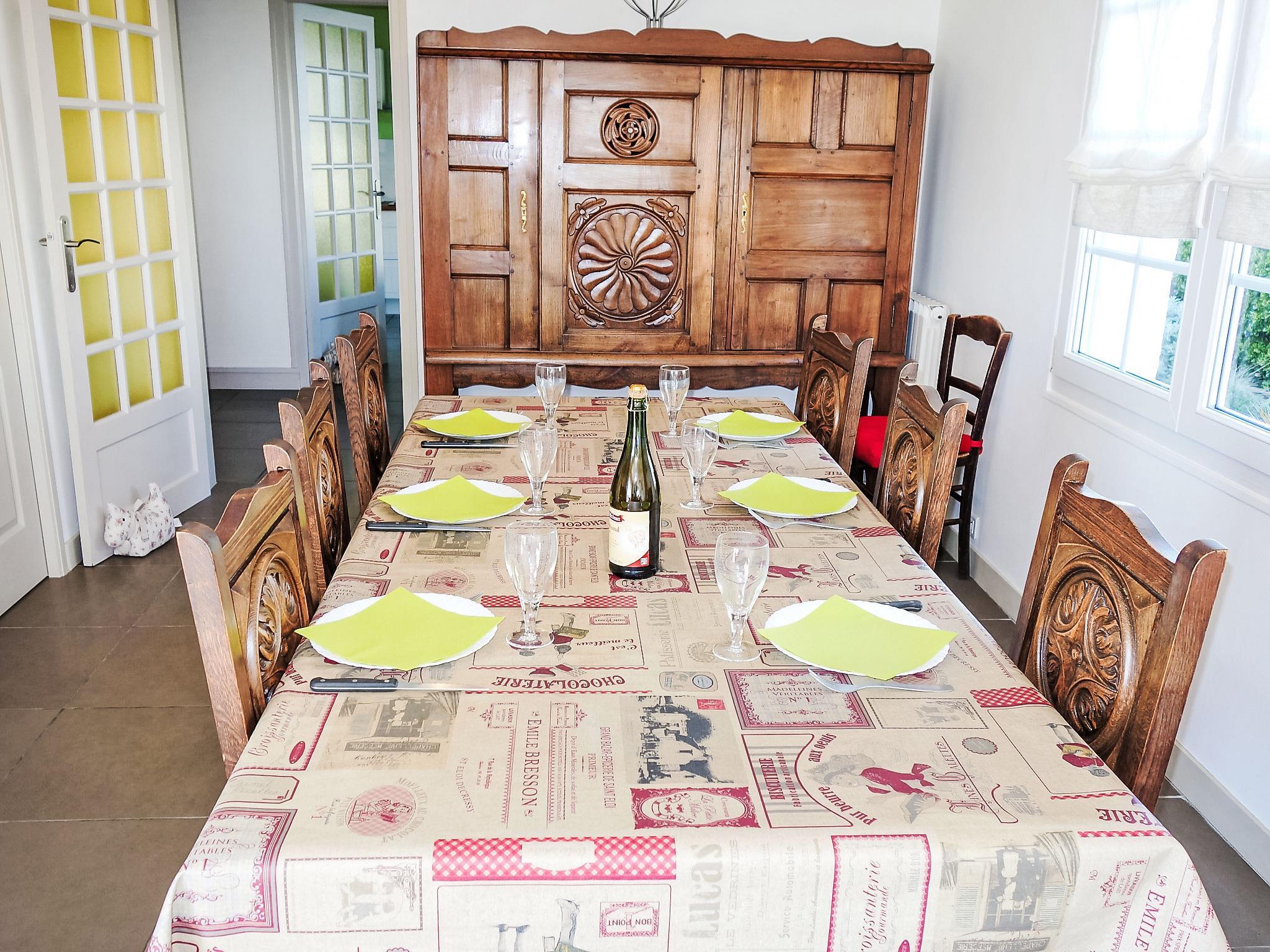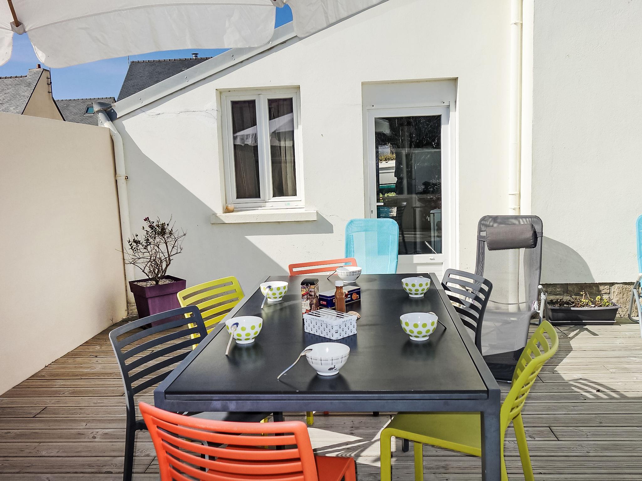 4-room house 84 m2 on 2 levels. Beautiful and cosy furnishings: living/dining room with TV (flat screen). Kitchen (oven, dishwasher, 4 gas rings, toaster, kettle, microwave, electric coffee machine) with dining table. Sep. WC. Upper floor: 1 room with 1 bed (90 cm, length 190 cm), 1 french bed (140 cm, length 190 cm). 1 room with 1 french bed (140 cm, length 190 cm). 1 room with 2 beds (90 cm, length 200 cm). Shower/WC. Electric heating. Large terrace 50 m2. Terrace furniture, barbecue, deck chairs (5). Partial view of the sea. Facilities: washing machine, dryer, iron, children's high chair, baby cot for up to 3 year olds. Internet (WiFi, free). Please note: non-smoking house. Maximum 1 pet/ dog allowed. Smoke alarm.