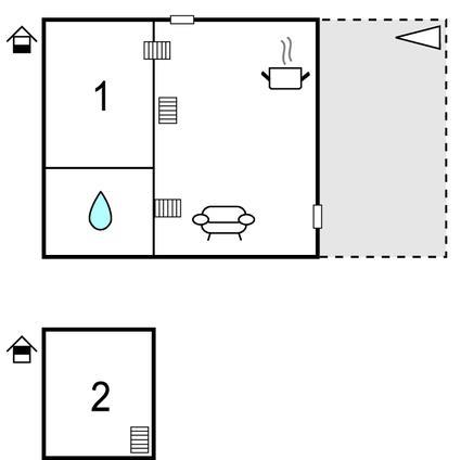 Der Zugang zum Schlafzimmer in der ersten Etage erfolgt über eine etwas steile Treppe ohne Setzstufen. Da die Deckenhöhe dieses Zimmers sehr niedrig ist, eignet es sich nur für Kinder (ab 8 Jahre). Das Haus ist an das benachbarte Haus angeschlossen, welches Platz für 2 Personen bietet.