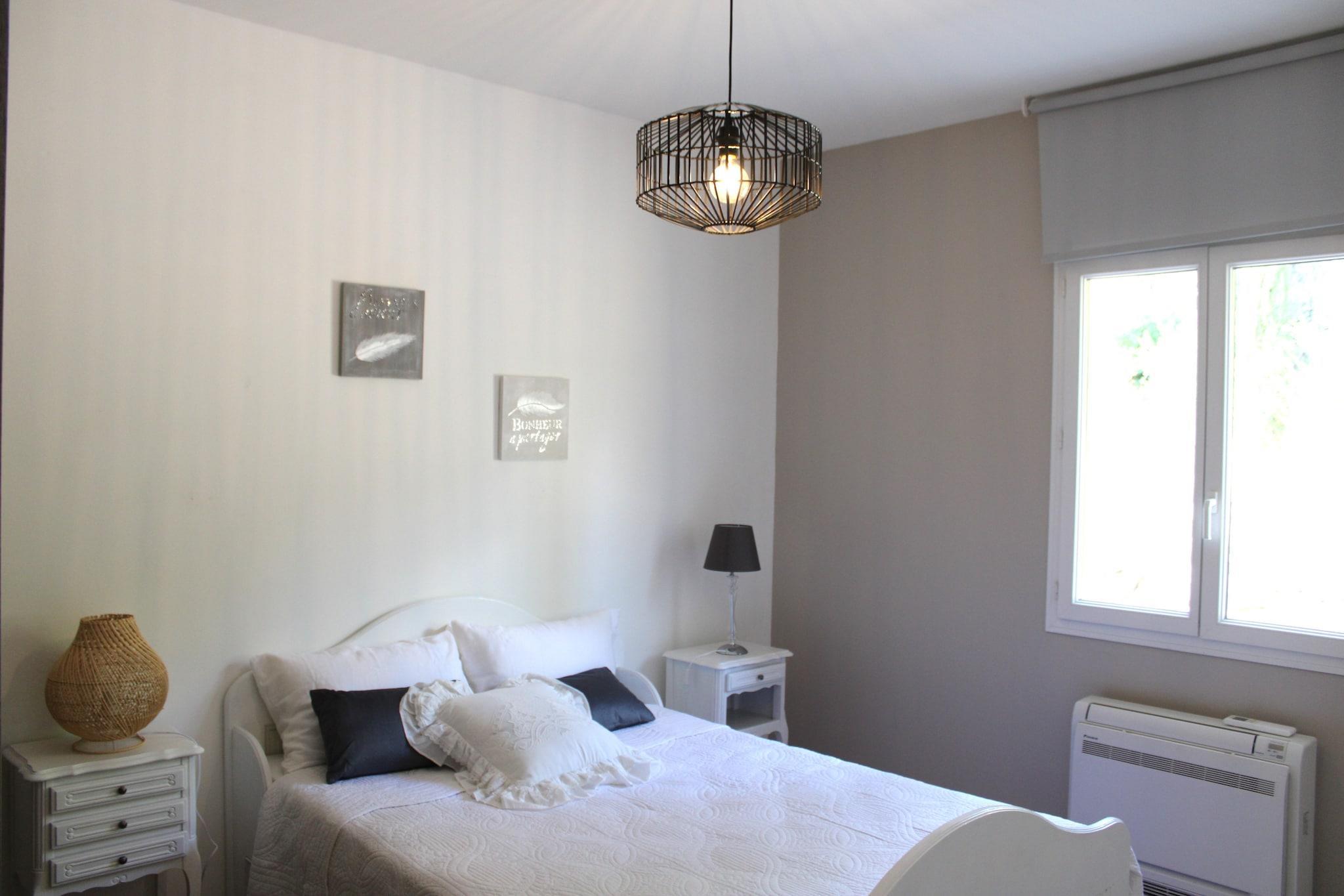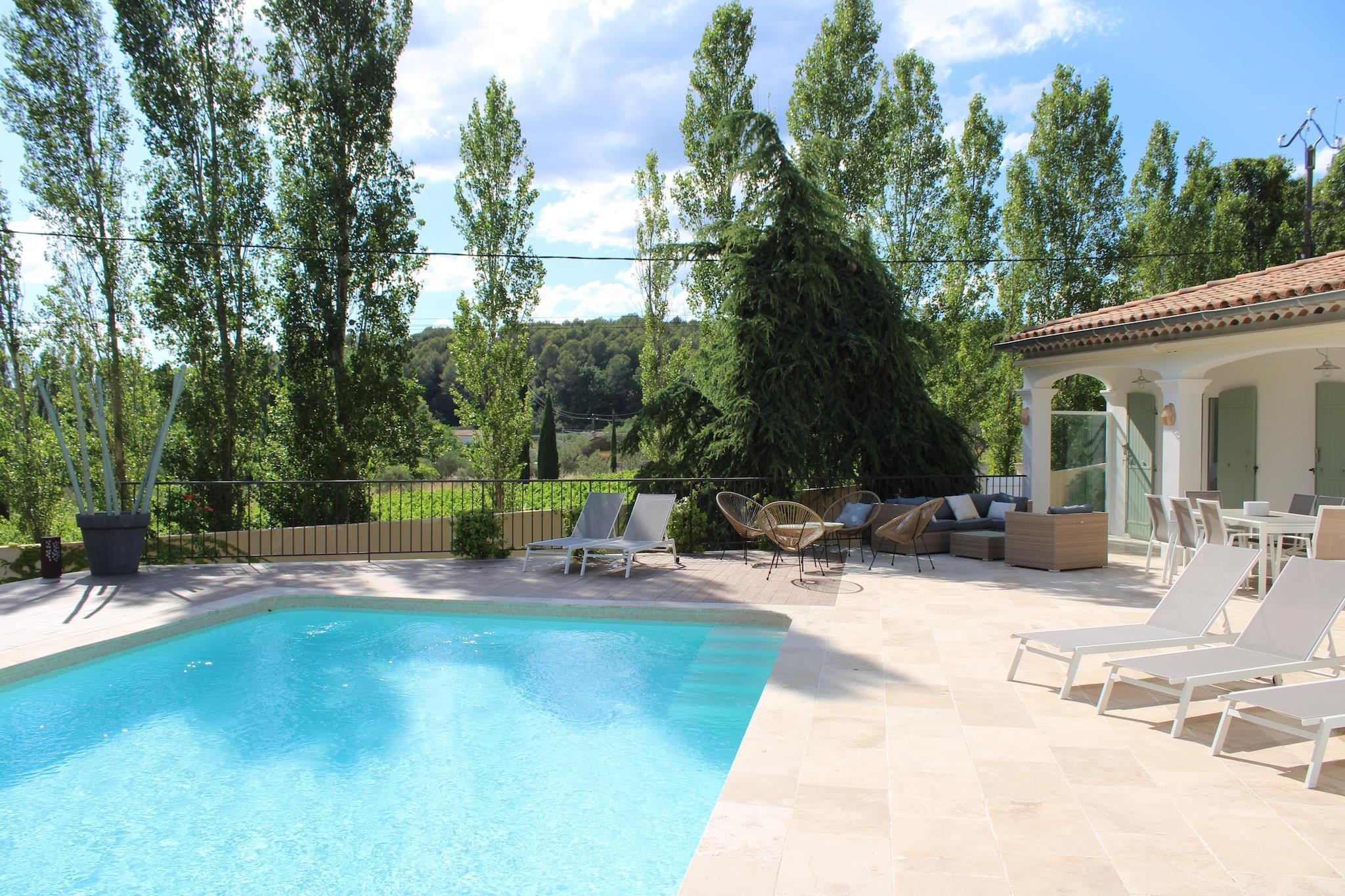 Surrounded by rural greenery and along a quiet road between Lorgues and Saint-Antonin-du-Var, the beautiful Villa des Trois Palmiers is located on a 1700 m² estate with a jeu de boules court and palm trees. Once through the electric entrance gate, there is room for about 4 cars. Lorgues is a charming Provencal village in the heart of Provence's famous wine region. It is an ideal destination for travelers looking for peace and relaxation in a picturesque setting. The village is known for its medieval architecture and narrow streets, where you can find numerous boutiques, restaurants and cafes. There are also numerous historical sights to discover, such as the Romanesque church and the castle ruins. The arrival hall leads to a large living room with lots of light and direct access to the terrace area and swimming pool. The simple interior makes everything look spacious and there is a seating area with white seats and a spacious dining table. Next you will find a fully equipped kitchen for preparing a delicious meal. The master bedroom is located on the south with a beautiful view of the pool and one of the bedrooms is ideal for the children. The house is equipped with air conditioning and underfloor cooling. Both systems can be turned into a heating system on colder days. The covered terrace with a nice outdoor table provides the necessary shade, you can organize cozy barbecues and enjoy sunny days in or around the pool on the comfortable sun loungers. Switching on the swimming pool heating is always done on request and for a fee and is only possible outside the summer months. During the months of July and August, the water itself has a wonderful temperature.