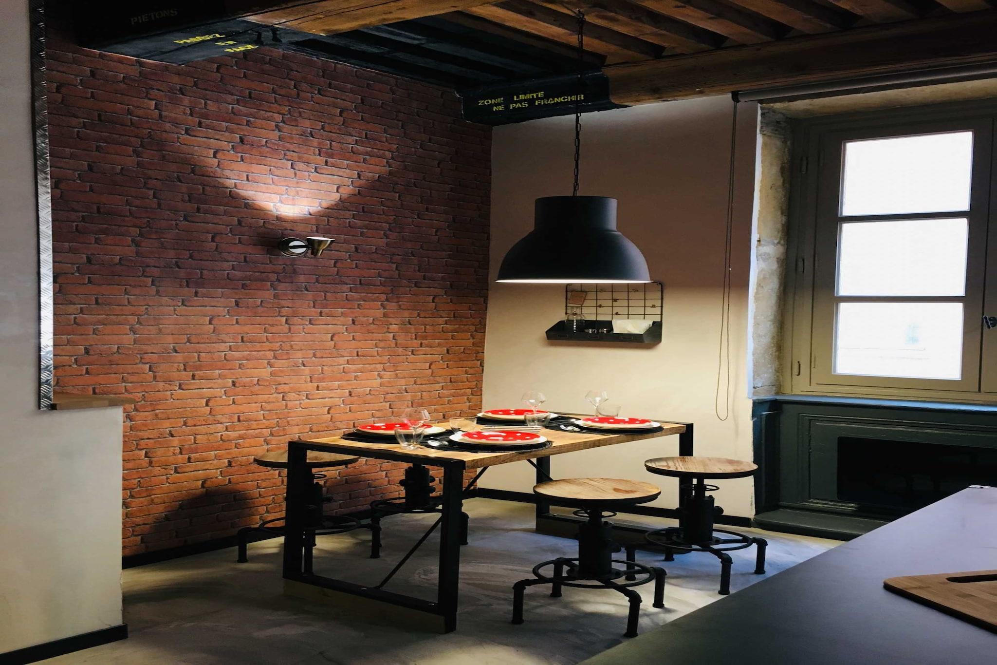 In the heart of Lyon, a unique vintage industrial style! Public transport just a stone\'s throw away; Historic district 200m away...You can do everything on foot, museums, restaurants, churches..! If you like industrial and functional decor, the Small Factory is made for you! Each space has been designed \'essential\' to move easily in the studio, with several people without too much interference. Access to the accommodation is via a typical staircase of a building in the city centre of Lyon dating from the 18th century (a bit steep and not very wide) In terms of sleeping: The main bed is a large 160cm bed with a 21cm mattress on a slatted base. The secondary sleeping accommodation is a 140cm foam sofa bed. Your comfort during the stay being my priority, I want the apartment to be perfectly prepared to welcome you in the best possible way. As part of the cleaning fees you pay, there is of course the cleaning and complete preparation of the apartment but we also provide you with all the hotel quality laundry (bedding already set up for each bed and available for the sofa bed, bath towel, bath mat and kitchen towel...) as well as a welcome kit for the first night/first morning including shower gel, soap, dishwasher, Nespresso coffee capsules.
