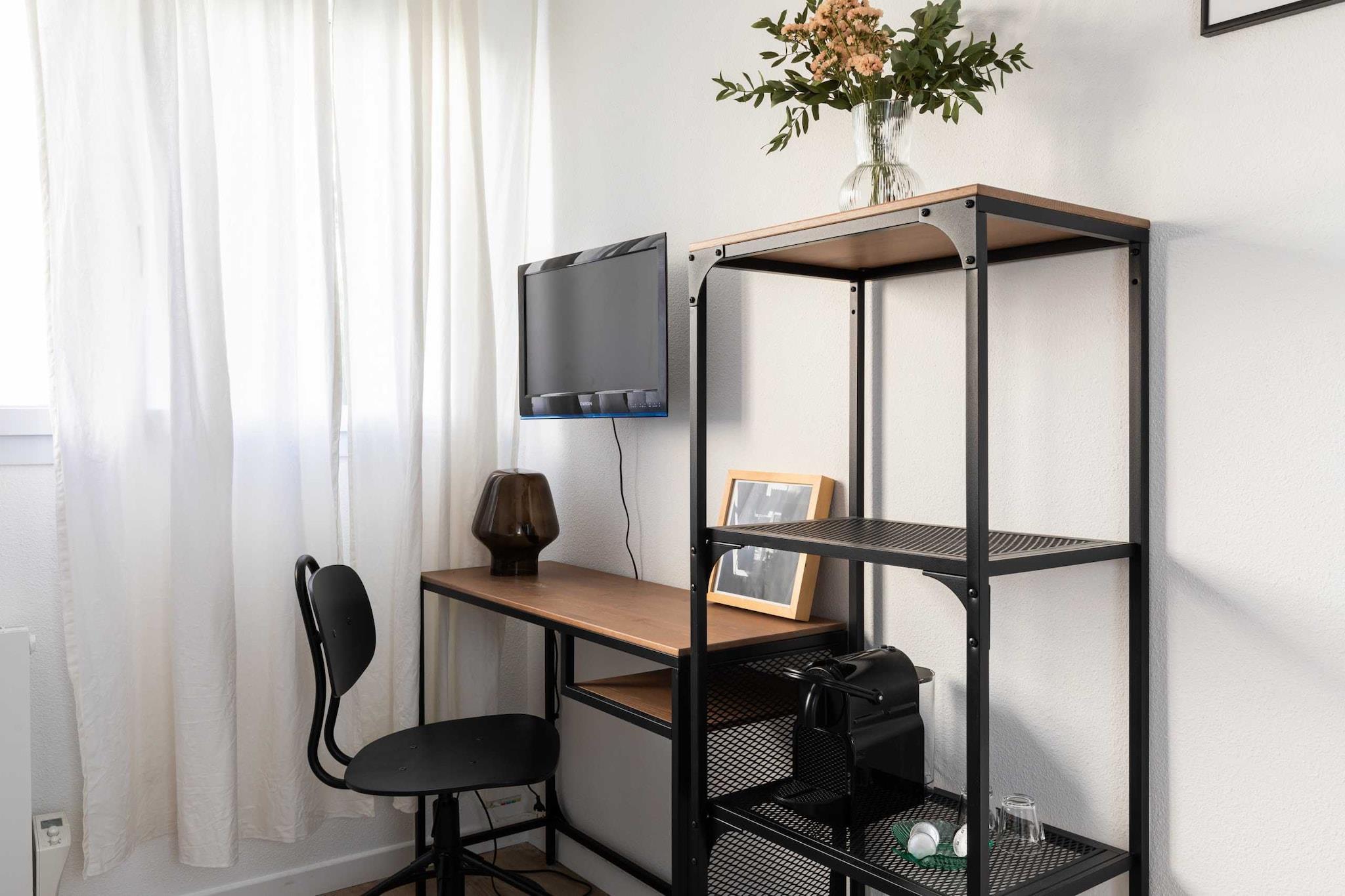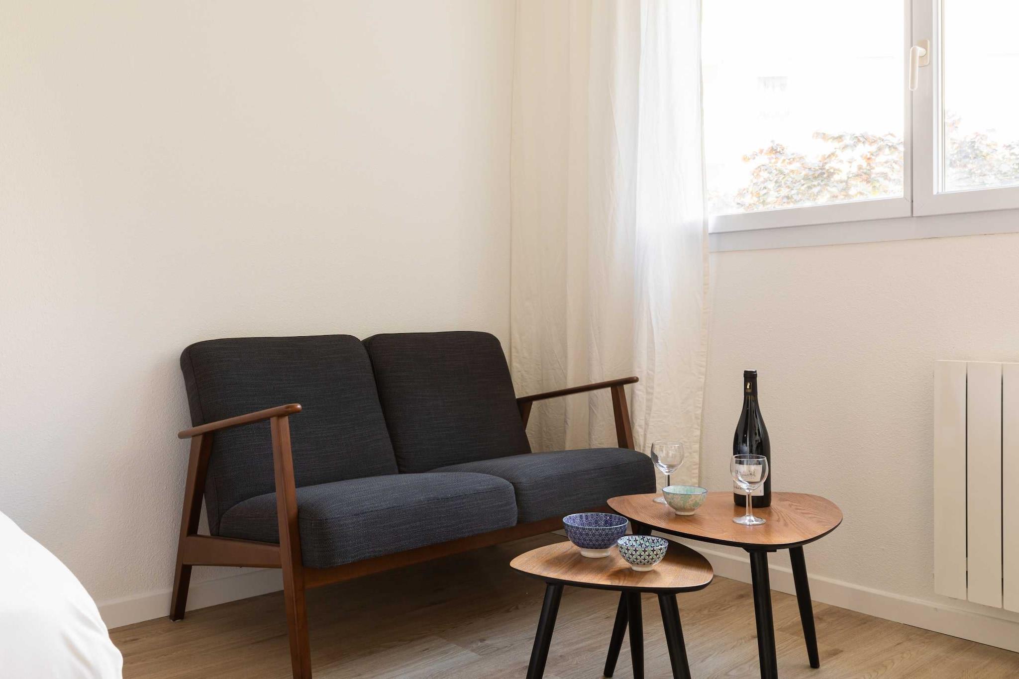Check-in to the apartment is self-service from 5pm. An early check-in option at 2pm is possible for an additional fee of +EURO20. null Apartment with lots of character, newly renovated and tastefully decorated. You can enjoy its brightness and tranquility during your stay. It has been designed with high-end amenities to satisfy your every desire. This lovely studio is ideally located just a few steps from the Part Dieu train station. Quiet, it is fully equipped and ideal for a two-person stay. The apartment is located on the 1st floor with a lift. Very bright, it consists of a beautiful living room with a flat-screen TV and a comfortable new double sofa bed for two people (140x200). A fully equipped kitchen with a fridge, hob, microwave, toaster, kettle and even a Nespresso coffee machine. A bathroom that has also been renovated, it has a shower cubicle with a toilet. To ensure your maximum comfort, we provide you with a hairdryer and storage space.