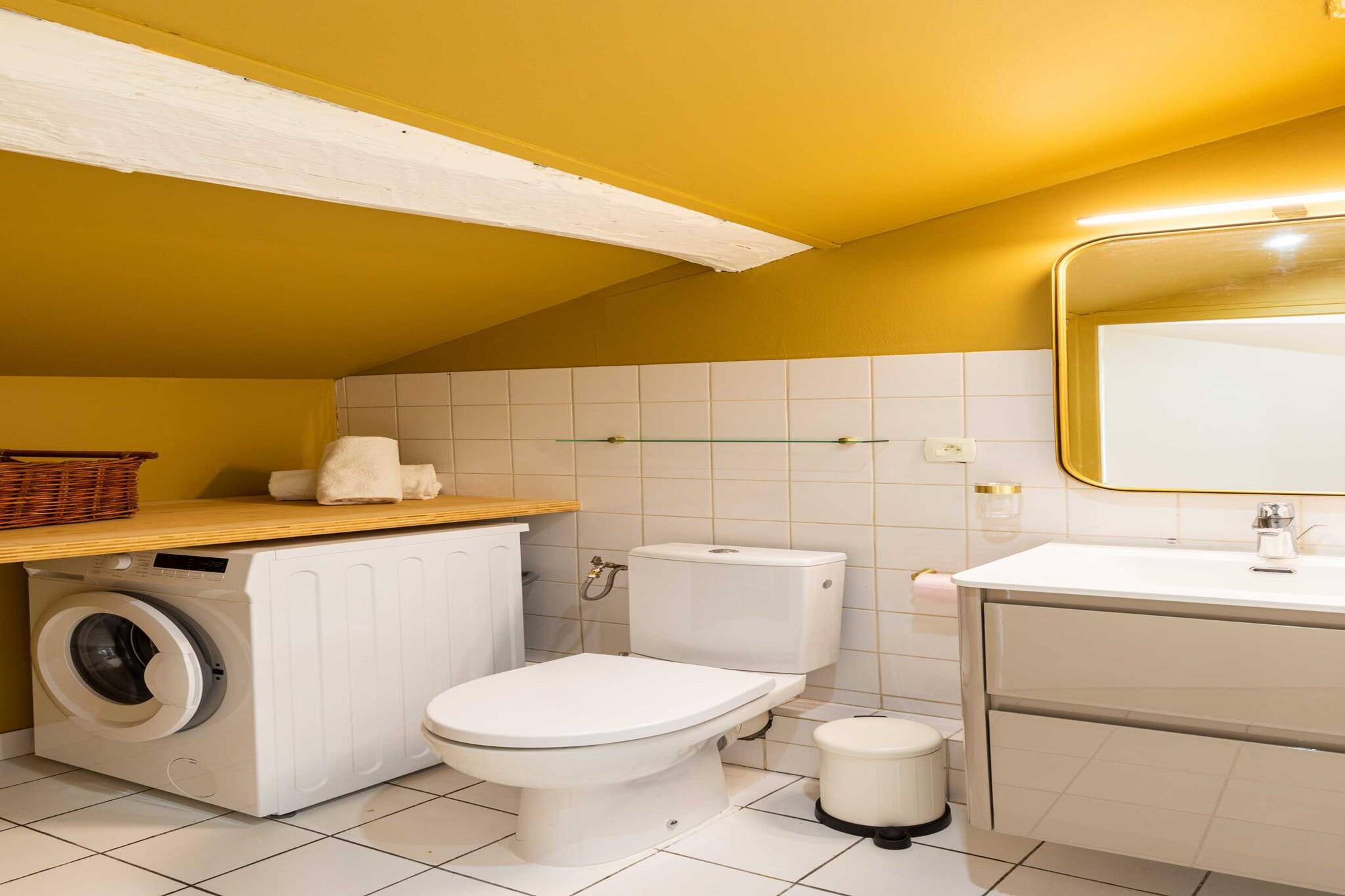 On the 1st floor: (Living room(double sofa bed, TV), Kitchen(electric kettle, toaster, cooker, coffee machine, microwave, dishwasher, fridge, dishes and cutlery, Cooking basics, Wine glasses), bedroom(Bed Linen, Queen Bed)) Attic: (bathroom(Hot Water, washbasin, toilet, washing machine, hairdryer, Towels incl., shampoo, body soap)) Internet Access DSL, Wardrobe, heating, high chair, iron, Essentials, Carbon monoxide detector, Cleaning Disinfection, Cleaning before checkout, Enhanced cleaning practices, High touch surfaces disinfected, Long term stays allowed, Washer in common space
