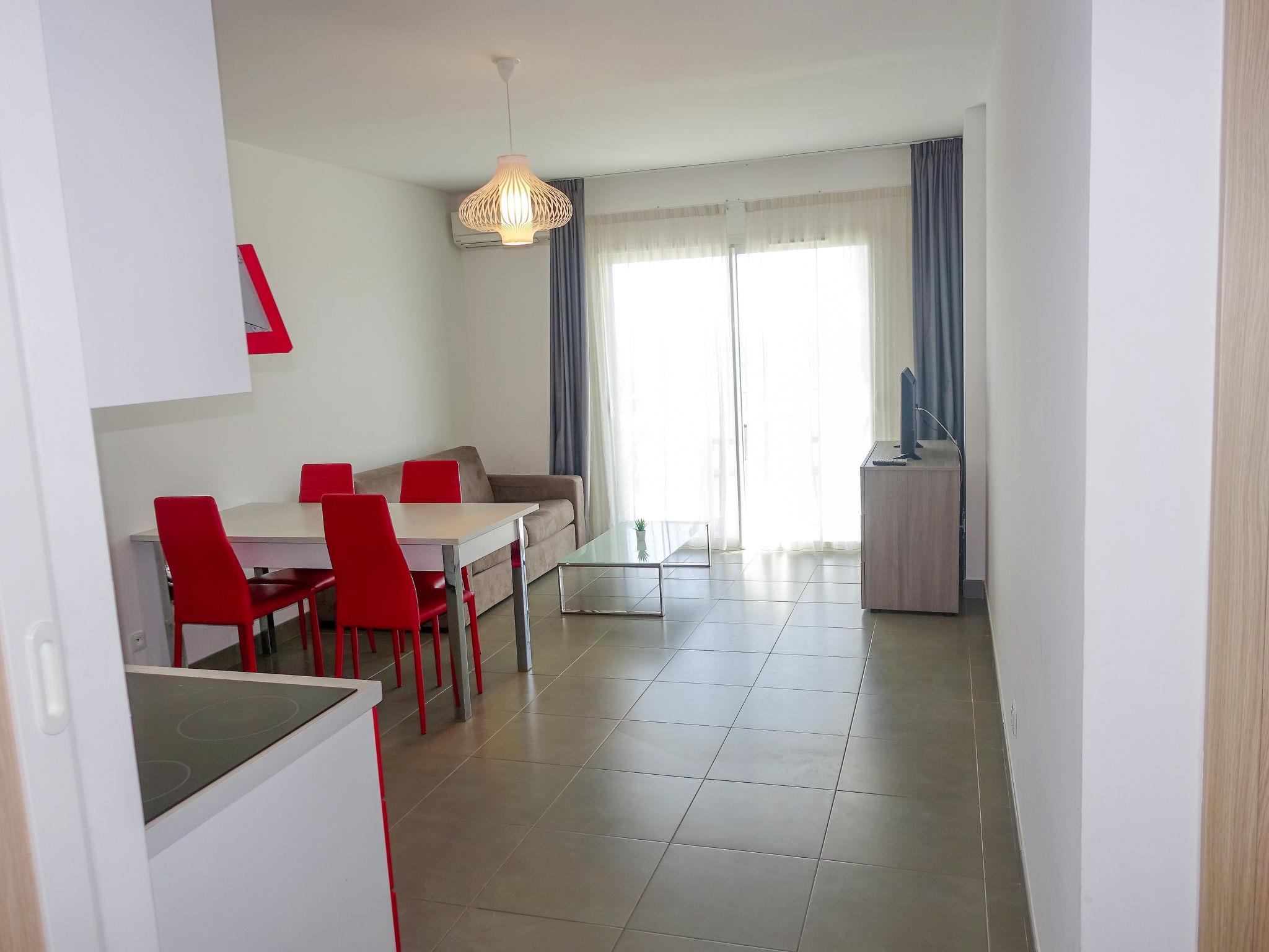"T2 vue cap", 2-room apartment 40 to 44 m2. Comfortable furnishings: living/dining room with 1 double sofabed (140 cm, length 190 cm), TV (flat screen), air conditioning. Exit to the terrace. 1 room with 1 french bed (140 cm, length 190 cm). Kitchenette (oven, 2 induction hot plates, kettle, microwave, electric coffee machine). Bathroom, sep. WC. Electric heating. Terrace furniture. View of the sea. Please note: maximum 1 pet/ dog allowed. Smoke alarm.