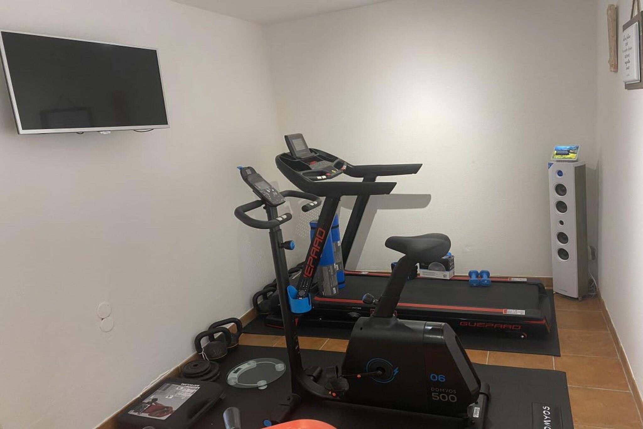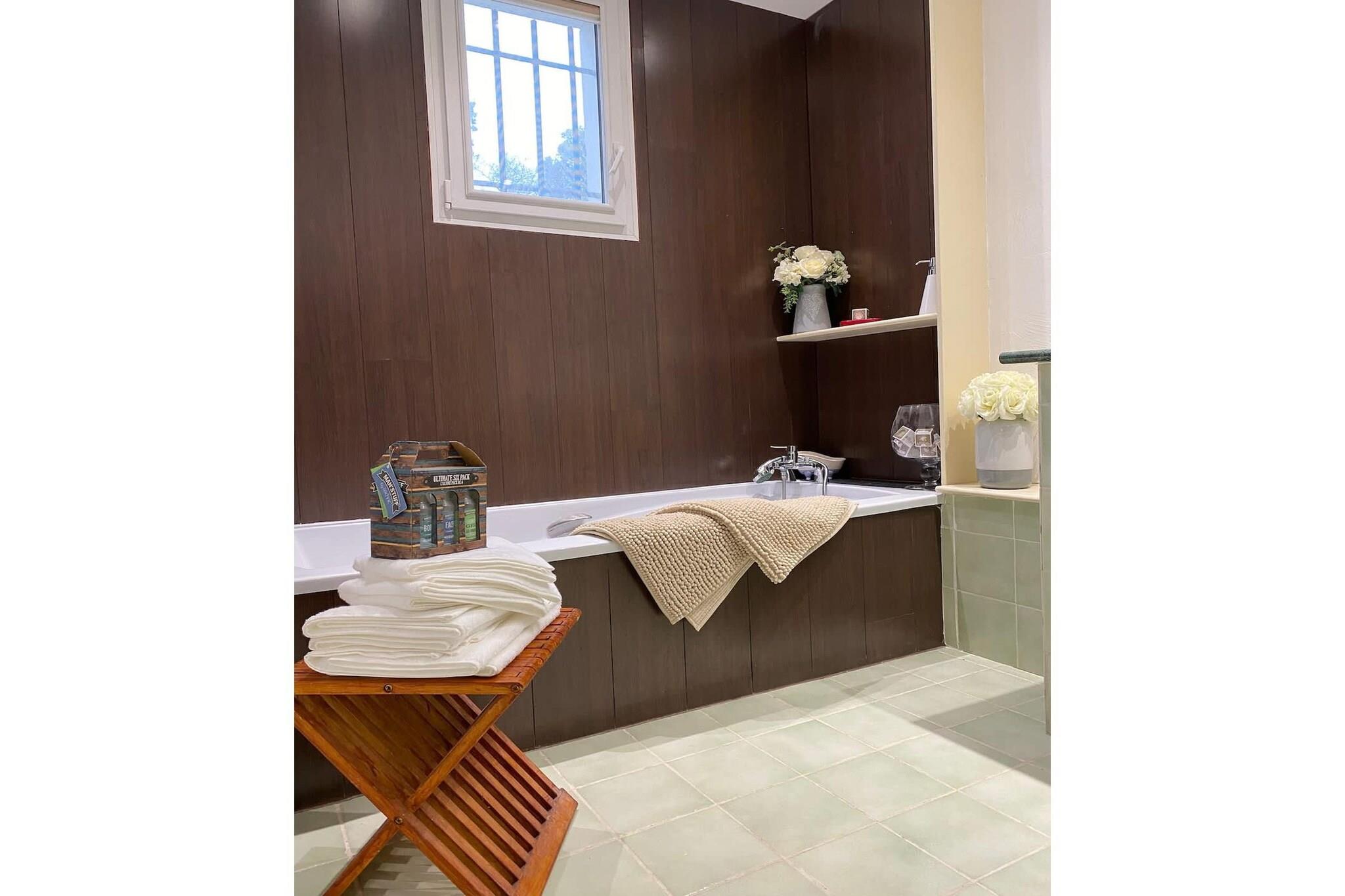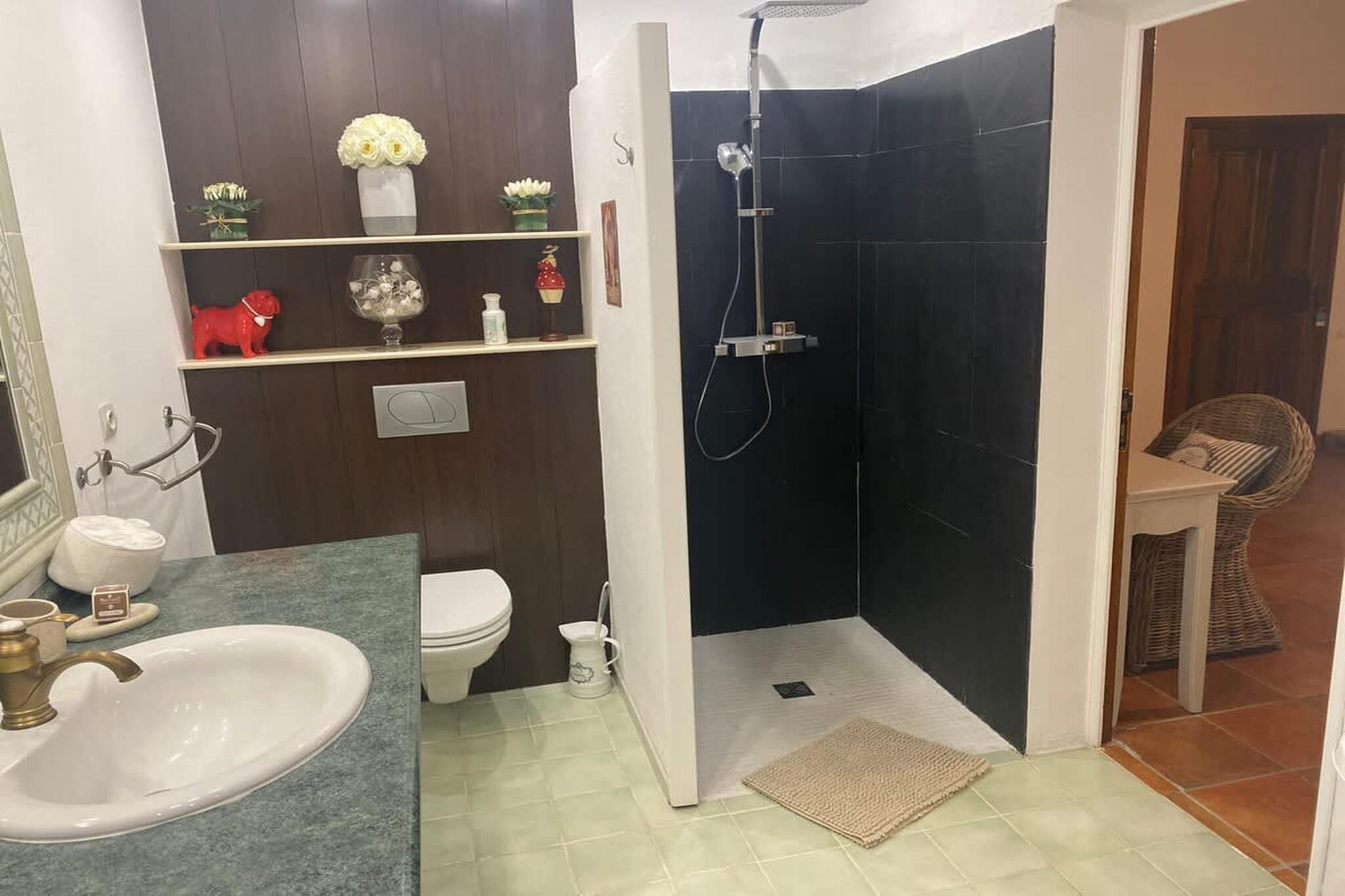 Ground floor: (Living room(fireplace, seating area), dining room(TV, dining table), open kitchen(stove, electric kettle, toaster, coffee machine, oven, microwave, dishwasher, fridge, freezer, dishes and cutlery, Cooking basics, Wine glasses), Bedroom with bathroom(double bed, TV, bath tub, washbasin, toilet)) On the 1st floor: (Bedroom with bathroom(double bed, TV, bath tub, washbasin, toilet), Bedroom with bathroom(double bed, TV, bath tub, washbasin, toilet), Bedroom with bathroom(double bed, TV, bath tub, washbasin, toilet), Bedroom with bathroom(double bed, TV, bath tub, washbasin, toilet)) Bed Linen, Fan, Hot Water, Internet Access DSL, Safe, Wardrobe, garage, First Aid, Babysit service, Play area, tumble dryer, baby bath, washing machine, balcony or terrace, heating, air conditioning, garden, garden furniture, BBQ, parking, changing mat, swimming pool(private, outside, heated), table tennis table, high chair, iron, hairdryer, party games, toys, insect screens, plancha grill, crib(free), Towels/Sheets (Incl.), shampoo, body soap, Essentials, Dedicated workspace, Carbon monoxide detector, Cleaning products, Extra pillows and blankets, Rural, Shower gel
