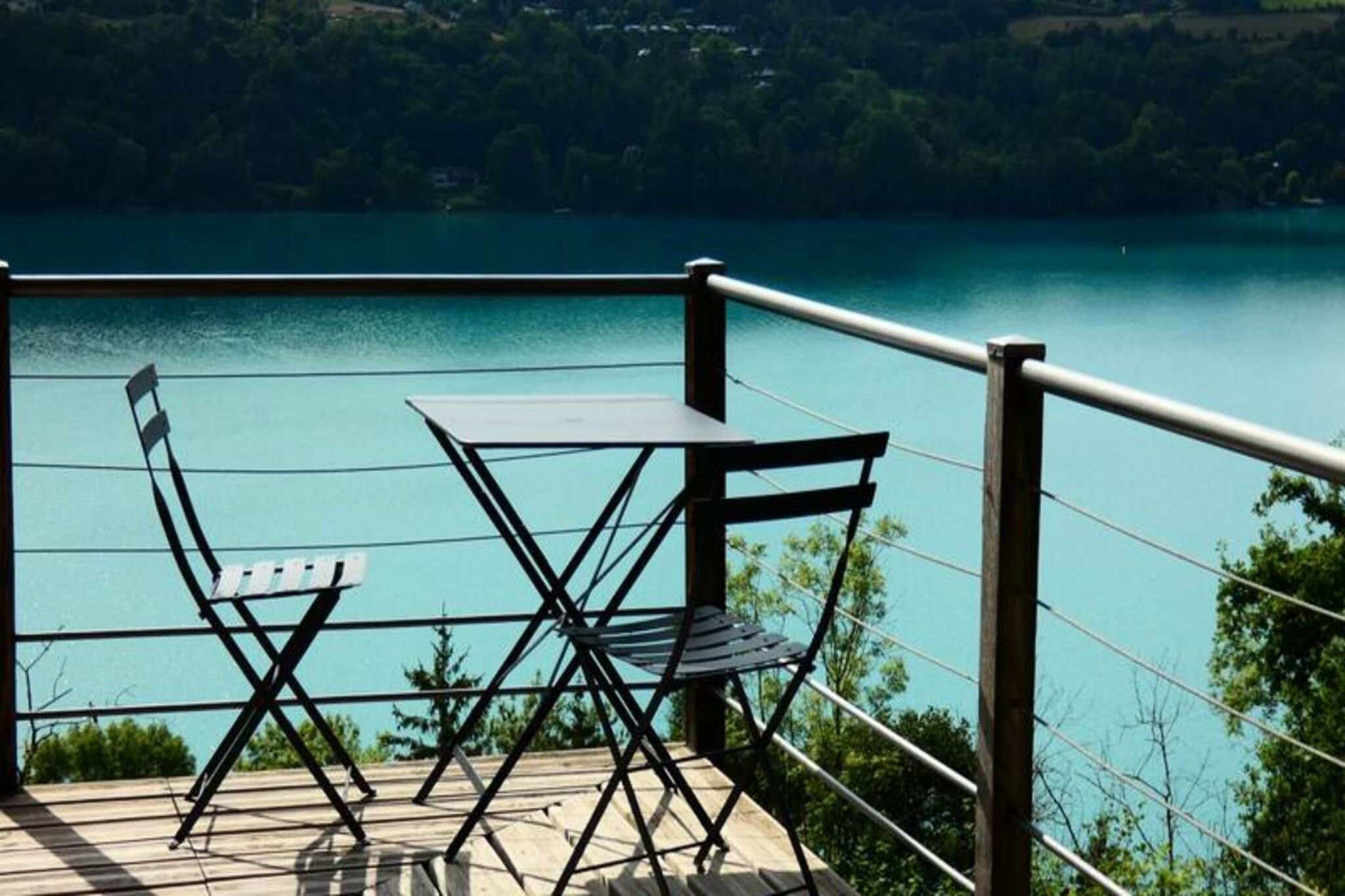 The SEEBLICK lodge is the dream place for you. to recharge your batteries while enjoying a panorama of Lake Paladru take your breath away. With its terrace suspended from above; hillside and its SPA, you can enjoy unforgettable moments of relaxation. ArrayWant to wake up with an extraordinary view, to enjoy evenings contemplating an exceptional horizon line: the SEEBLICK cottage is waiting for you. Hanging &àgrave; hillside, the chalet offers you a panoramic view; 180 degrees over Lake Paladru, its turquoise waters and surrounding hills. The balcony running all around the chalet takes you onto the terrace: Out of sight, it is equipped with a spa in which you can relax while enjoying this view from above. take your breath away. A plancha area and a dining table will also allow you to enjoy meals outside. Completely renovated In a modern chalet spirit, the SEEBLICK cottage offers a large living room: a fully equipped kitchen (induction hob, oven, microwave, dishwasher, refrigerator/ freezer) open to a dining room. dining and living room with TV and air conditioning. The bedroom with its bay window overlooking the lake has a king size bed, a small dressing room, a TV and air conditioning. Finally, the accommodation is completed by a bathroom with sink, shower and shower. Italian and ice cream machine wash. The supply of tea towels and bath mats is included in the cleaning costs. The beds are made to order. your arrival. A towel and bath towel per person will also be provided. arrangement. Replacement of bed linen and towels during the stay will be charged separately. &àgrave; rate of 13 EUR/double bed and 4 EUR/towel and bath sheets. Think about it take your beach towel to enjoy swimming outside. less than 2 minutes by car. The accommodation is equipped with a connected lock allowing autonomous entry. Other remarks Rental only at the week during the summer season. Parties are not permitted. Smoking is prohibited inside; inside. It is requested normal use of the jacuzzi: it must be turned off and covered. after use. A statement of the electric meter will be established at upon your arrival: in the event of excessive electricity consumption, a flat rate may be withheld from the deposit. Children are not allowed: there are unprotected heights which make the SEEBLICK lodge incompatible with the presence of children under 10 years old. The accommodation is not suitable for to people mobility reduced. The SEEBLICK cottage is an independent chalet with an enclosed garden (gate and hedges). It offers the possibility of to park several vehicles. In order to allow the maintenance of green spaces, access to the ground floor (the masonry part of the chalet) remains accessible to those in charge. This does not affect privacy in any way. places because the living rooms and the spa terrace are located on the 1st floor. This accommodation is managed by Catherine. Less than 10 minutes away: nautical activities (sailing, pedal boats, diving), Pin and Paladru beaches, Archaeological Museum of Lake Paladru, equestrian center, lakeside cycle path. lake, mountain bike trails, hikes, fishing, tennis, barn Dimière and its exhibitions, Charavines, its market, its shops and its restaurants Less than 30 minutes: tree climbing, Voiron and its Caves de la Chartreuse, Walibi Road access: - coming from the North, either exit 9 from A48, or exit 9.1 from A43 - coming from the South, exit 9 from A48 Deposit (in euros) - 1500
