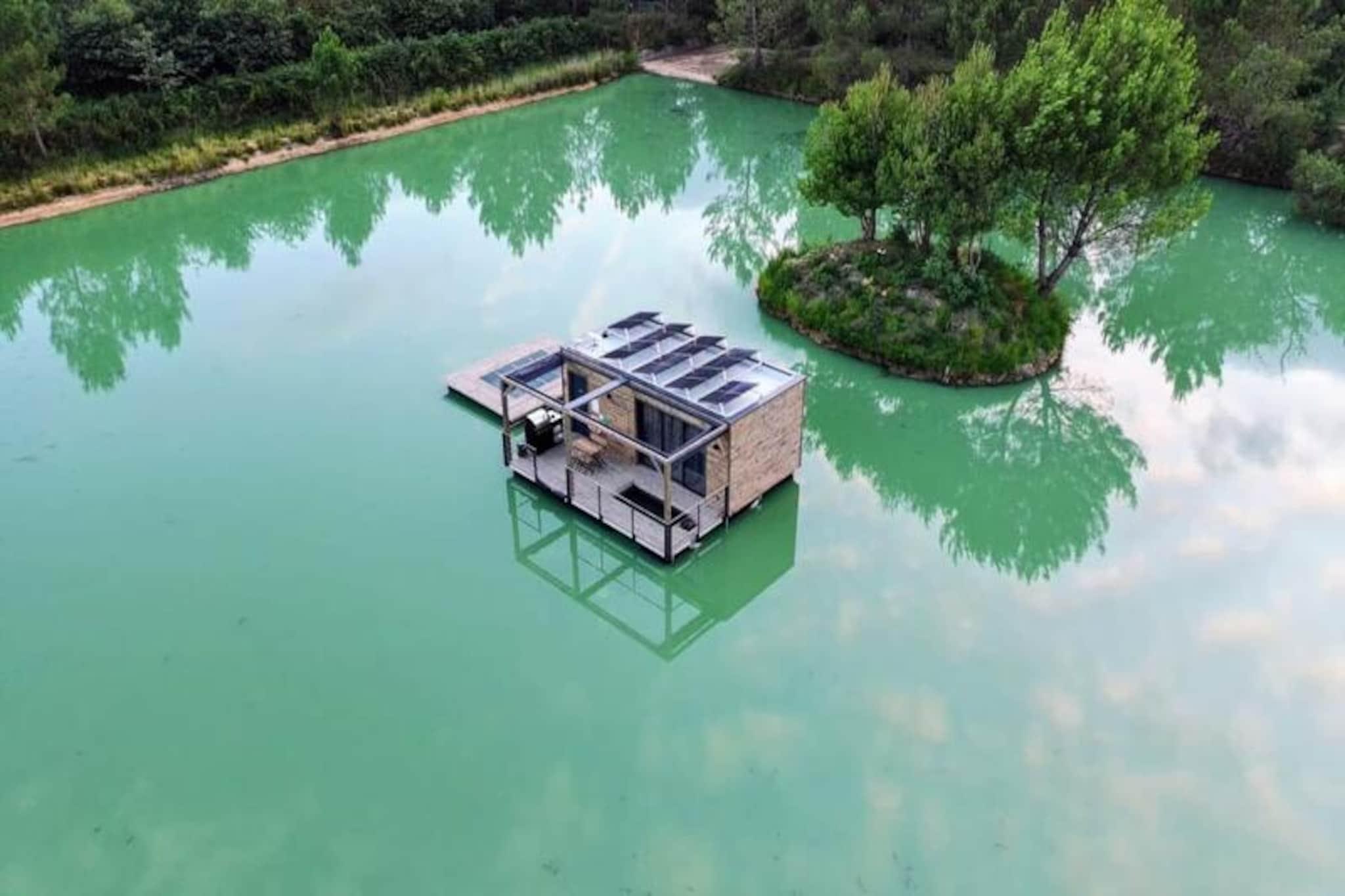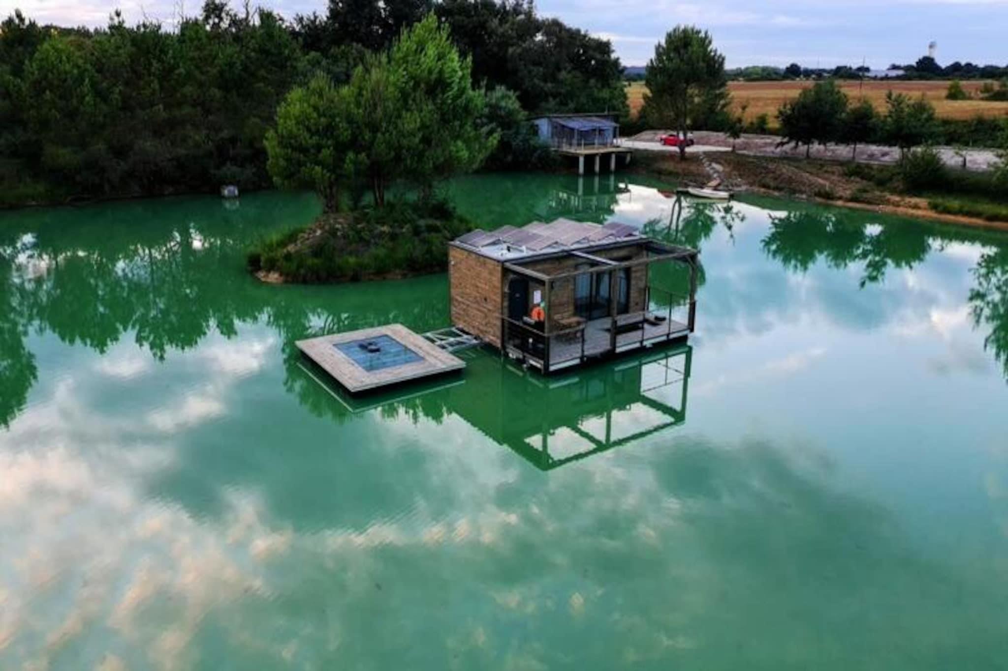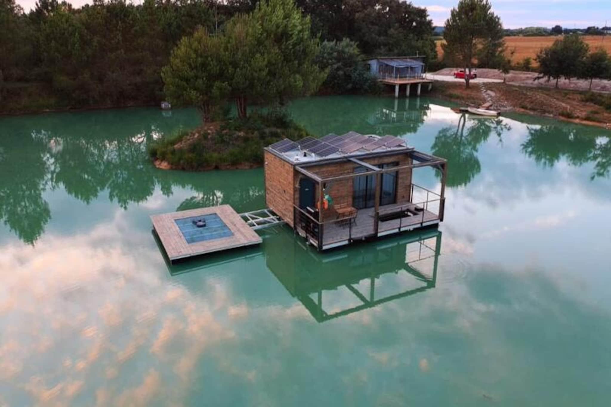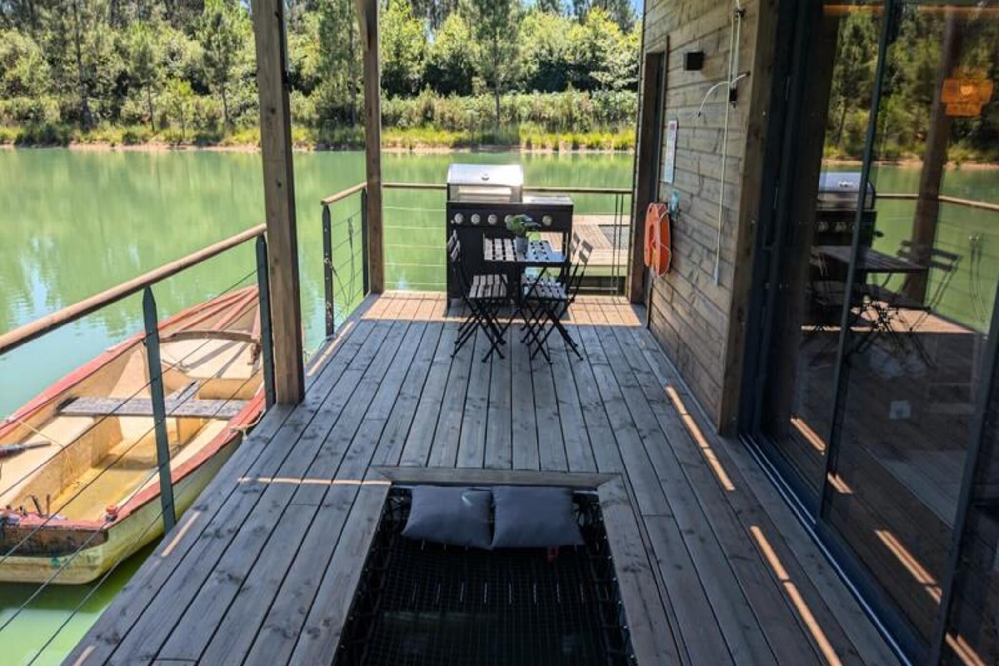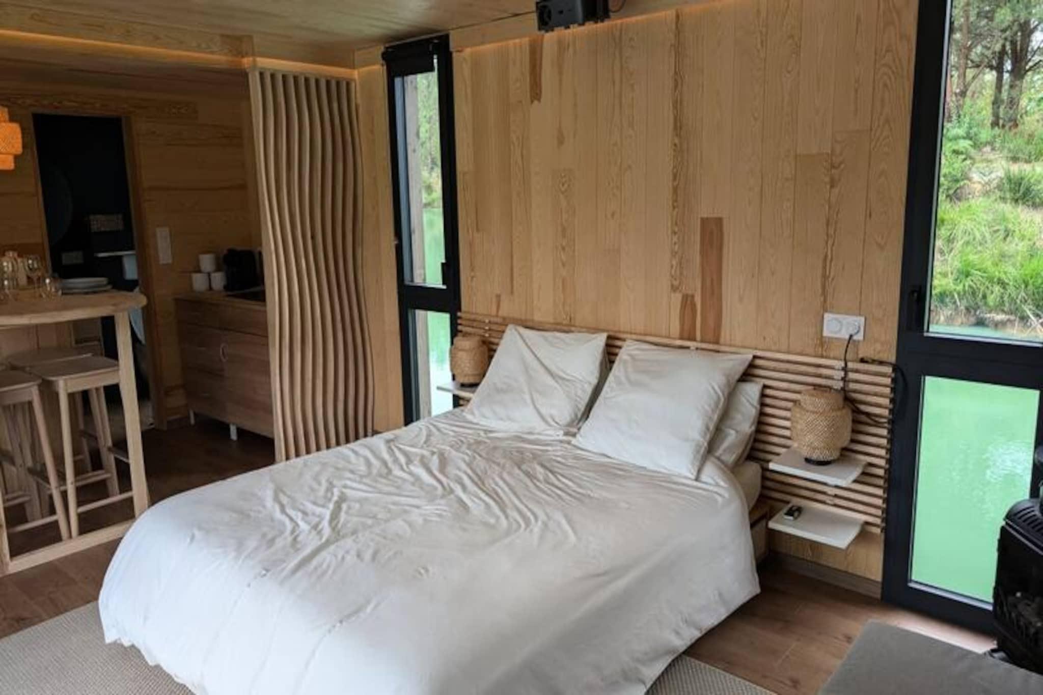 Imagine escaping to a serene floating lodge, gently swaying in the middle of a private pond, surrounded by untouched nature. Here, tranquility reigns supreme. There are no roads, no neighbors—just the soothing sound of water and the mesmerizing sight of koi carp gliding gracefully beneath your feet. Accessible only by motorboat, this unique retreat invites you to disconnect from the world and reconnect with the simple pleasures of life. The lodge’s minimalist design and natural setting create the perfect atmosphere for slowing down and savoring every moment. Inside, you’ll find all the comforts of modern living. A cozy double bed and a sofa bed accommodate up to four guests, while the fully equipped kitchen includes a refrigerator, gas stove, sink, and coffee maker. The bathroom features a shower and eco-friendly toilet, with filtered water for your convenience. Entertainment is at your fingertips with a video projector offering Netflix, Prime Video, and Disney+. Solar electricity and satellite Wi-Fi ensure a self-sufficient yet connected experience. In winter, a gas stove keeps you warm, while a fan provides comfort during summer. Step outside to your private terrace, complete with garden furniture, a gas barbecue, and a suspended net over the water—perfect for relaxing and soaking in the peaceful surroundings. The lodge’s eco-conscious design includes solar power and wastewater treatment by phytoremediation, ensuring harmony with the environment. Optional extras like a breakfast basket or gourmet charcuterie board add a touch of indulgence to your stay. Located just an hour from Bordeaux and Bergerac, this secluded haven offers the ultimate escape from the hustle and bustle of daily life. Whether you’re watching the koi carp, listening to the wind in the trees, or simply enjoying the stillness, this floating lodge promises a timeless experience to reconnect with nature and yourself.
