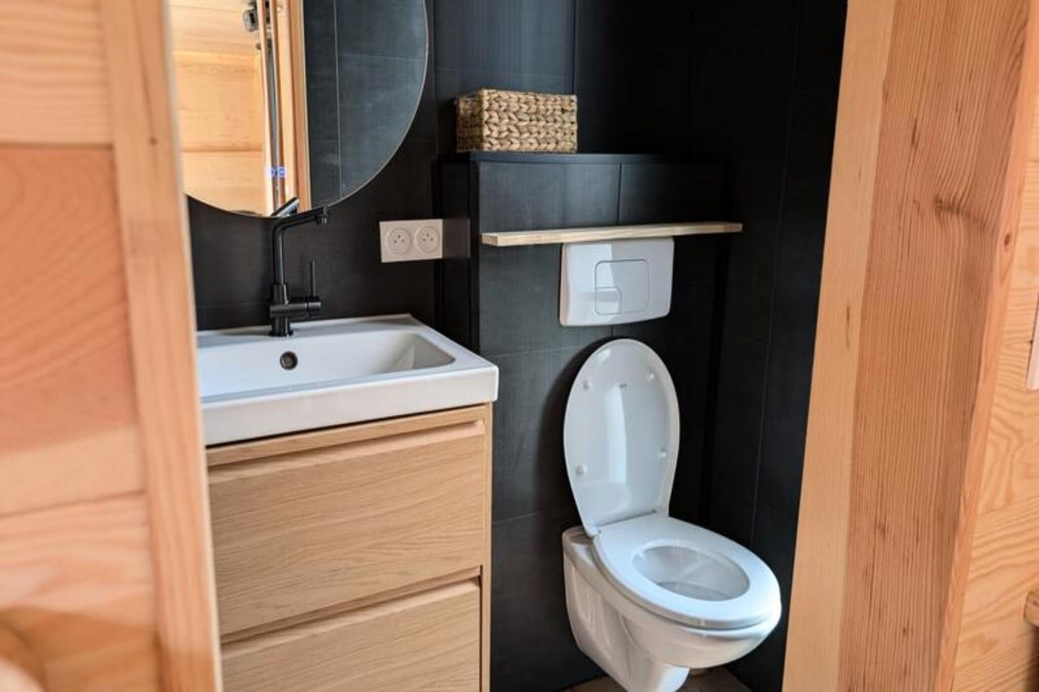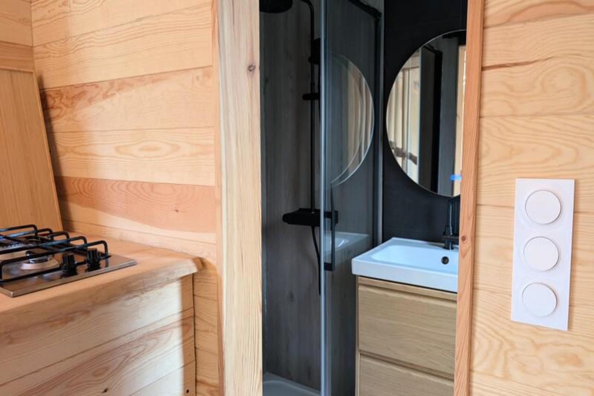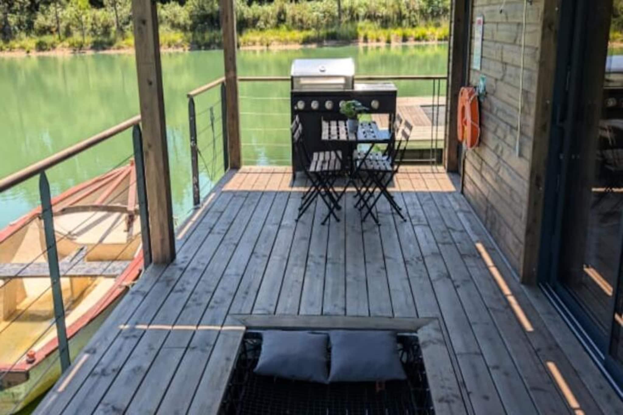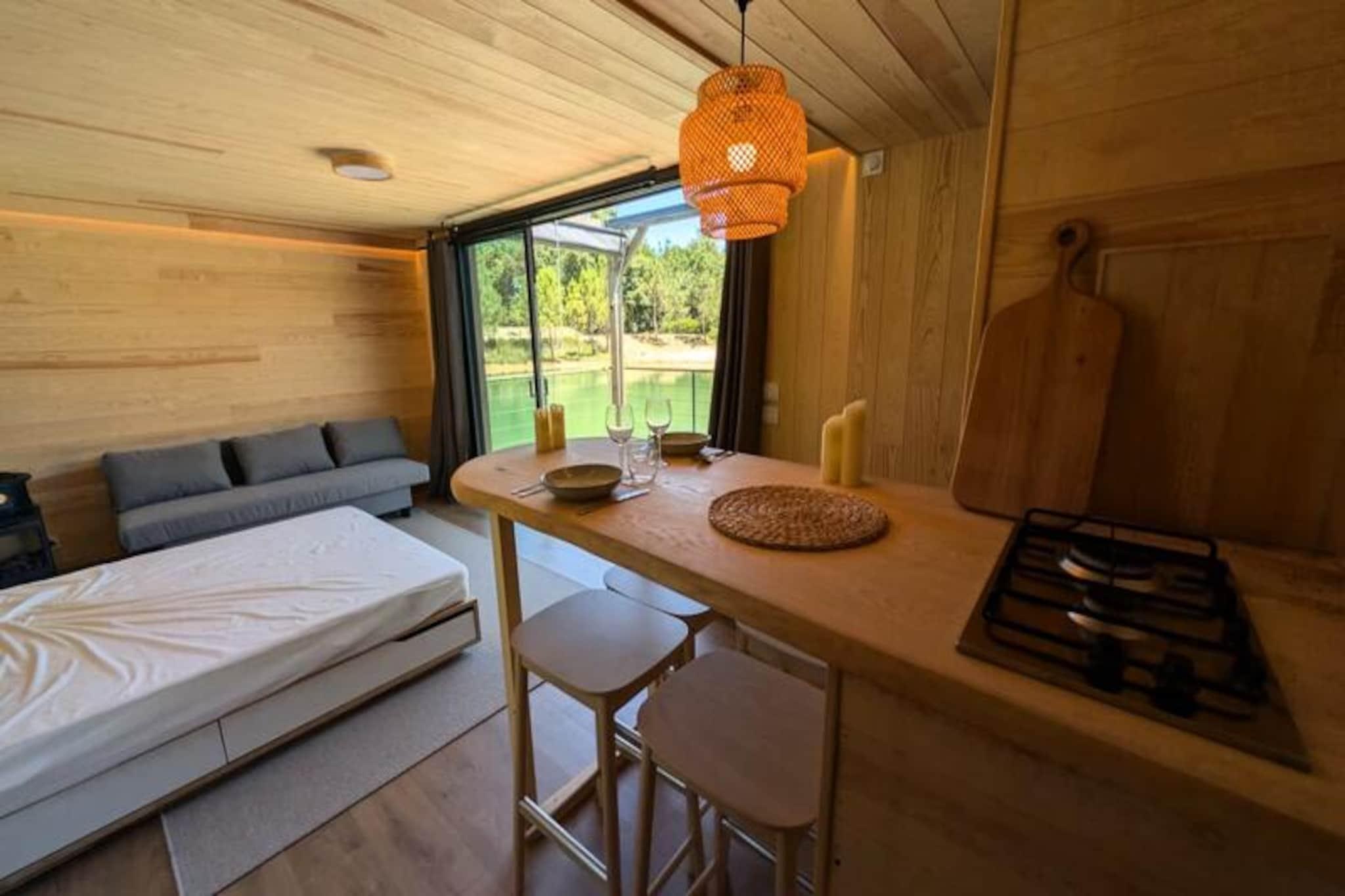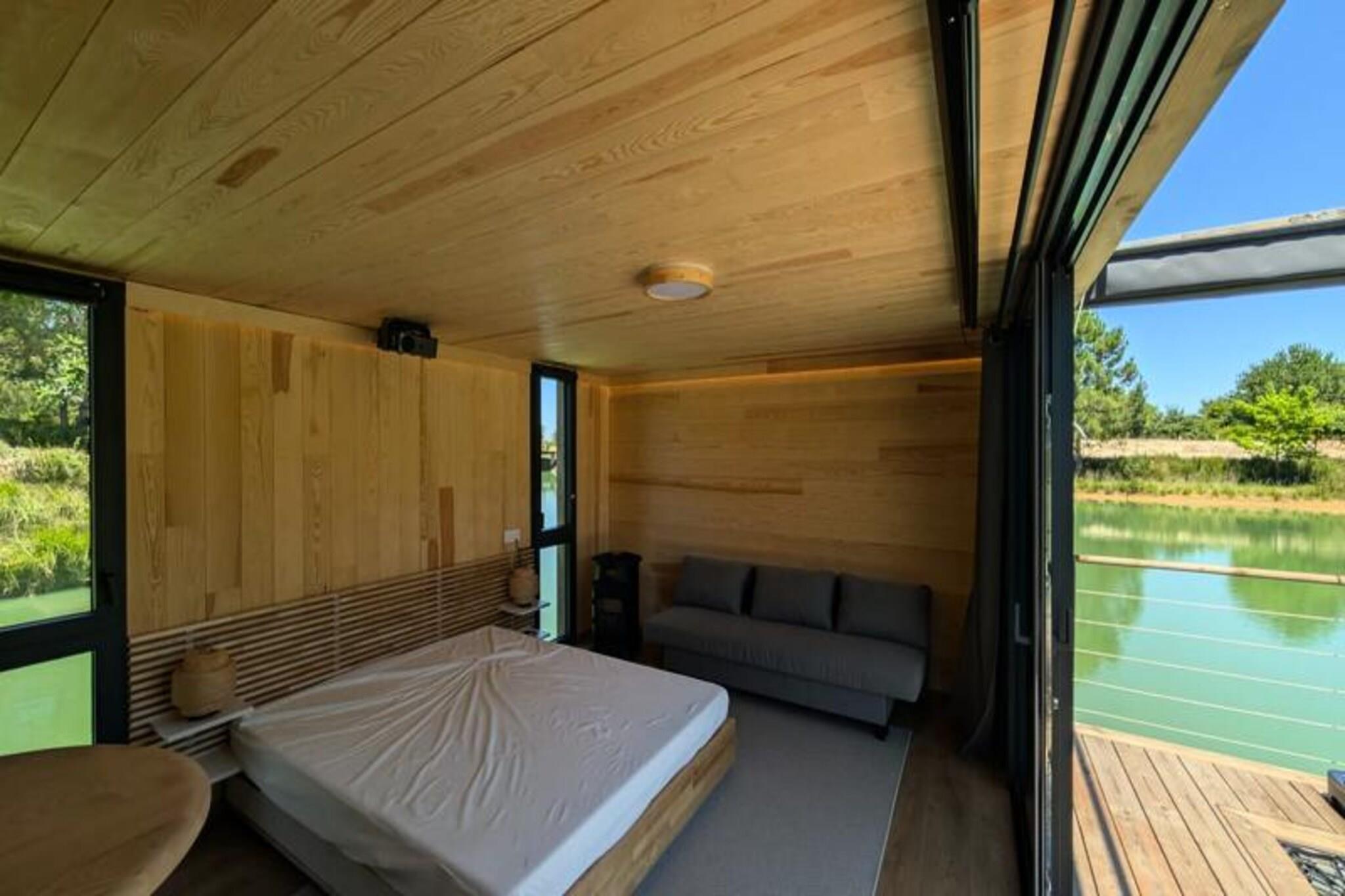 Imagine escaping to a serene floating lodge, gently swaying in the middle of a private pond, surrounded by untouched nature. Here, tranquility reigns supreme. There are no roads, no neighbors—just the soothing sound of water and the mesmerizing sight of koi carp gliding gracefully beneath your feet. Accessible only by motorboat, this unique retreat invites you to disconnect from the world and reconnect with the simple pleasures of life. The lodge’s minimalist design and natural setting create the perfect atmosphere for slowing down and savoring every moment. Inside, you’ll find all the comforts of modern living. A cozy double bed and a sofa bed accommodate up to four guests, while the fully equipped kitchen includes a refrigerator, gas stove, sink, and coffee maker. The bathroom features a shower and eco-friendly toilet, with filtered water for your convenience. Entertainment is at your fingertips with a video projector offering Netflix, Prime Video, and Disney+. Solar electricity and satellite Wi-Fi ensure a self-sufficient yet connected experience. In winter, a gas stove keeps you warm, while a fan provides comfort during summer. Step outside to your private terrace, complete with garden furniture, a gas barbecue, and a suspended net over the water—perfect for relaxing and soaking in the peaceful surroundings. The lodge’s eco-conscious design includes solar power and wastewater treatment by phytoremediation, ensuring harmony with the environment. Optional extras like a breakfast basket or gourmet charcuterie board add a touch of indulgence to your stay. Located just an hour from Bordeaux and Bergerac, this secluded haven offers the ultimate escape from the hustle and bustle of daily life. Whether you’re watching the koi carp, listening to the wind in the trees, or simply enjoying the stillness, this floating lodge promises a timeless experience to reconnect with nature and yourself.
