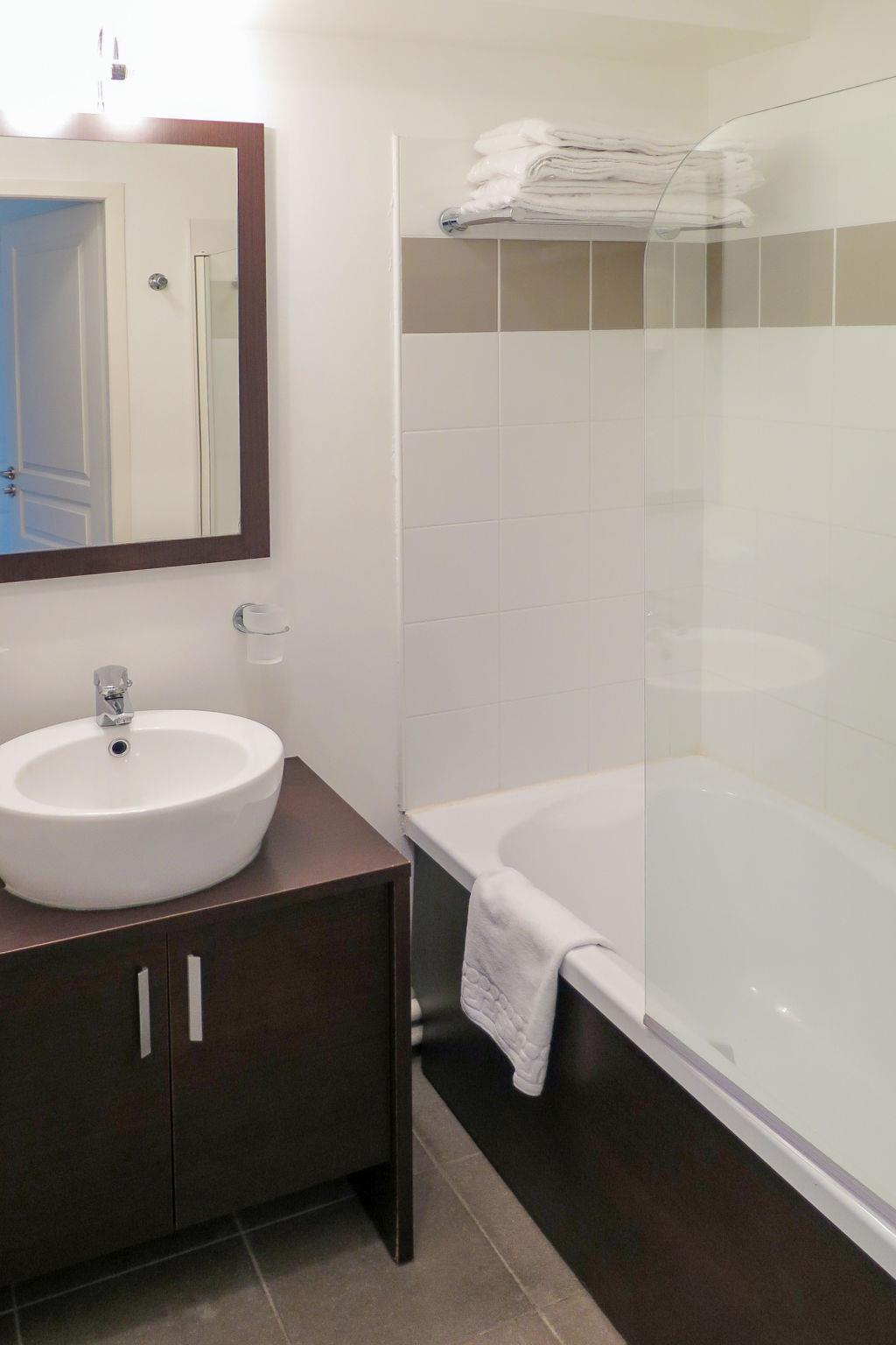 "Les Cottages du Lac T4 Privilège", 4-room apartment 45 m2. Bright, cosy furnishings: living/dining room with dining table and satellite TV (flat screen). Exit to the balcony, to the terrace. 1 room with sliding door with 1 french bed (140 cm, length 190 cm), shower. 1 room with 2 beds (80 cm, length 190 cm). 1 room with 1 x 2 bunk beds (80 cm, length 180 cm). Open kitchen (dishwasher, 4 ceramic glass hob hotplates, toaster, kettle, microwave, electric coffee machine, Capsules for coffee machine (Nespresso) extra). Bathroom, sep. WC. Electric heating. Balcony or terrace roofed. Balcony furniture. Facilities: children's high chair, baby cot (extra). Internet (WiFi, free). Please note: non-smokers only. Maximum 1 pet/ dog allowed. Smoke alarm, fire extinguisher.