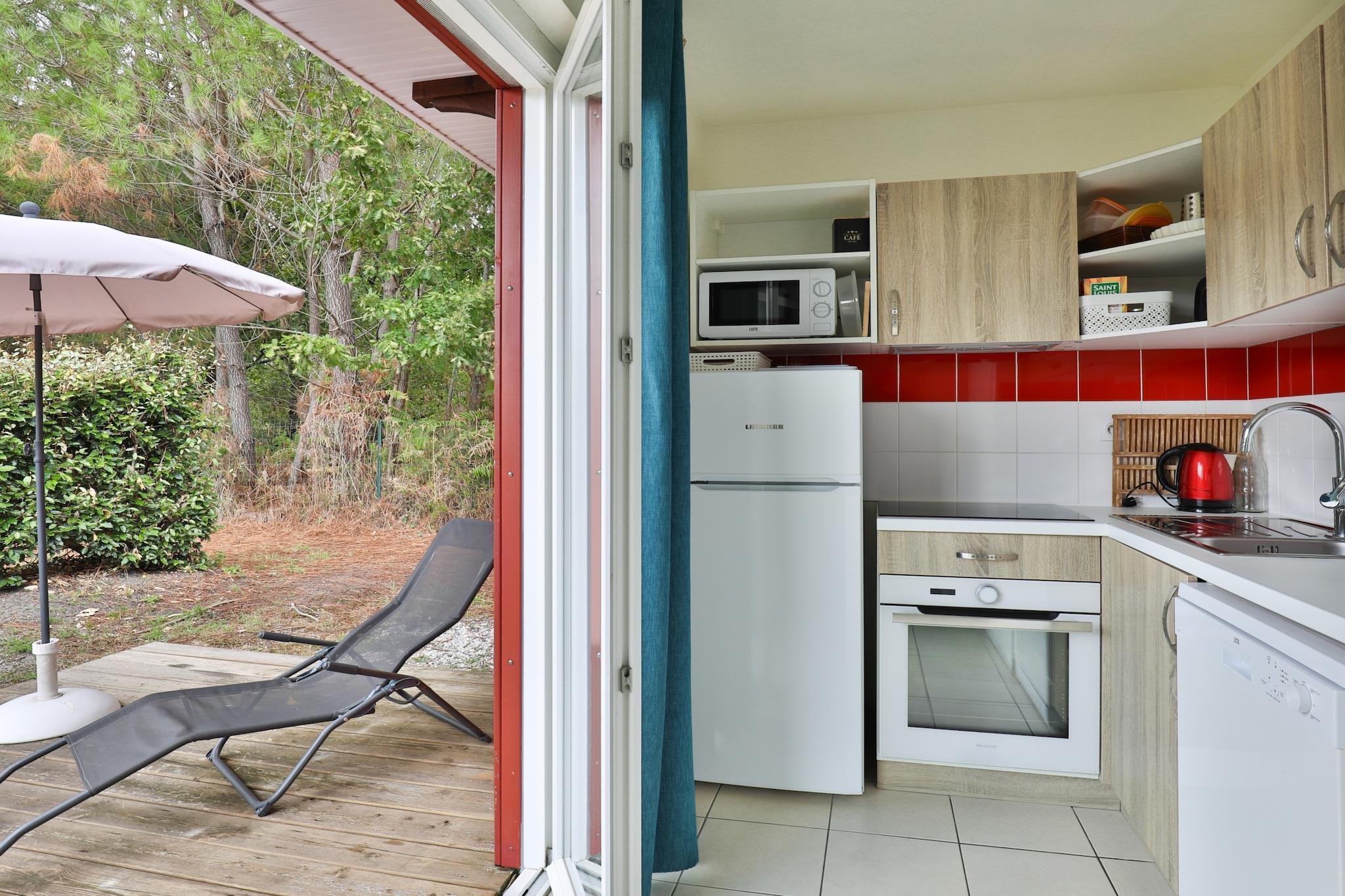 Welcome to your peaceful lakeside retreat in Parentis-en-Born – an elegant and bright villa designed for families and friends seeking both comfort and connection with nature. This beautifully furnished 58 m² villa can accommodate up to 8 guests and combines modern living with a touch of coastal charm. Just 350 metres from the sandy beaches of Etang de Parentis and surrounded by local cafés and shops, it is the perfect base for a relaxing holiday in the Landes region. Inside, you will find a cosy living room with a comfortable sofa bed and TV, perfect for relaxing after a sunny day. The fully equipped open-plan kitchen makes mealtimes easy, complete with an oven, dishwasher, fridge, coffee maker, kettle and toaster. The villa has three welcoming bedrooms – two with double beds and one with single beds and a bunk bed, offering flexible sleeping arrangements for families or groups. The bathroom with bathtub invites you to unwind, while the terrace and garden furniture create the perfect setting for morning coffee or evening meals under the open sky. The residence offers more than just relaxation: enjoy a refreshing dip in the communal heated pool or keep up your workout routine in the gym before melting away the stress in the indoor jacuzzi. With a fantastic restaurant just steps away, a nearby supermarket and a peaceful, family-friendly atmosphere, this villa has everything you need for a truly rejuvenating stay between the lake and the sea.