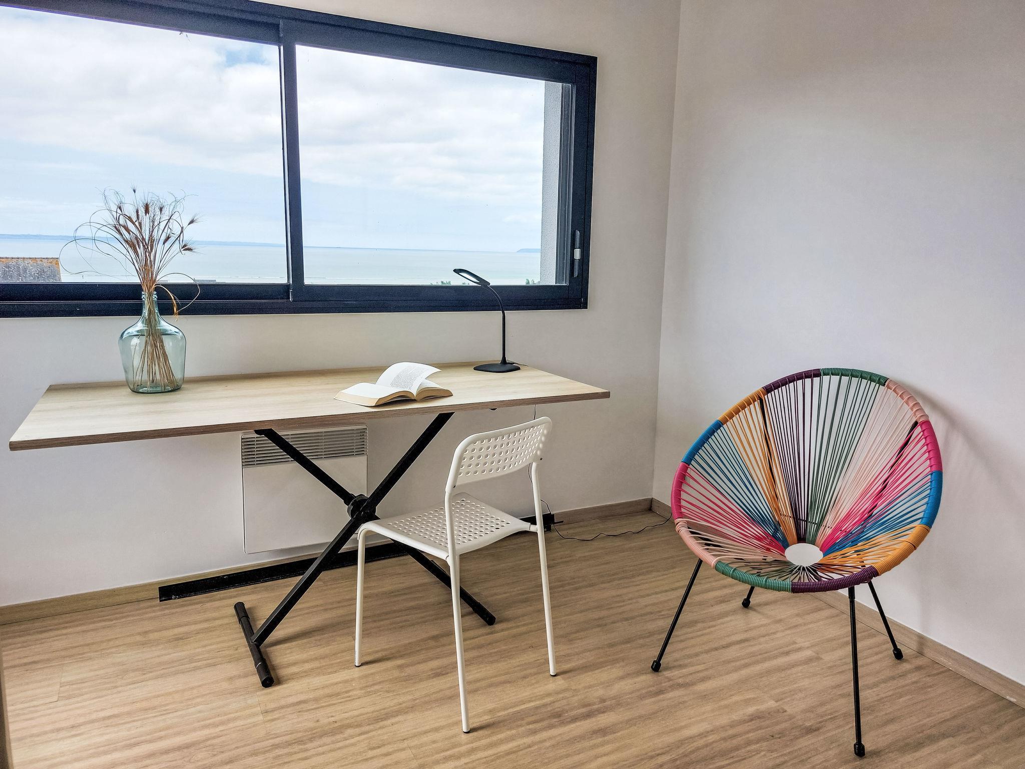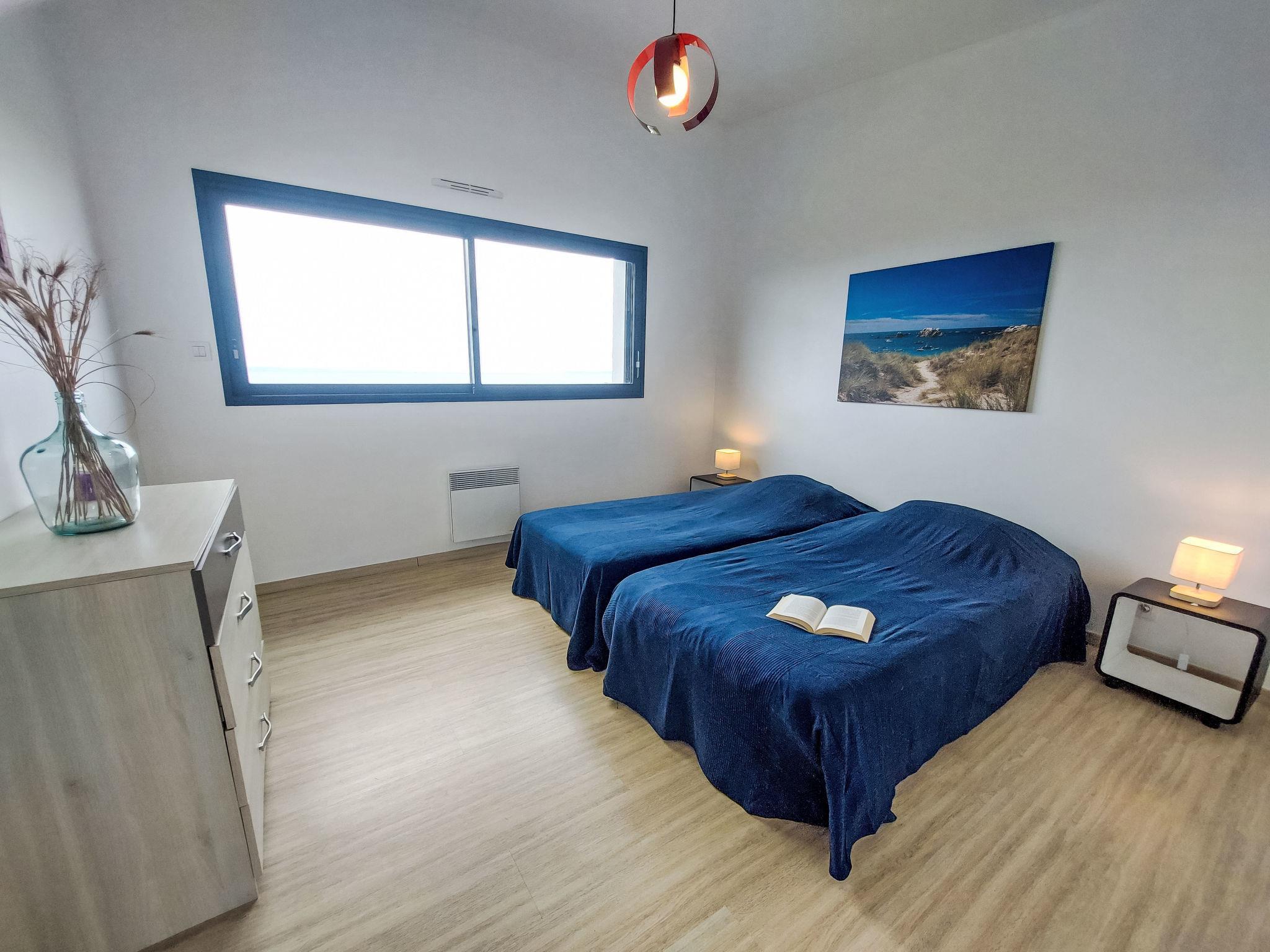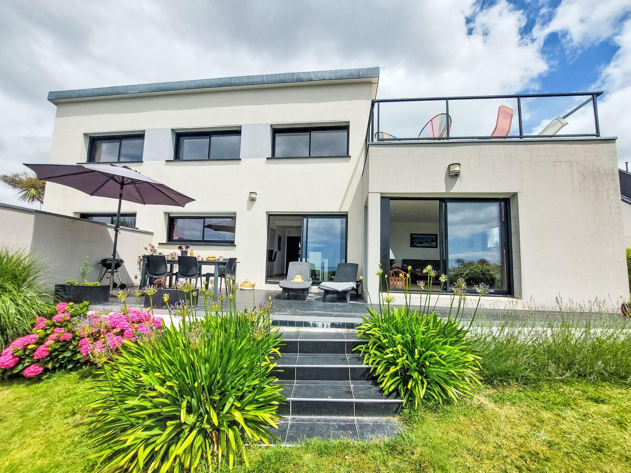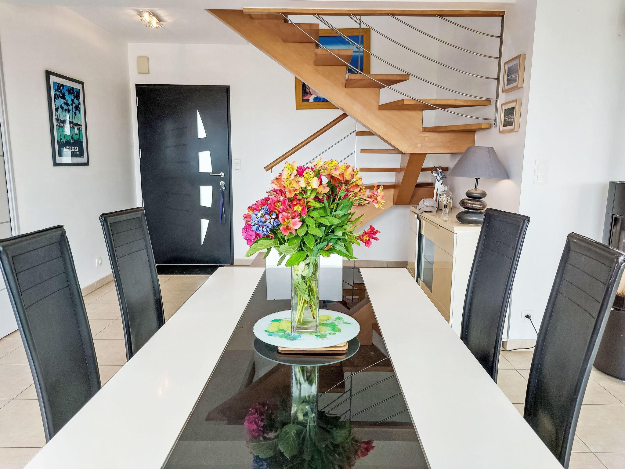 "L'Iroise", 4-room house 160 m2 on 2 levels. Beautiful and modern furnishings: living/dining room with Scandinavian wood stove, dining table and satellite TV. Exit to the terrace. 1 room with 1 french bed (140 cm, length 190 cm). Open kitchen (oven, dishwasher, 3 induction hot plates, toaster, kettle, microwave, freezer, electric coffee machine) with bar. Shower/WC. Underfloor heating. Upper floor: 1 room with sloping ceilings with 1 french bed (140 cm, length 190 cm). 1 room with 2 beds (90 cm, length 190 cm). Bathroom, sep. WC. Electric heating. Parquet floors. Balcony, terrace, south facing position. Terrace furniture, balcony furniture, electric barbecue, deck chairs (4). View of the sea and the bay. Facilities: washing machine, iron, children's high chair, baby cot, hair dryer. Internet (WiFi, free). Please note: non-smoking house. Maximum 1 pet/ dog allowed. Smoke alarm. When there are less than the maximum number of guests staying at the property, not all of the bedrooms will be available for use. Offer by a private individual according to Art. 155, IV of CGI.