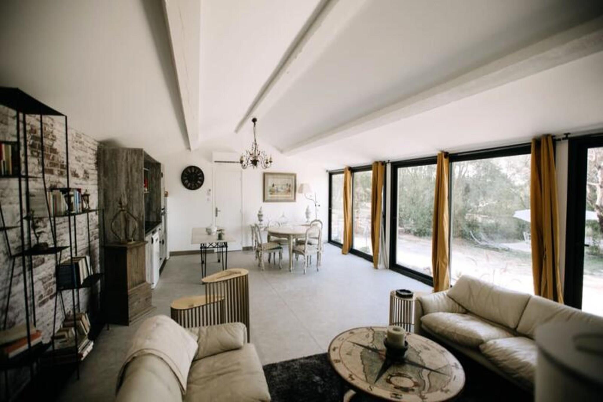 Nestled in the heart of the Pernes-les-Fontaines countryside, this charming apartment offers a peaceful retreat within a spacious 3-hectare park. The 60 m² property includes a comfortable, air-conditioned bedroom for restful nights, and a living area with Wi-Fi access. Pets are not specified as allowed, ensuring a calm environment. For outdoor dining, the apartment is equipped with a gas plancha. Guests can also relax and enjoy the surrounding scenery in the private parking area. A security deposit of EURO800 is required and must be paid 10 days before arrival. Nearby, guests can explore the vibrant market of Pernes-les-Fontaines and visit the picturesque villages of the Luberon, such as Gordes and Roussillon. The charming streets of Isle-sur-la-Sorgue provide great opportunities for a leisurely stroll, while local vineyards offer wine tasting experiences. Whether you're interested in outdoor activities or cultural exploration, there is something for everyone in the region. The apartment boasts a fully equipped kitchen, complete with modern appliances like a Nespresso coffee machine and a gas plancha for al fresco meals. The bathroom features a sleek shower, while the 40 m² fitness area, complete with a sauna and jacuzzi, ensures total relaxation. Guests can also enjoy private access to a pool open from May to September, offering a refreshing way to unwind.