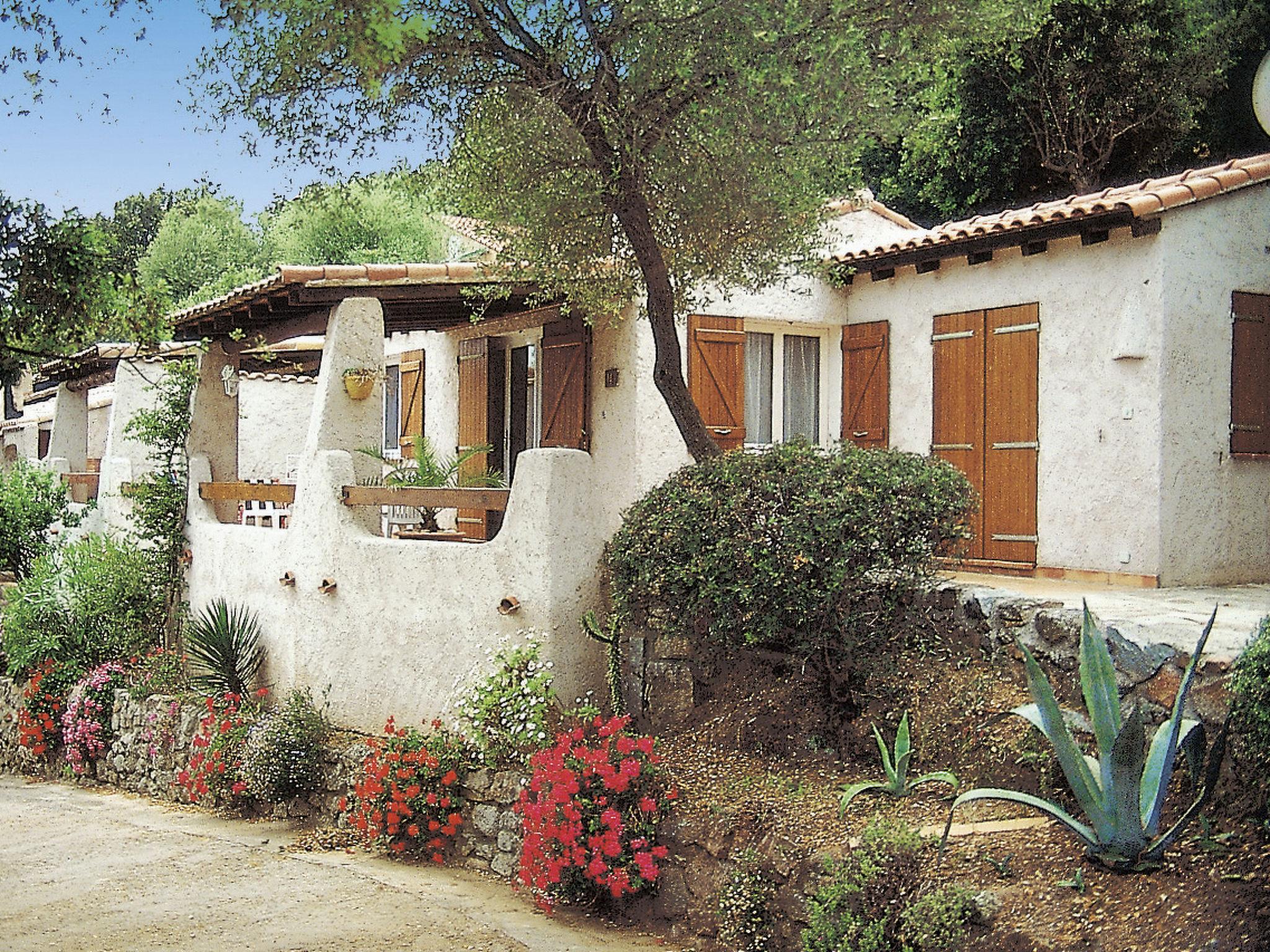 Olmucciu 8 km from Pinarellu: Small, cosy resort "Fium del Cavu". 25 houses in the residence. In the district of Olmucciu 8 km from the centre of Pinarellu, 16 km from the centre of Porto Vecchio, 131 km from the centre of Bastia, in a sunny position on a slope, 500 m from the sea, 500 m from the beach, 500 m from the river, in a cul-de-sac, in the countryside. For shared use: beautiful terraced garden with plants and trees, meadow, swimming pool fenced (16 x 8 m, seasonal availability: 14.May. - 28.Oct.). Outdoor shower, terrace. In the complex: reception, restaurant, bar, WiFi, billiard table. Parking on the premises. Shop 5 km, supermarket 16 km, bus stop 5 km, sandy beach "Plage de l'Ovu Santu" 500 m. Tennis 250 m. Please note: car recommended. The photograph shows a typical example. Wifi only at the reception.