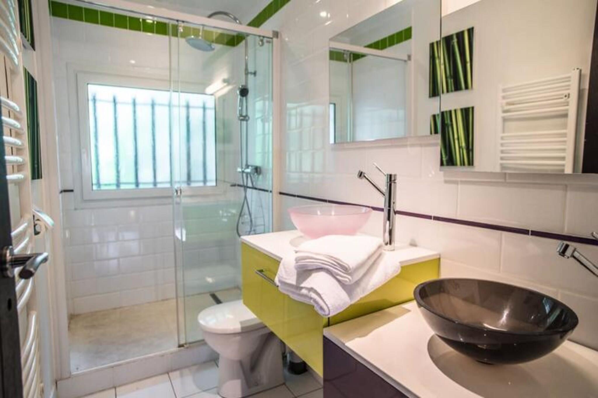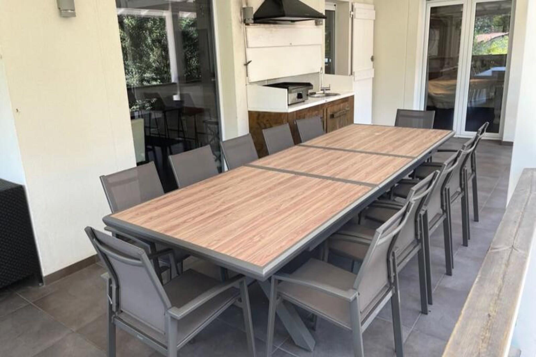 This beautiful Californian-style villa offers the ultimate comfort for up to 10 guests, featuring 5 spacious bedrooms and 4 bathrooms. The main level includes a bedroom with a large double bed and a private bathroom, along with a master bedroom with a canopy bed and ensuite. The mezzanine holds two bedrooms with twin beds and a shared bathroom. The garden level features another bedroom with its own bathroom, along with a games room and laundry area. The villa also has a heated swimming pool and a variety of outdoor spaces for relaxation. Please note that pets are not allowed, and a ?4000 deposit is required. Located just 5 minutes from the beach and the charming Moulleau center, this villa offers easy access to local cafes, markets, and restaurants. Enjoy a relaxing stroll to the beach or explore the nearby attractions, including the stunning coastal views and hiking trails. The area provides the perfect balance of peace and convenience, with all the amenities of the lively center within walking distance. The villa boasts a fully equipped kitchen with modern appliances, including a fridge-freezer, oven, microwave, and dishwasher. The open-plan living and dining area is perfect for entertaining, with a Sonos audio system, flat-screen TV, and ample seating. Enjoy outdoor dining with a large table and electric plancha on the spacious terrace, or relax in the shaded garden. Additional amenities include Wi-Fi, a ping-pong table, and a bowling alley for extra fun.