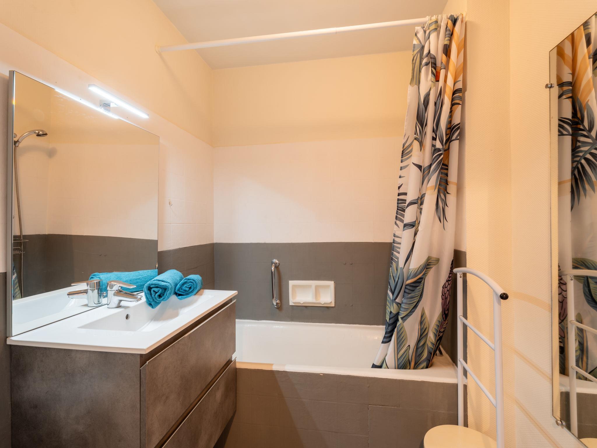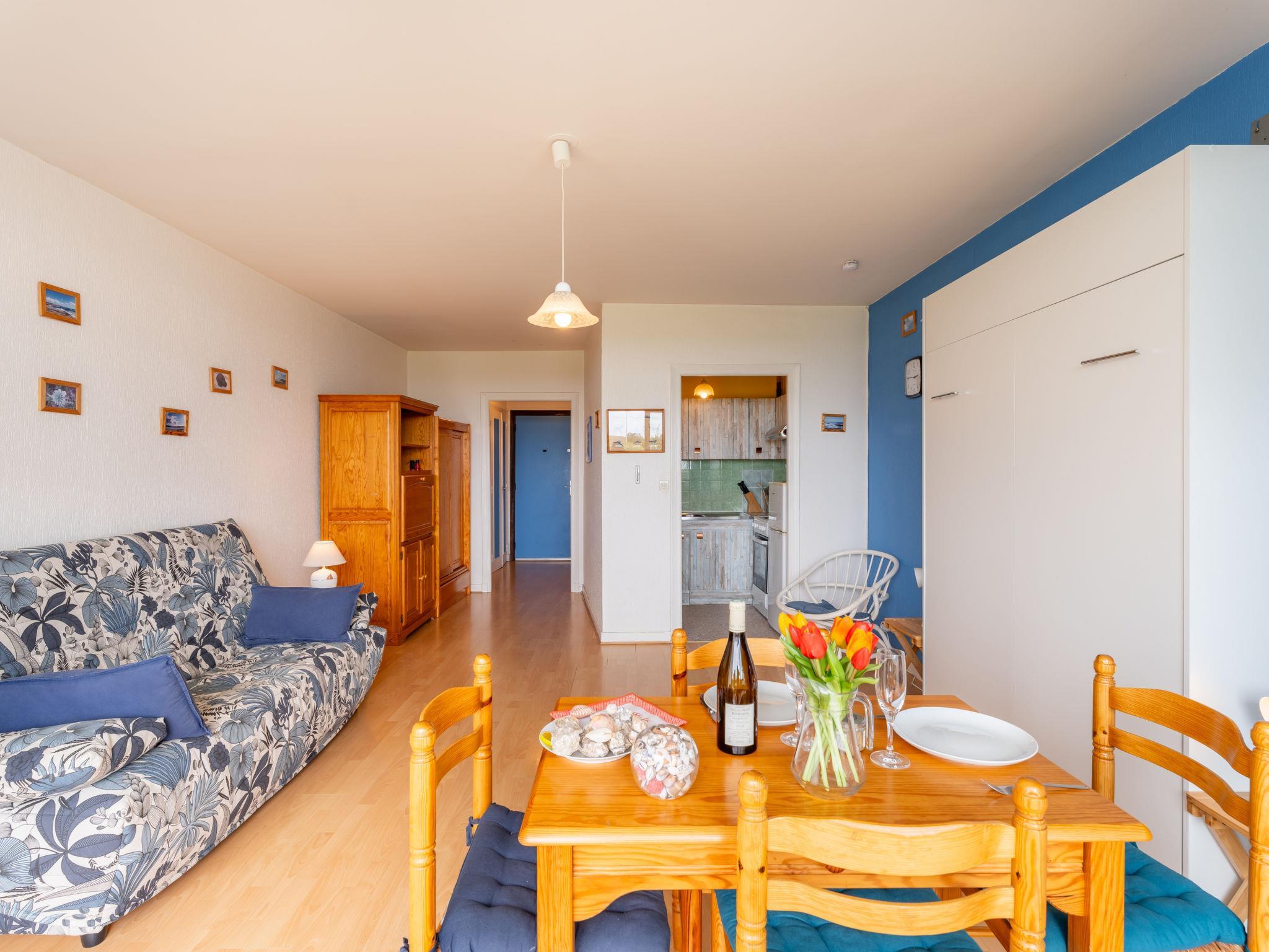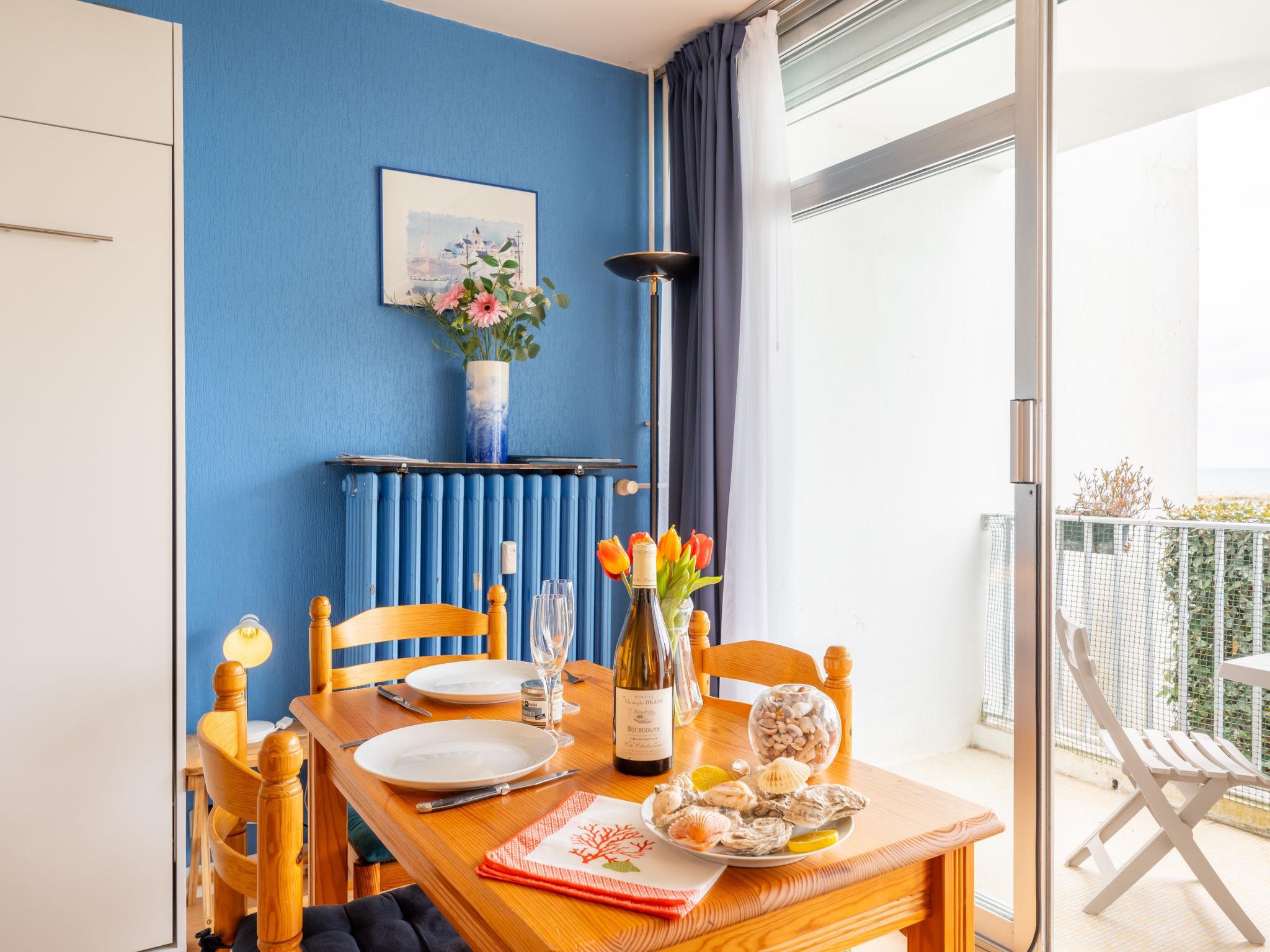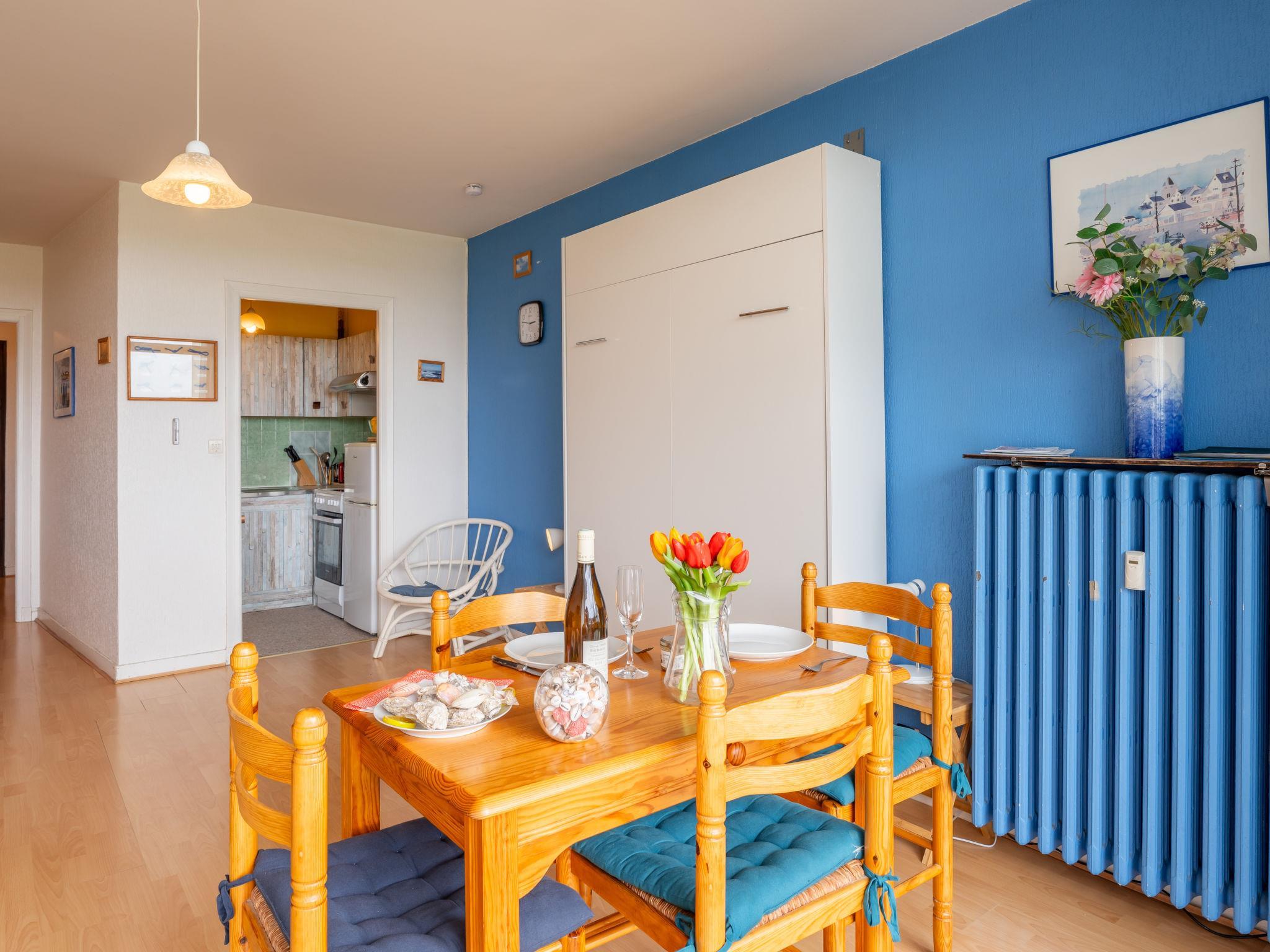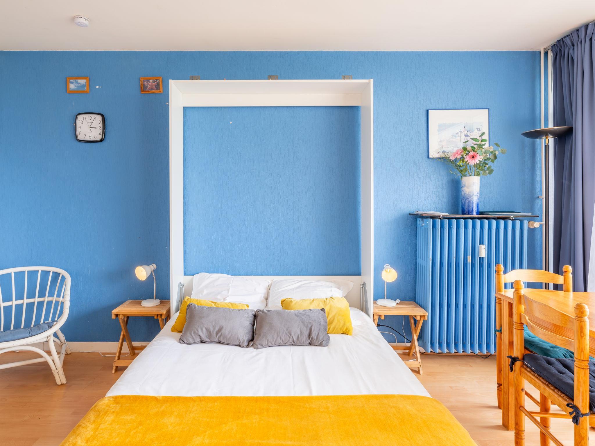 1-room studio 34 m2, on the ground floor. Comfortable furnishings: living/dining room with 1 double fold-away bed (1 x 140 cm, length 200 cm), TV (flat screen). Exit to the balcony. Kitchenette (oven, dishwasher, 3 induction hot plates, toaster, kettle, microwave, electric coffee machine). Shower/WC. Gas heating. Balcony 6 m2. Beautiful view of the sea. Facilities: washing machine. Internet (WiFi, extra). Parking. Please note: non-smokers only. 1 small pet/ dog allowed. Smoke alarm. Offer by a private individual according to Art. 155, IV of CGI. 56186 000800 SX