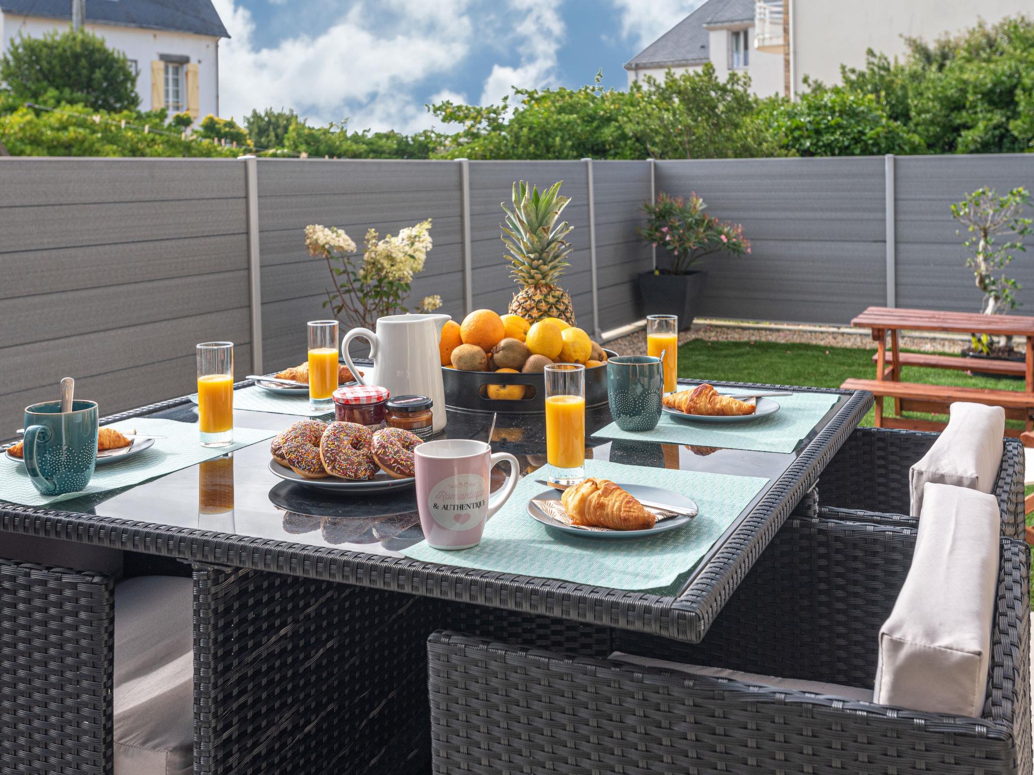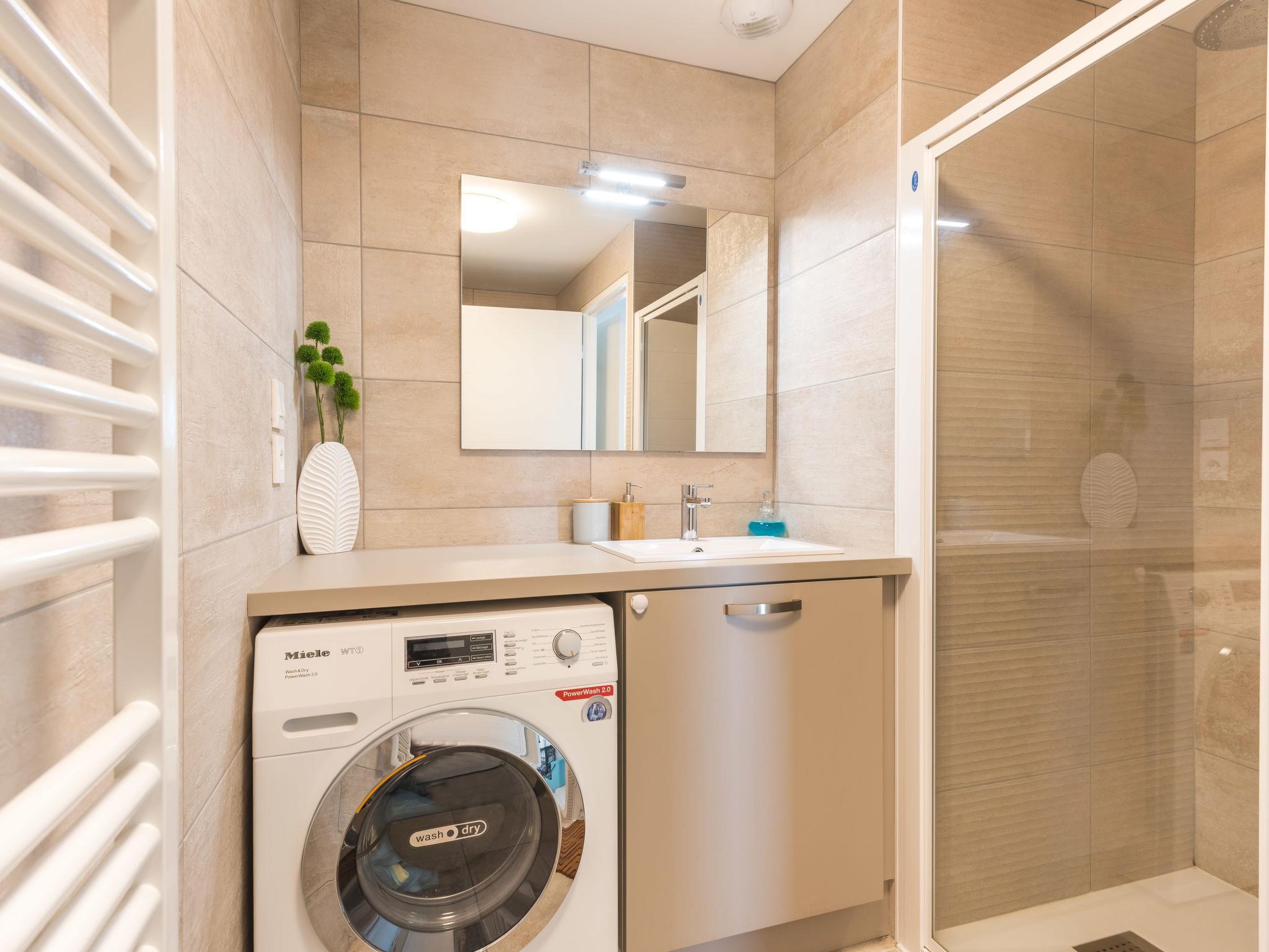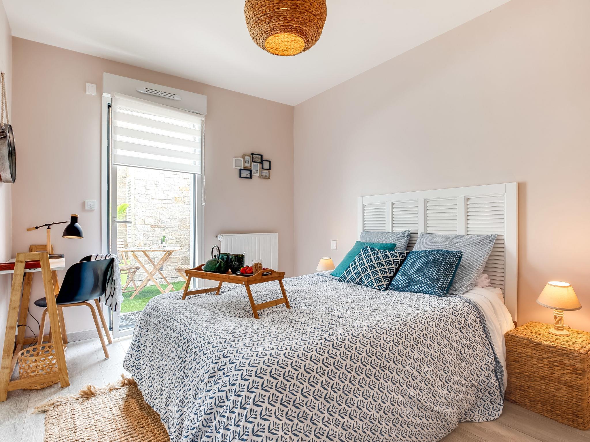 "Les Terrasses de la Plage", 3-room apartment 61 m2, on the ground floor. Very modern furnishings: living/dining room with TV (flat screen), electric shutters. Exit to the patio. 1 room with 1 x 2 bunk beds (90 cm, length 190 cm). 1 room with 1 double bed (1 x 140 cm, length 190 cm), bathroom. Exit to the terrace. Open kitchen (oven, dishwasher, 3 induction hot plates, freezer, electric coffee machine, combination microwave). Shower, sep. WC. Electric heating. Terrace 12 m2, garden 35 m2. Terrace furniture. Facilities: washing machine, dryer, iron, baby cot, hair dryer. Internet (WiFi). Garage (1 car). Please note: smoke alarm. 56186 000572 P5