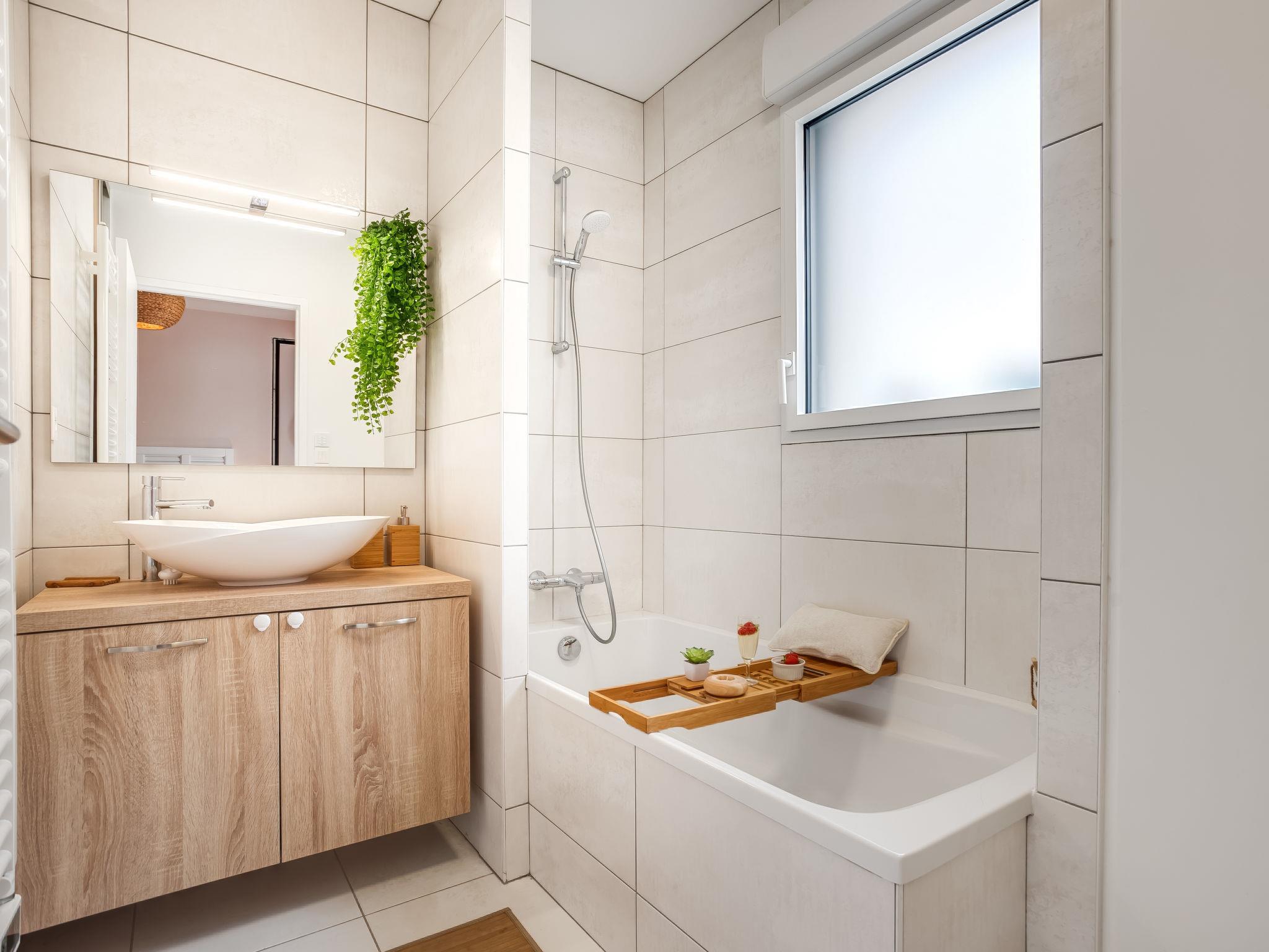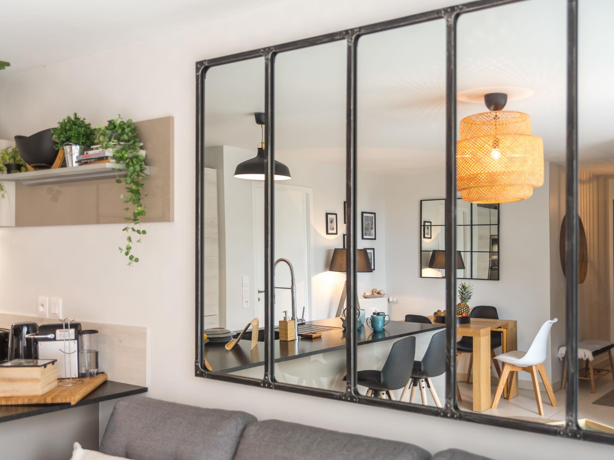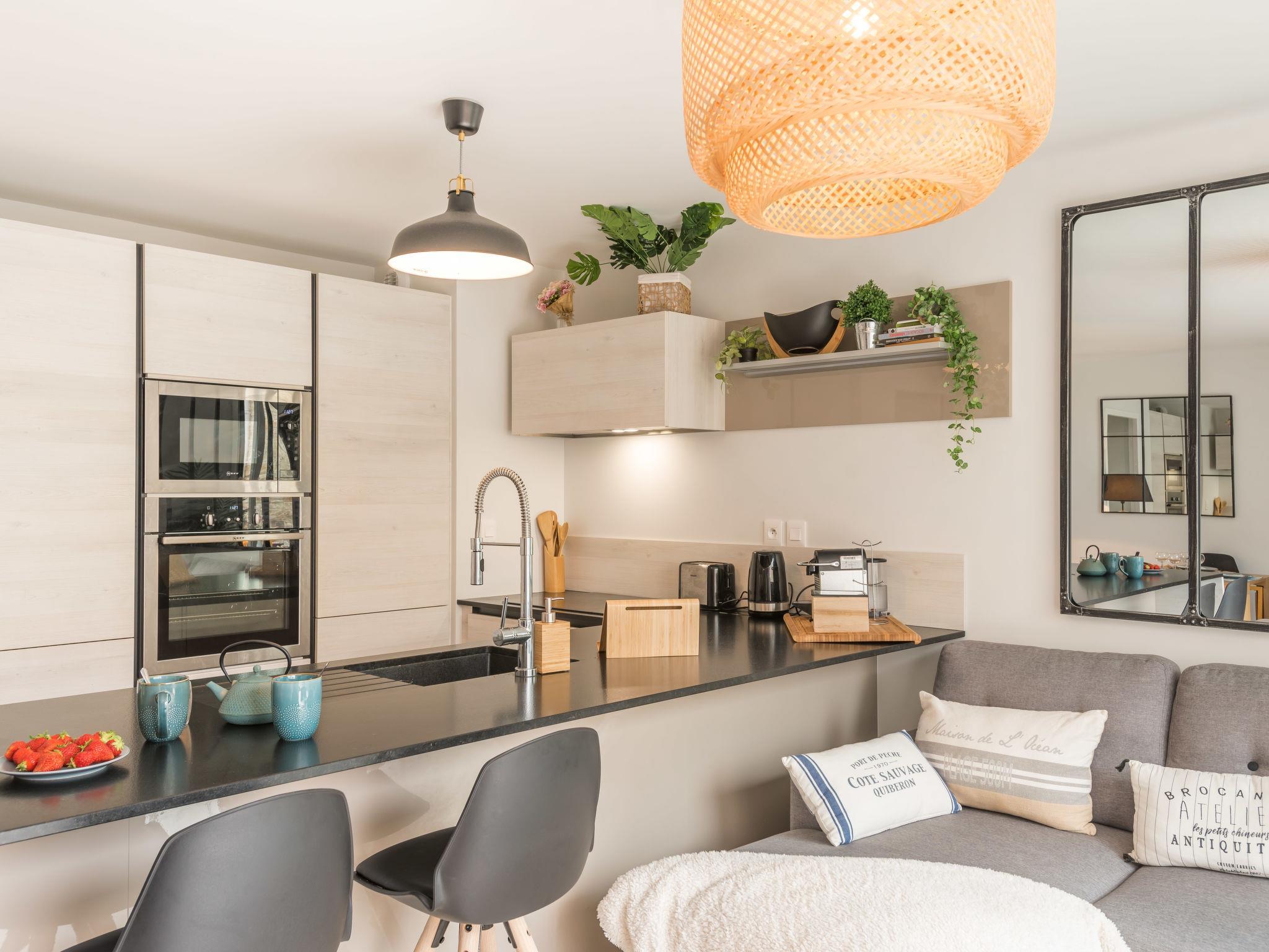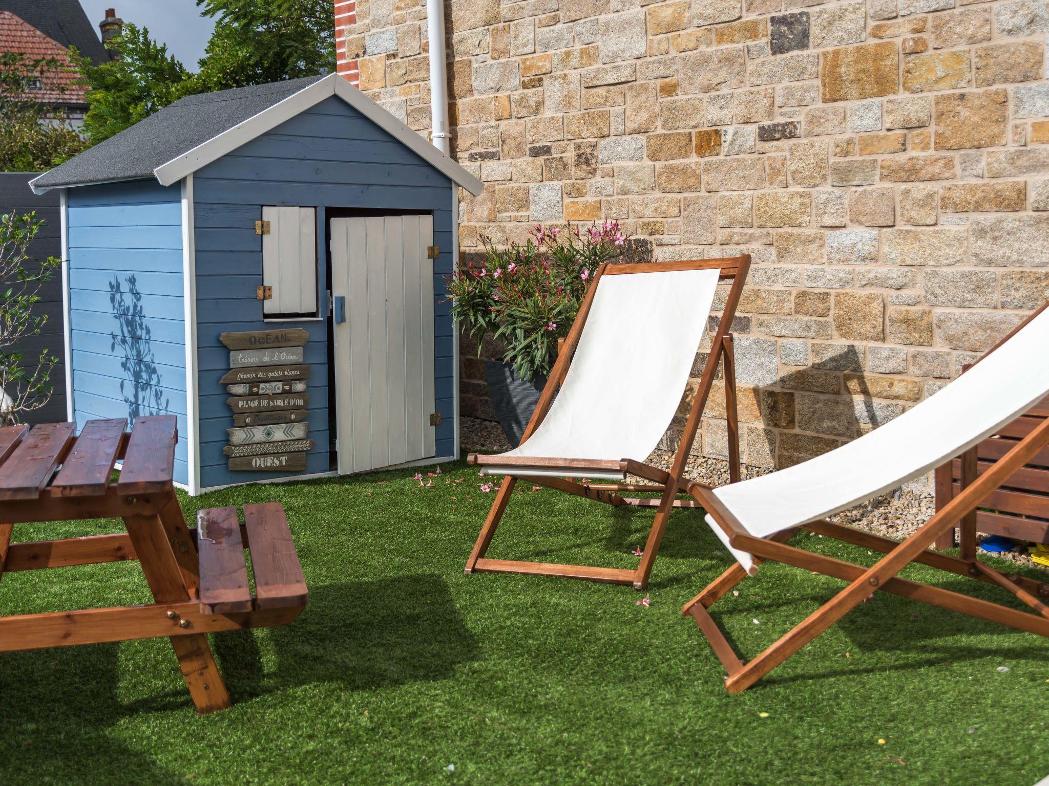 "Les Terrasses de la Plage", 3-room apartment 61 m2, on the ground floor. Very modern furnishings: living/dining room with TV (flat screen), electric shutters. Exit to the patio. 1 room with 1 x 2 bunk beds (90 cm, length 190 cm). 1 room with 1 double bed (1 x 140 cm, length 190 cm), bathroom. Exit to the terrace. Open kitchen (oven, dishwasher, 3 induction hot plates, freezer, electric coffee machine, combination microwave). Shower, sep. WC. Electric heating. Terrace 12 m2, garden 35 m2. Terrace furniture. Facilities: washing machine, dryer, iron, baby cot, hair dryer. Internet (WiFi). Garage (1 car). Please note: smoke alarm. 56186 000572 P5