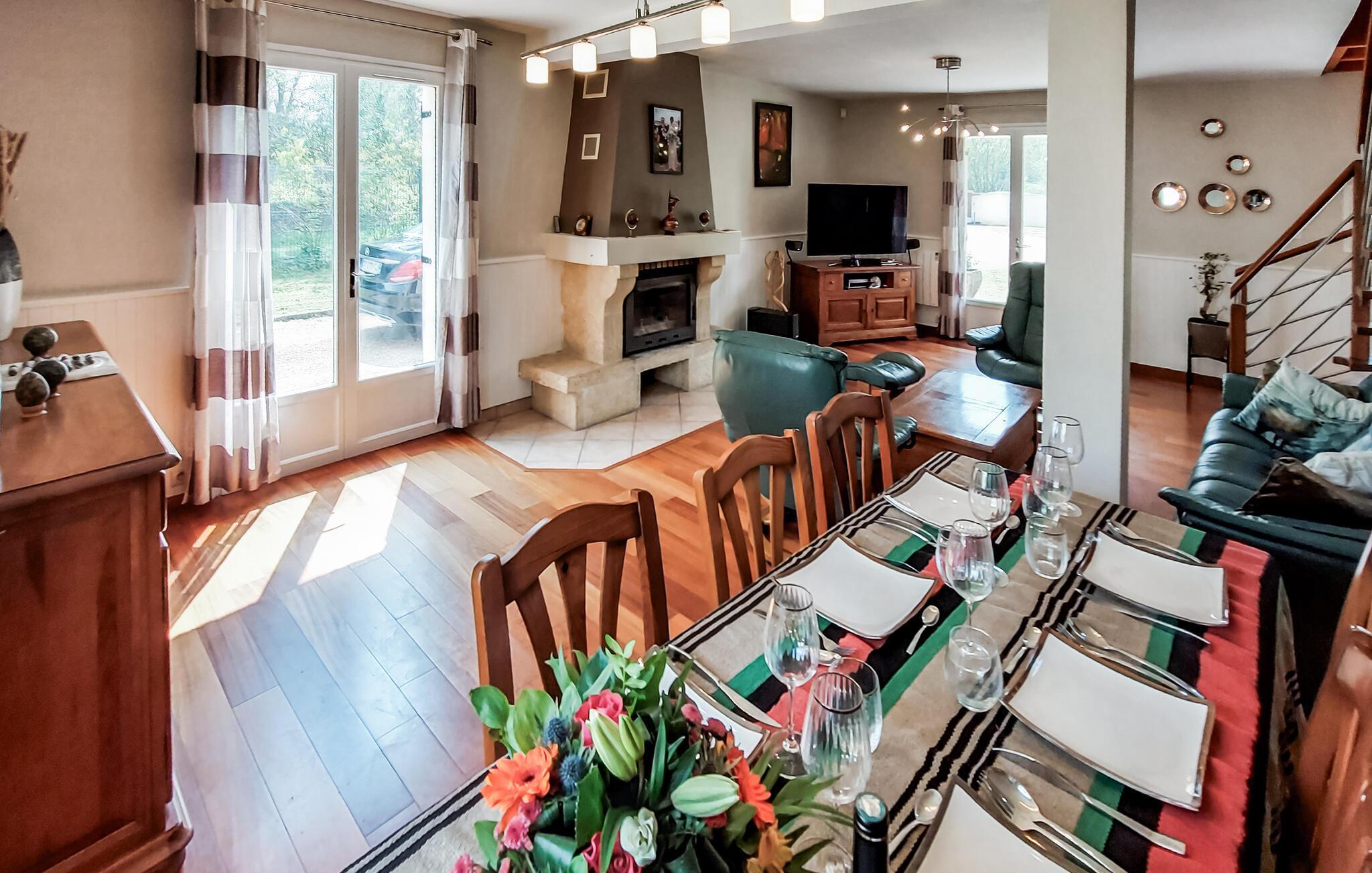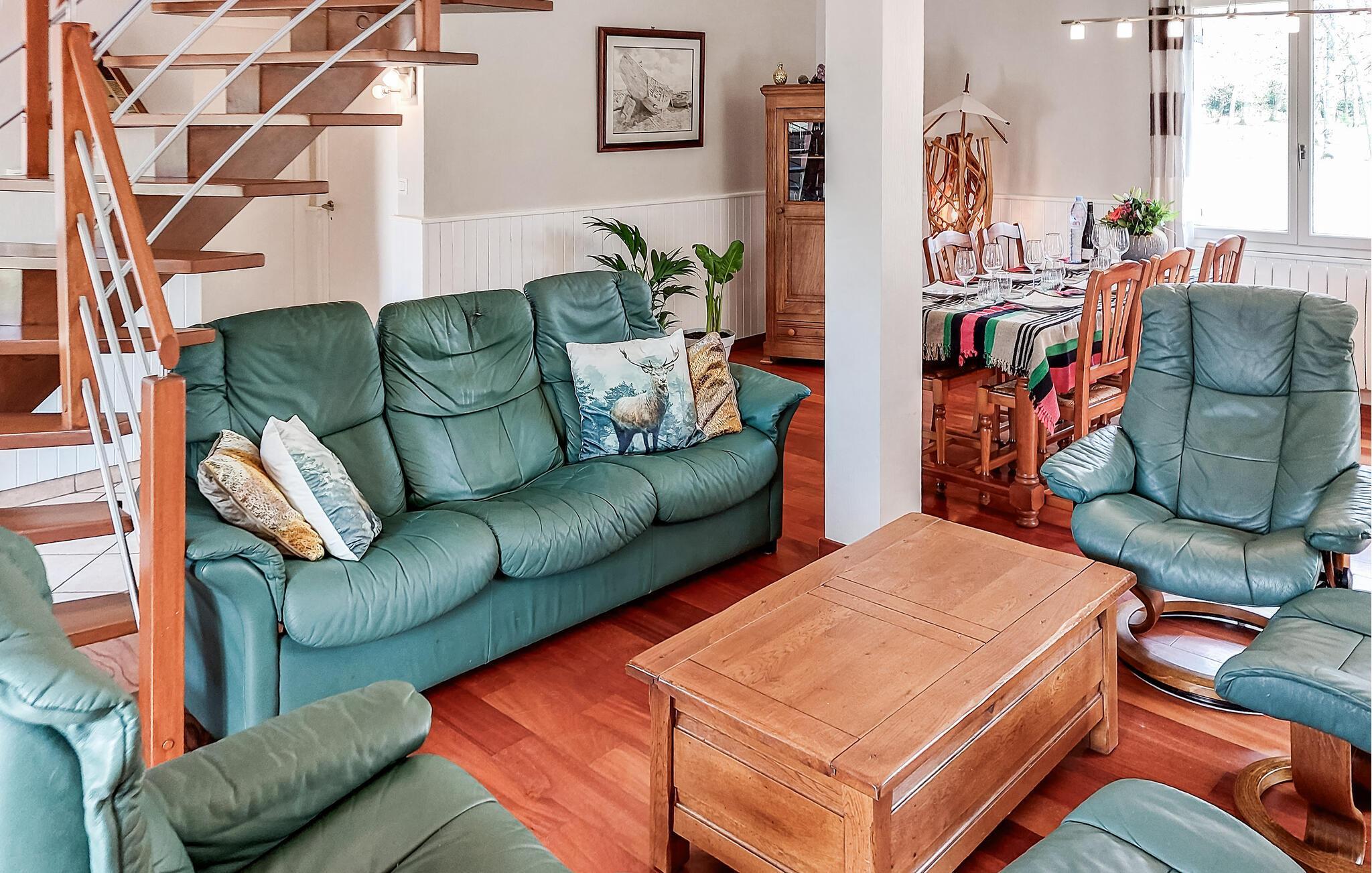 Genießen Sie Ihren Urlaub in diesem Ferienhaus, das viel Ruhe und Platz für gemeinsame Zeit bietet. Die Unterkunft liegt eingebettet in eine grüne Landschaft mit direktem Zugang zur Natur. Machen Sie es sich im gemütlichen Wohnbereich gemütlich. Die Raumgestaltung schafft ein angenehmes, wohnliches Ambiente. Entspannen Sie in den Sesseln oder auf dem Sofa am Kamin oder versammeln Sie sich am langen Esstisch für gesellige Abende und bereiten Sie Ihre Mahlzeiten in der großzügigen Essküche zu.