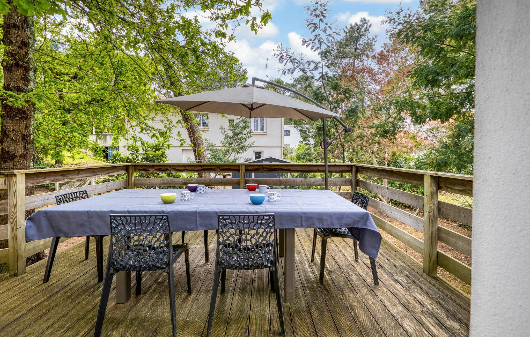 Genießen Sie die Sonne auf der Terrasse und verbringen Sie schöne Stunden im Freien umgeben von Bäumen. Bereiten Sie alles für ein leckeres Abendessen vom Grill vor.