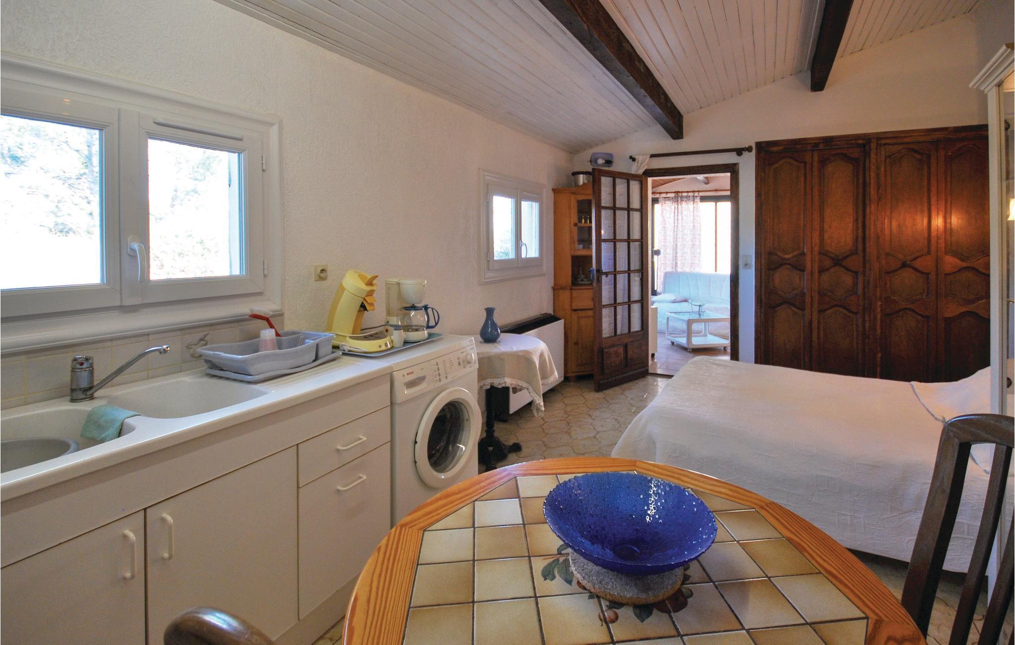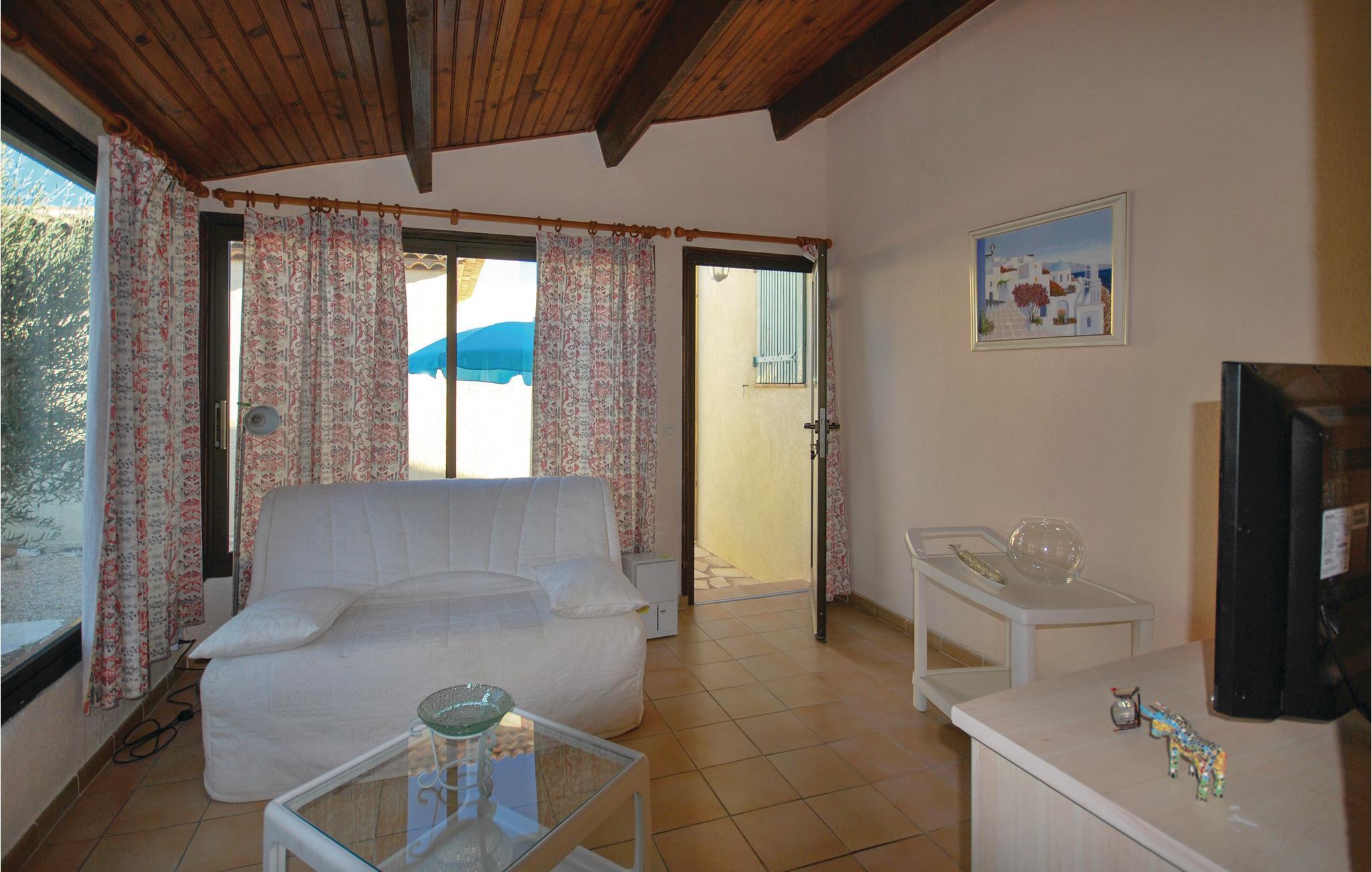 Ihre einfache Ferienwohnung im Erdgeschoss eignet sich gut für ein Paar oder Alleinreisende, die eine ruhige Basis für Erkundungen im Var suchen. Das Haus bietet eine angenehme Kombination aus Privatsphäre und gemeinschaftlich genutzten Außenbereichen. Im hellen Wohnzimmer mit gemütlichem Sofa und Fernseher sorgt die große Fensterfront für viel Tageslicht und gibt den Blick auf den kleinen Vorplatz frei. Nutzen Sie die kompakte Ausstattung für einfache Mahlzeiten oder erholen Sie sich nach einem langen Ausflugstag bei einem Film oder einem Buch. Die Holzbalkendecke verleiht dem Raum eine warme Atmosphäre.