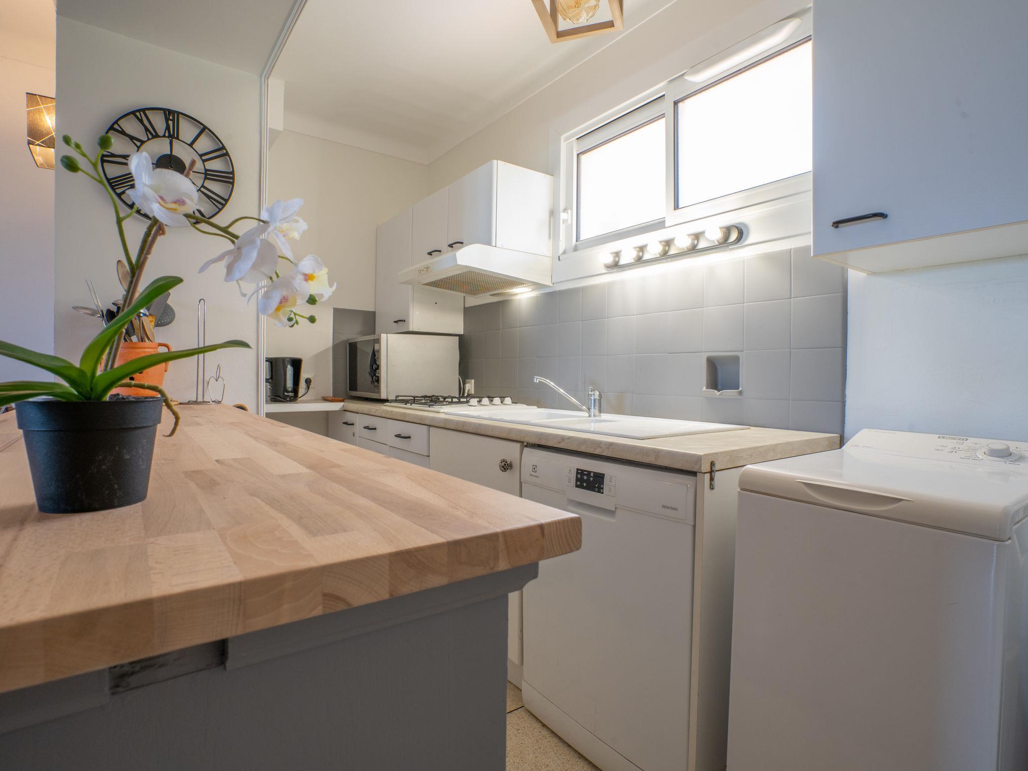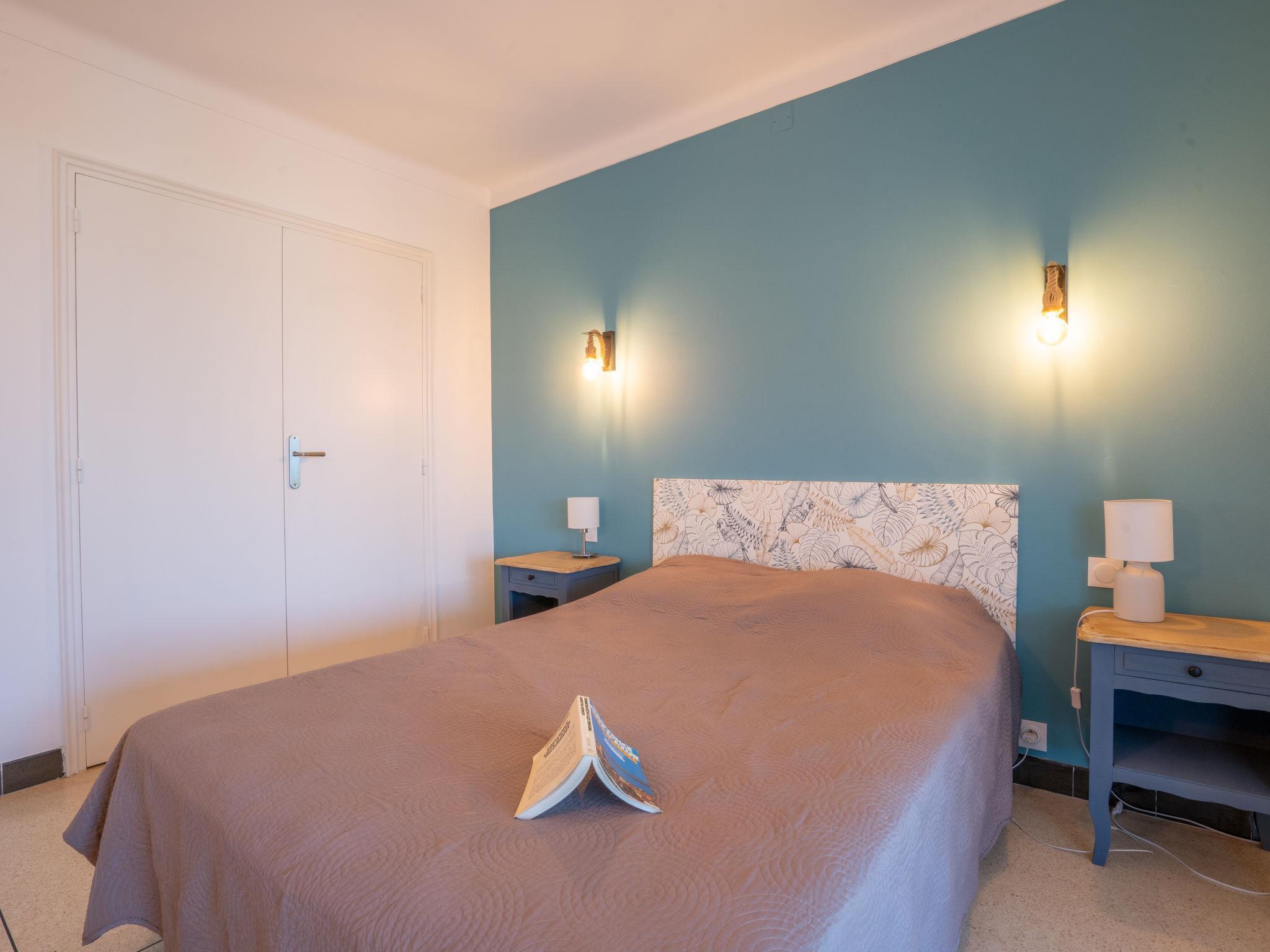 2-room apartment 48 m2, on the upper ground floor, east facing position. Renovated in 2022, beautiful furnishings: living/dining room with 1 double sofabed (1 x 140 cm, length 190 cm), TV and fan. Exit to the terrace. 1 room with 1 french bed (1 x 140 cm, length 190 cm), fan. Exit to the terrace. Kitchenette (dishwasher, 4 gas rings, toaster, kettle, freezer, electric coffee machine, Capsules for coffee machine (Dolce Gusto) extra, combination microwave). Shower/WC. Heating. Terrace 13 m2, patio 50 m2. Terrace furniture, deck chairs (2). View of the sea. Facilities: washing machine, iron, hair dryer. Internet (WiFi, extra). Parking. Please note: suitable for families. TV only FR. Smoke alarm. 8310700021260