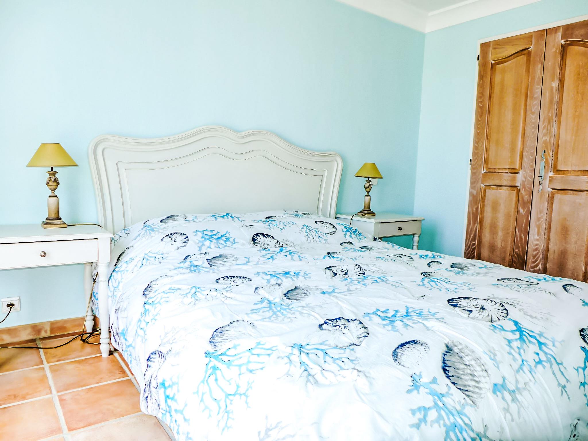 5-room terraced house 130 m2 on 3 levels. Comfortable and beautiful furnishings: living/dining room with TV (flat screen), air conditioning. Exit to the garden, to the terrace. Open kitchen (oven, dishwasher, 4 ceramic glass hob hotplates, toaster, kettle, microwave, freezer, electric coffee machine). Sep. WC. Upper floor: 1 room with 1 french bed (1 x 160 cm, length 200 cm), fan. Exit to the balcony. 1 room with 1 french bed (1 x 160 cm, length 200 cm), shower/WC. Bathroom. 2nd upper floor: 1 room with 1 french bed (1 x 160 cm, length 200 cm), shower/WC and fan. 1 room with 1 french bed (1 x 160 cm, length 200 cm), shower/WC. Exit to the terrace. Balcony 2 m2, terrace 9 m2, roofed terrace 18 m2, roofed, patio 40 m2. Terrace furniture, barbecue, deck chairs (2). View of the sea. Facilities: washing machine, iron, hair dryer. Internet (WiFi, free). Please note: 1 pet/ dog allowed. Smoke alarm. 83107000272MM