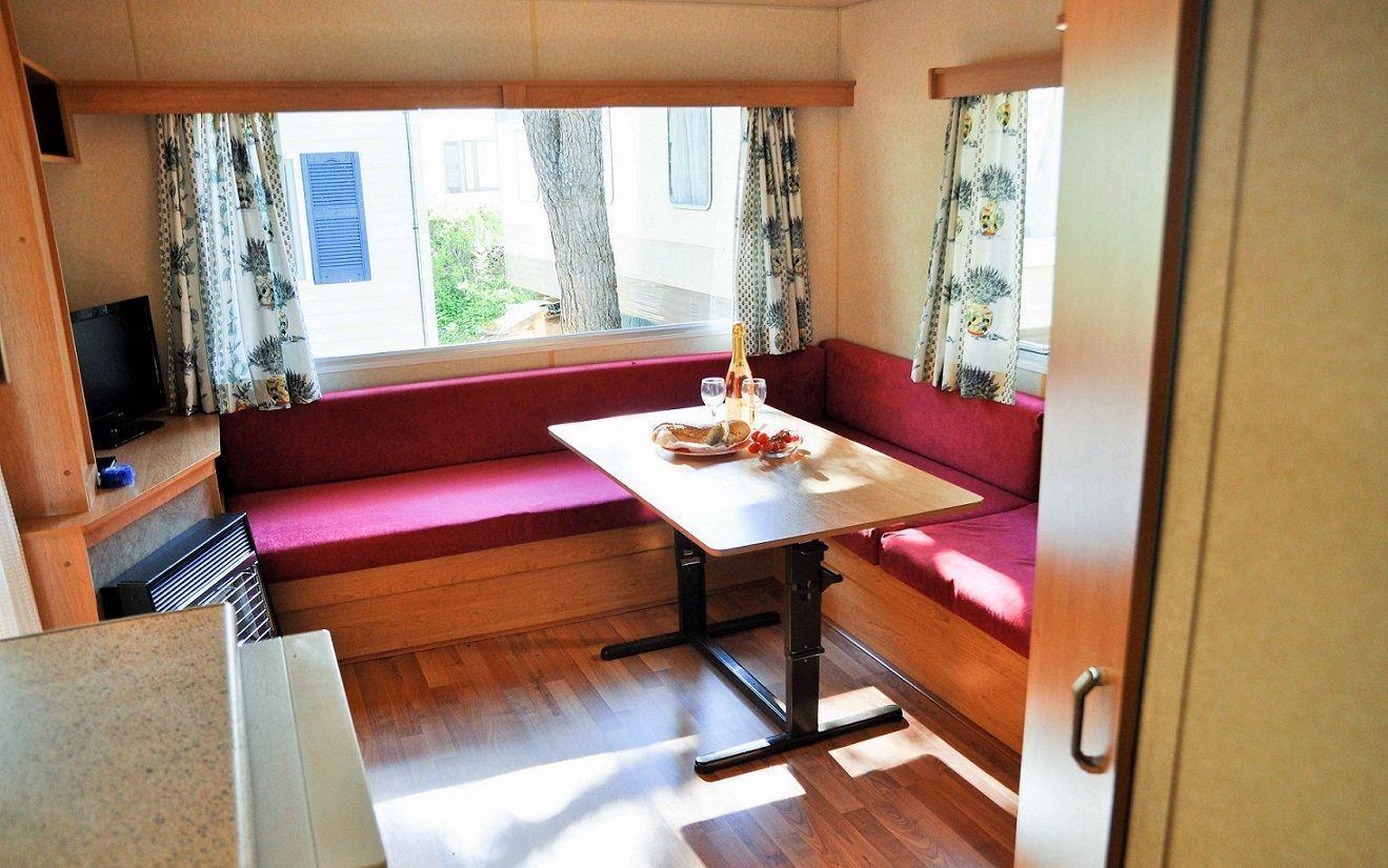 The inside of the mobile homes is carefully decorated to meet all needs; from a private bathroom with shower, toilet and sink to a fully equipped open kitchen in the living room. There are two bedrooms: one with a double bed and one with three beds. All necessary kitchen utensils, a coffee machine, cooking pots, plates, and glasses are provided, along with continental quilts and pillows for a comfortable night's sleep.