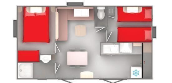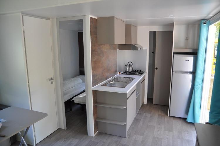 This is a description of one of the homes to also give you an idea of the several other mobile homes on the campground. The mobile homes each feature around 35 m² of living space comprising: living room with a sofa bed that can sleep two persons, dining area overlooking the veranda, bedroom furnished with a double bed, fully equipped kitchen with, among other things, gas cooker, microwave, coffee machine and fridge complete with freezer compartment. Each home features a bathroom with a shower, wash basin and toilet. On request, a bed and highchair can be provided for small children. There is a parking space available next to each mobile home.